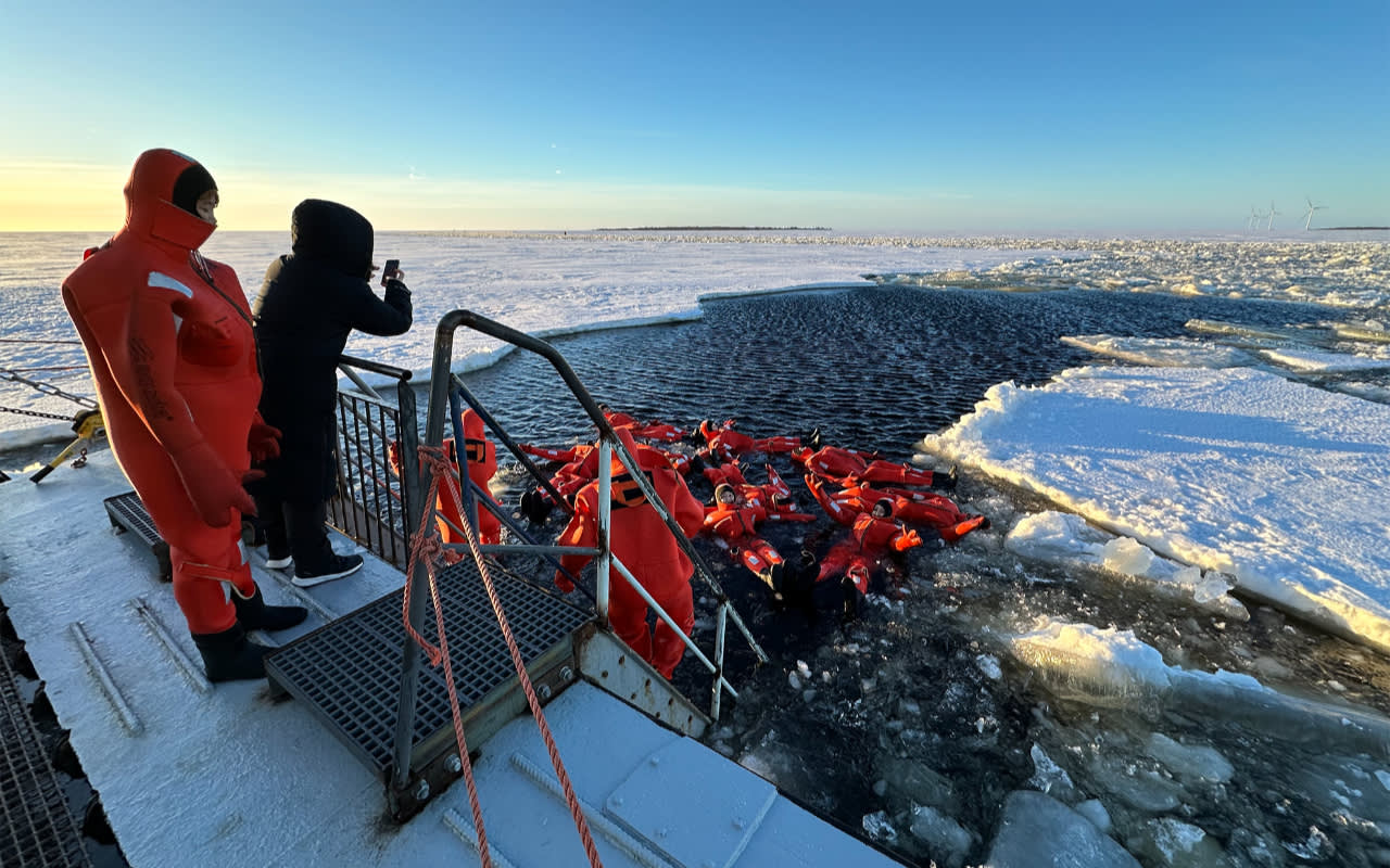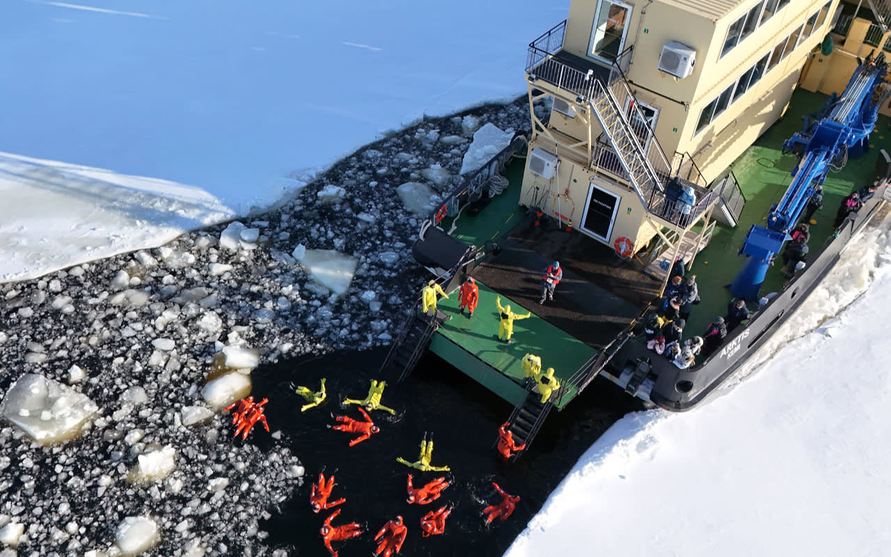 * 얼어붙은 바다 위에서 보온 생존복을 입고 얼음물에 안전하게 떠 있어 보세요.
