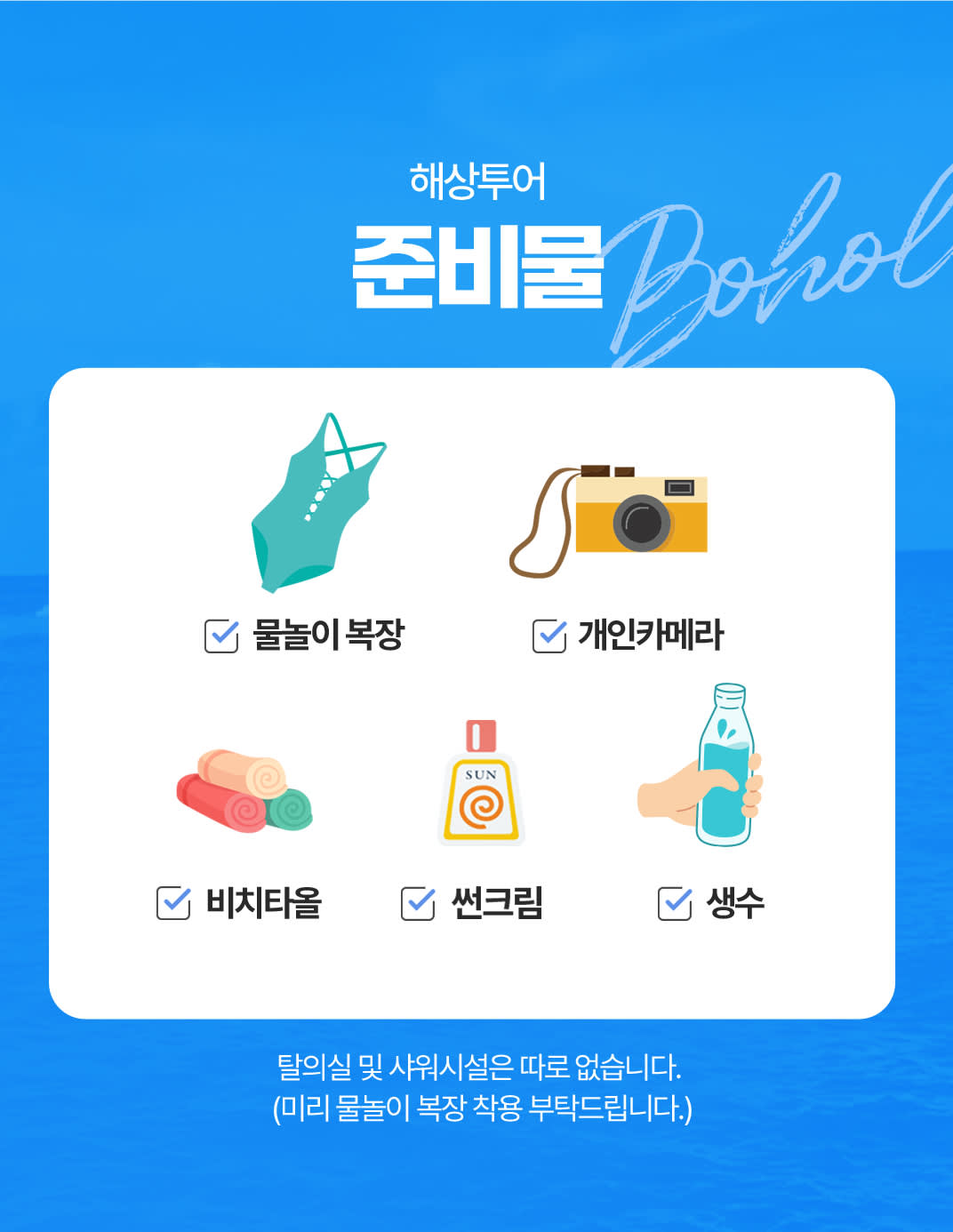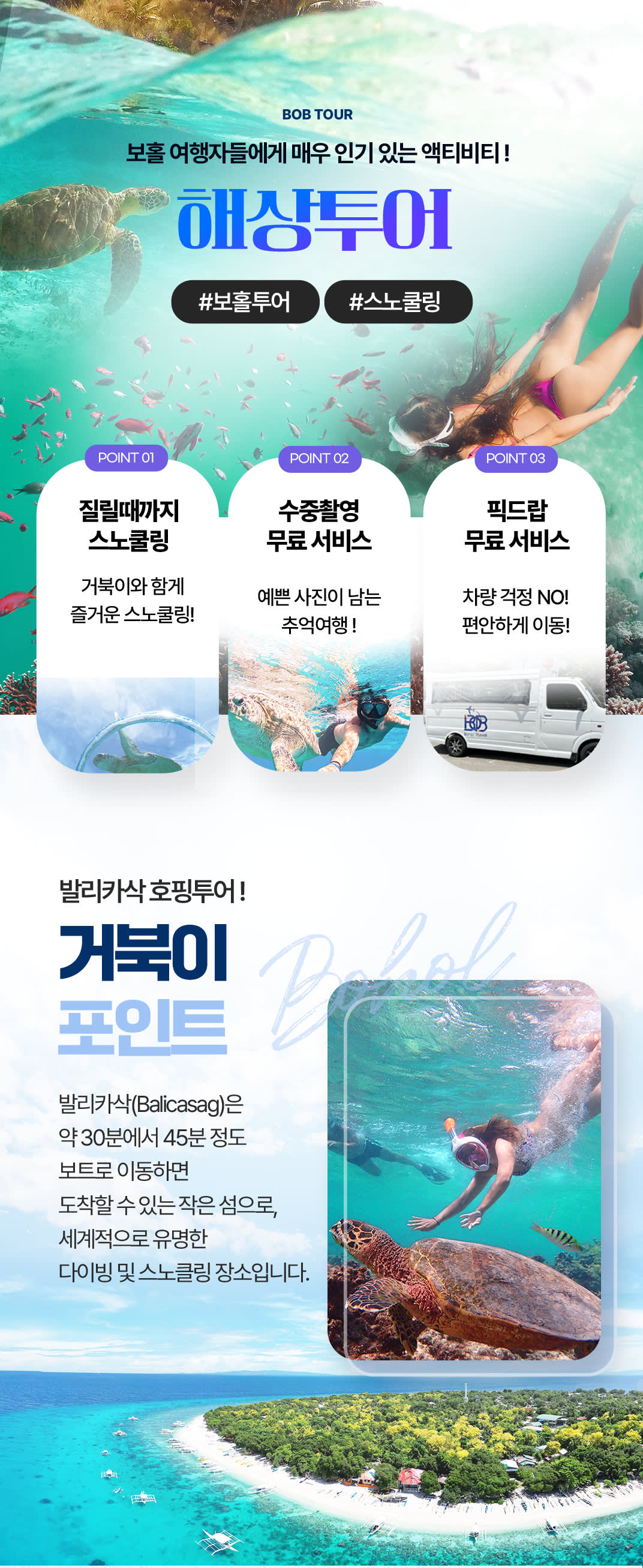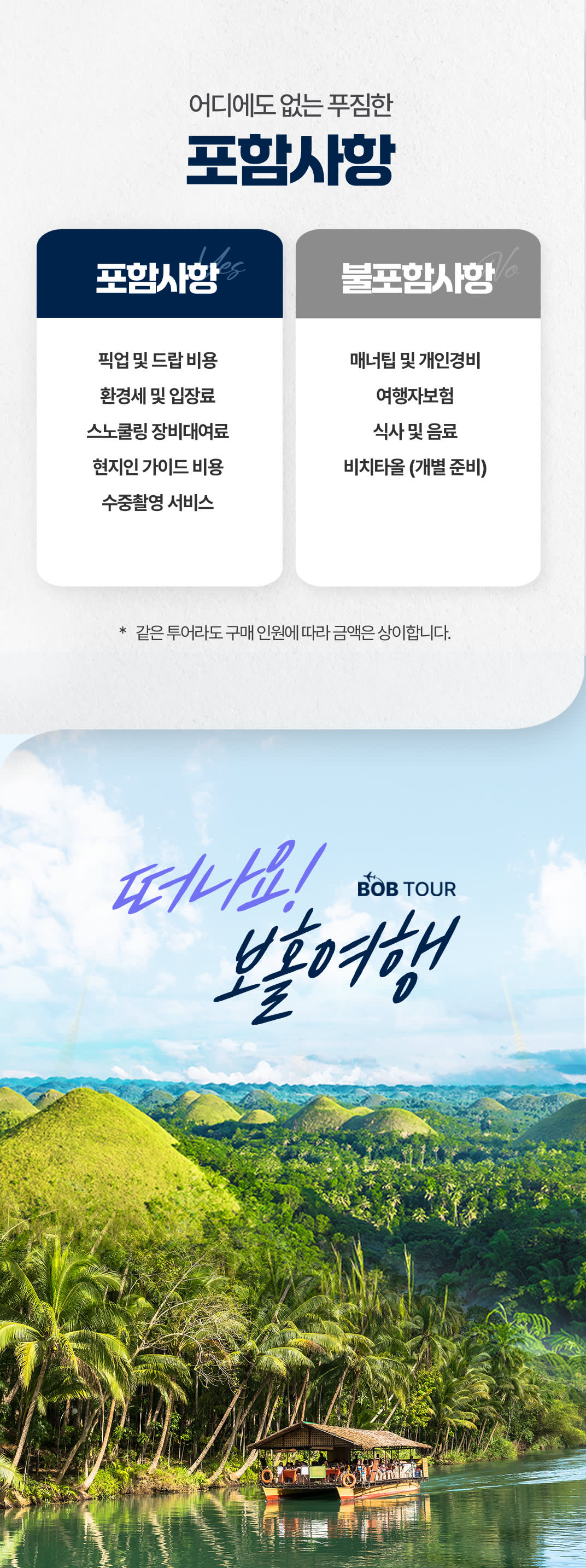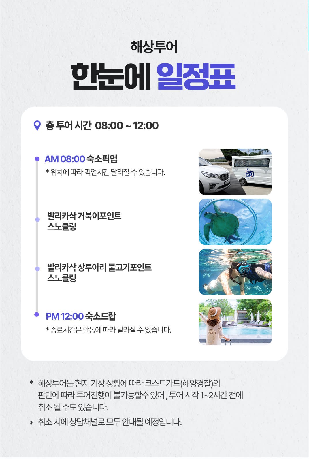 * 여행 시 여행자보험은 꼭 가입 부탁드립니다. * 최소 2인부터 투어 진행이 가능합니다. * 최소 2일전 예약을 진행 해주셔야 투어진행이 가능합니다. * 해상에서 진행 되는 모든 투어에는 스노클 장비 / 고프로 촬영 서비스 포함 상품입니다. * 모든 투어 픽업은 예약 시 작성해주신 리조트로 픽업해드립니다. (본 상품은 팡라오 섬 전지역 , 공항 픽업&드랍으로 진행됩니다. 보홀 본섬 탁빌라란 지역은 픽업 및 드랍 추가비용이 발생합니다.) *해상투어는 현지 기상 상황에 따라 코스트가드(해양경찰)의 판단에 따라 투어진행이 불가능할 수 있어, 투어 시작 1~2시간전에 취소 될 수도 있습니다. *탈의실 및 샤워시설은 따로 없습니다.(미리 물놀이 복장 착용 부탁드립니다.) *같은 투어라도 구매 인원에 따라 금액은 상이합니다. <해상투어> * 호흡기 질환 및 수술 경험이 있으신 분은 투어 진행이 어렵습니다. * 보청기 및 귀마개 착용을 하셔야 하는 분은 안전 상의 이유로 투어 진행이 어렵습니다. * 수상 액티비티로 전신 질환, 육체적, 정신적 컨디션이 좋지 않은 분은 이용에 주의해주시기 바라며 예약 시 문의해주셔야 합니다. * 구명조끼 착용이 필수이며 담당가이드님이 없는 곳에서 개별 행동을 피해주시기 바랍니다. * 숙취가 있으시거나 당일 음주를 하신 분은 참가할 수 없습니다. * 당일 건강 상태에 따라 건강에 위험요소가 있다고 판단되는 경우 참가하실 수 없습니다. * 발리카삭 섬에는 사워시설이 구비되어있지 않습니다. * 수중촬영 영상 및 사진 파일은 투어 종료 후 구글드라이브 업로드 후 개설된 그룹방을 통해 구글드라이브 링크로 전달드리고있습니다. * 수중촬영의 경우 고프로의 고장 및 이상으로 사진 및 영상이 제대로 나오지 않는경우가 간혹 있습니다. 수중촬영 부분은 서비스로 제공드리는 부분이며 개인 영상 촬영용 카메라를 담당가이드님에게 전달드려 촬영 서비스도 가능 하십니다. <차량안내> 이노바(SUV) - 2인 까지 밴(VAN) - 3인부터 카시트 - 없음 캐리어 및 짐보관 - 가능 <여행자보험> 개별 여행자 보험 가입을 권유드립니다.
