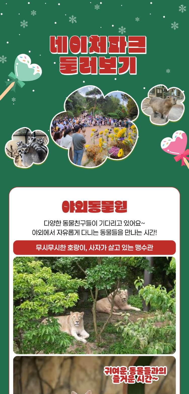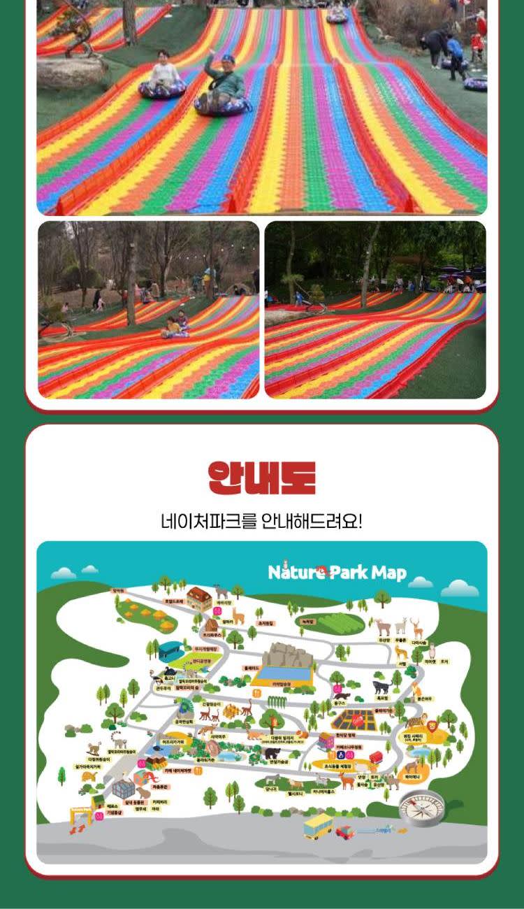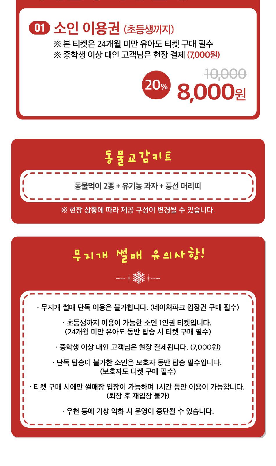 [이용 정보] * 판매기간 : ~ 2026.03.02 * 유효기간 : ~ 2026.03.02 [사용 방법] 유의사항 * 퀵보드, 자전거,스케이트 등의 놀이기구 반입은 불가합니다. * 동물들의 건강 관리를 위해 외부 먹이 반입은 불가합니다. * 본 티켓으로 단체 입장은 불가하며 단체 구매는 현장 문의 바랍니다. * 본 티켓을 개인 거래 등을 통하여 재판매 시 불이익을 받으실 수 있습니다. 사계절 무지개 썰매 이용 유의사항 * 무지개 썰매 단독 이용은 불가합니다.(네이처파크 입장권 구매 필수) * 초등생까지 이용이 가능한 소인 1인권 티켓입니다. (24개월 미만 유아도 동반 탑승 시 티켓 구매 필수) * 중학생 이상 대인 고객님은 현장 결제됩니다. (7,000원) * 단독 탑승이 불가한 소인은 보호자 동반 탑승 필수입니다. (보호자도 티켓 구매 필수) * 티켓 구매 시에만 썰매장 입장이 가능하며 1시간 동안 이용이 가능합니다. (퇴장 후 재입장 불가) * 우천 등에 기상 악화 시 운영이 중단될 수 있습니다. * 최소 1시간 전 구매 필수 (당일구매/당일사용 가능) * 현장 방문하여 바코드 인증 후 이용 가능