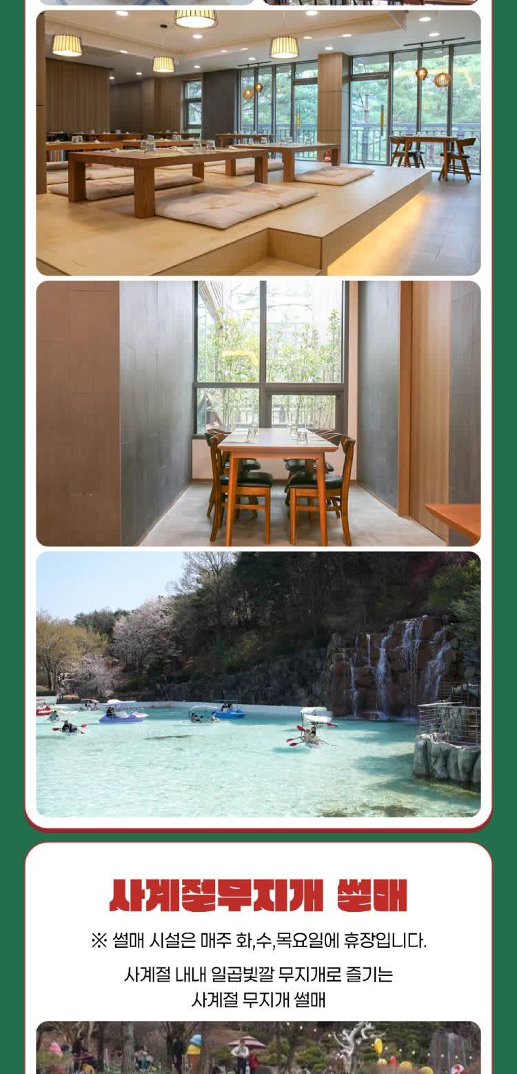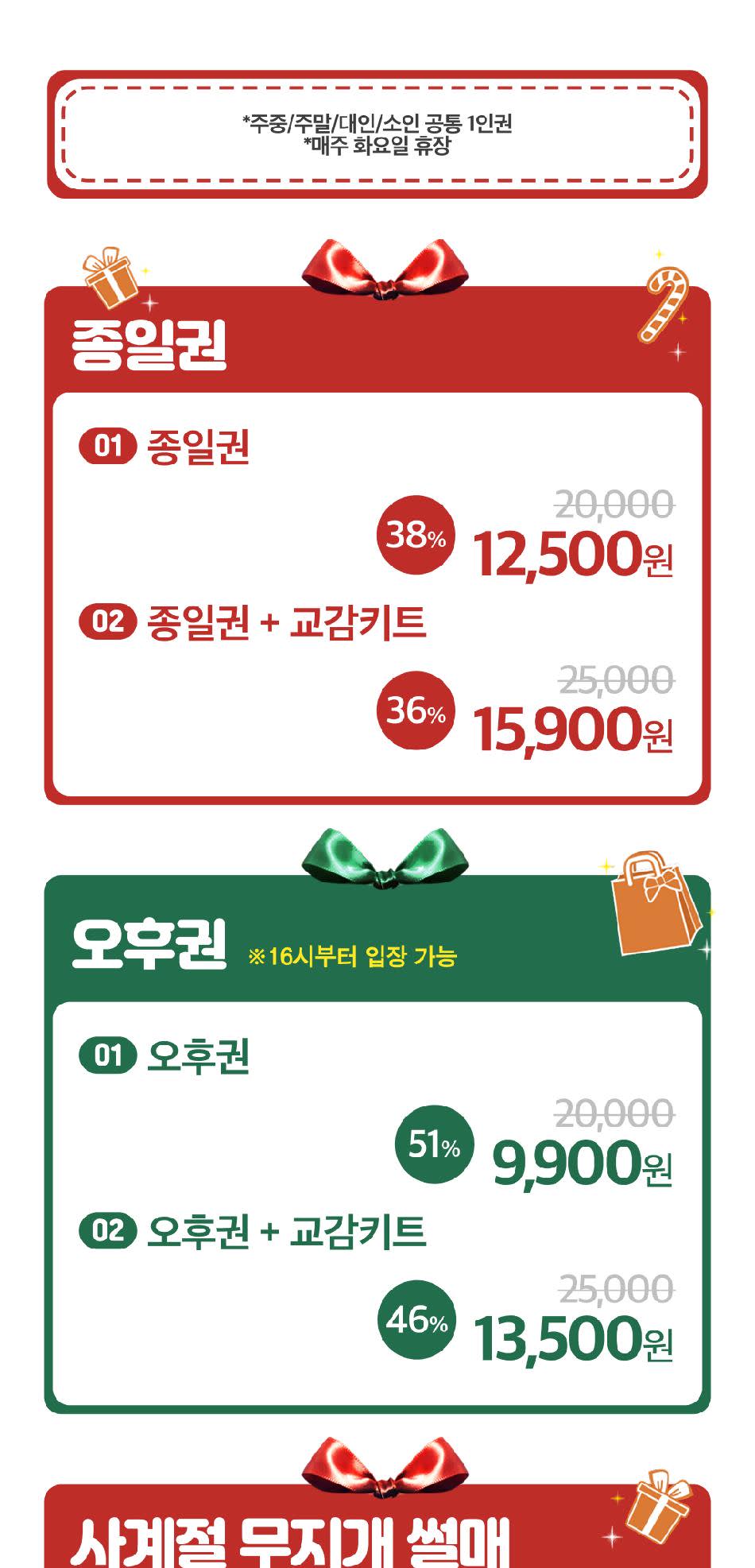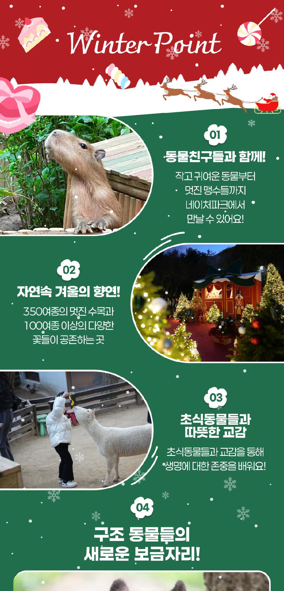 [이용 정보] * 판매기간 : ~ 2026.03.02 * 유효기간 : ~ 2026.03.02 [사용 방법] 유의사항 * 퀵보드, 자전거,스케이트 등의 놀이기구 반입은 불가합니다. * 동물들의 건강 관리를 위해 외부 먹이 반입은 불가합니다. * 본 티켓으로 단체 입장은 불가하며 단체 구매는 현장 문의 바랍니다. * 본 티켓을 개인 거래 등을 통하여 재판매 시 불이익을 받으실 수 있습니다. 사계절 무지개 썰매 이용 유의사항 * 무지개 썰매 단독 이용은 불가합니다.(네이처파크 입장권 구매 필수) * 초등생까지 이용이 가능한 소인 1인권 티켓입니다. (24개월 미만 유아도 동반 탑승 시 티켓 구매 필수) * 중학생 이상 대인 고객님은 현장 결제됩니다. (7,000원) * 단독 탑승이 불가한 소인은 보호자 동반 탑승 필수입니다. (보호자도 티켓 구매 필수) * 티켓 구매 시에만 썰매장 입장이 가능하며 1시간 동안 이용이 가능합니다. (퇴장 후 재입장 불가) * 우천 등에 기상 악화 시 운영이 중단될 수 있습니다. * 최소 1시간 전 구매 필수 (당일구매/당일사용 가능) * 현장 방문하여 바코드 인증 후 이용 가능