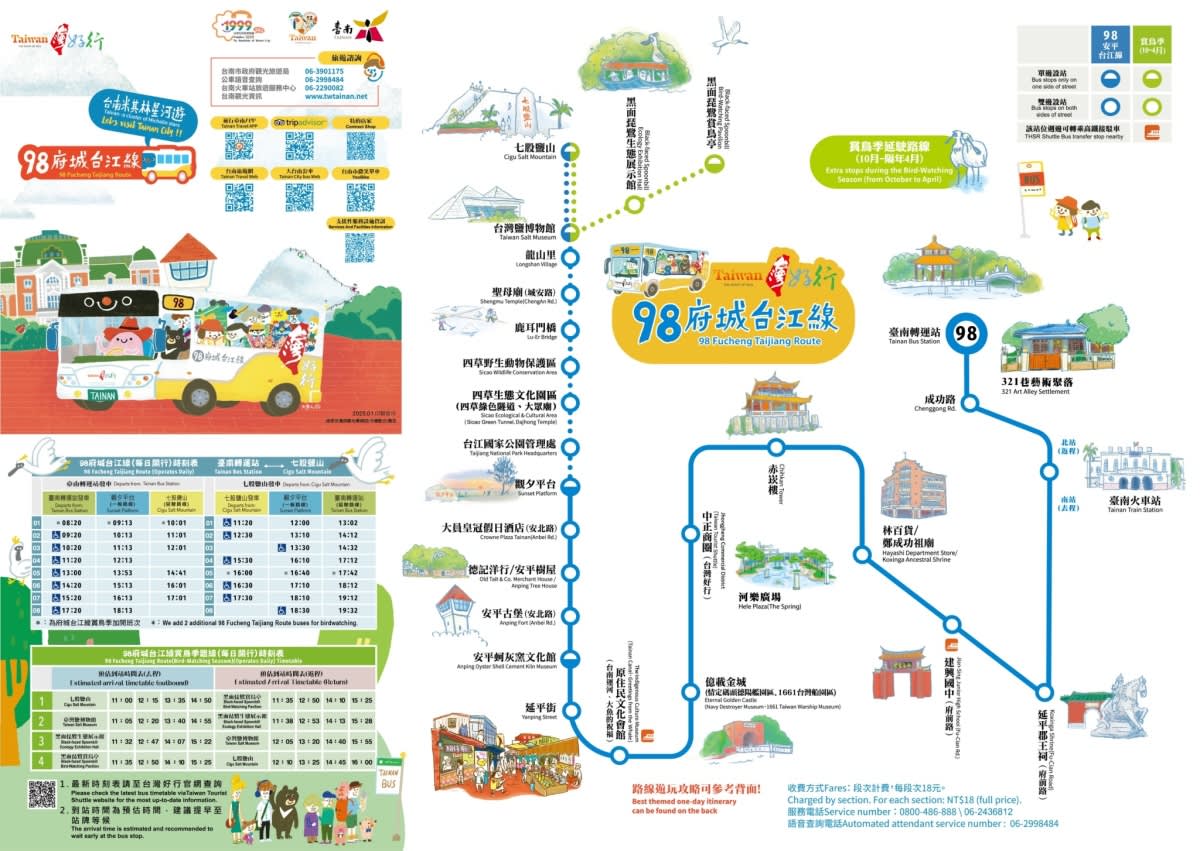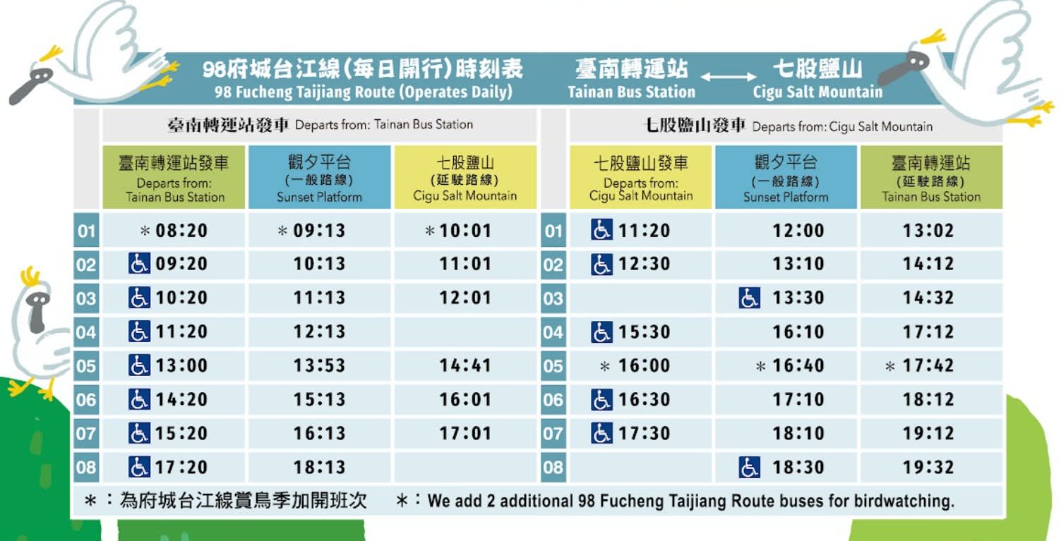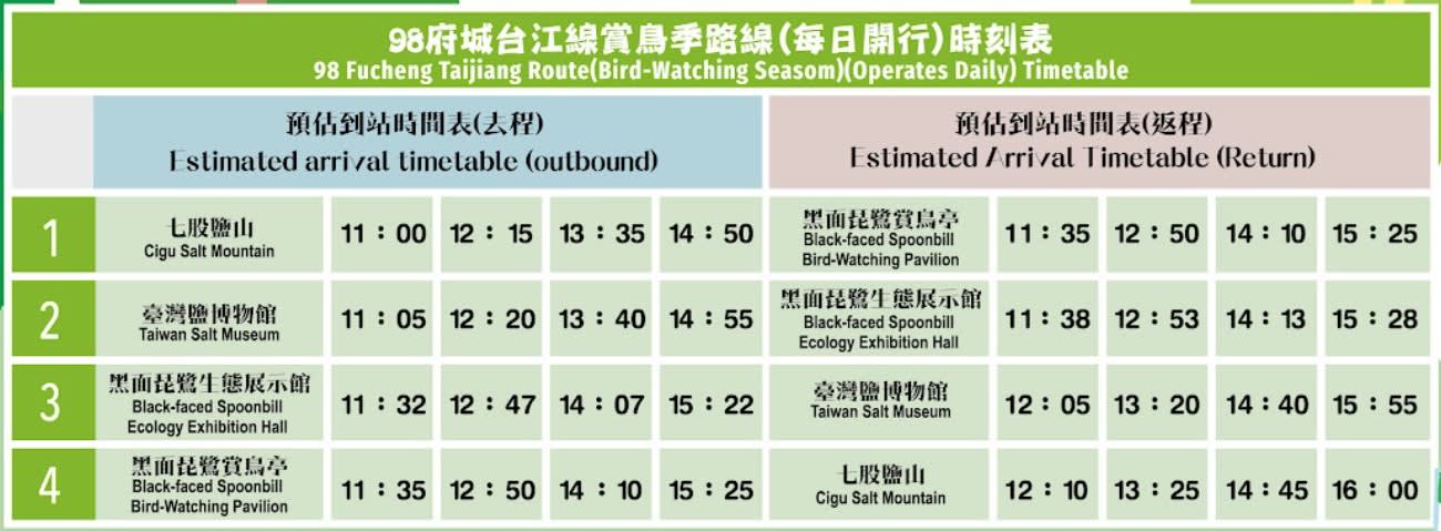 - 추가정보 * 유모차 및 휠체어 수용이 가능한 차량입니다. * 타이난 관광 셔틀버스의 운행 시간은 날씨/교통 상황에 따라 변경될 수 있습니다. 버스 회사는 버스 투어를 변경하거나 취소할 권리를 보유합니다.