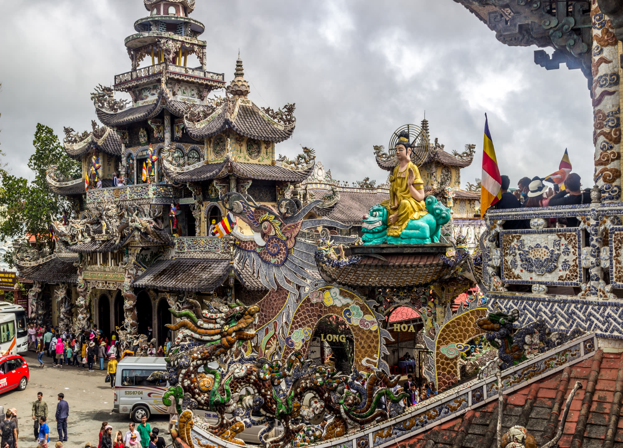 린푸억 사원은 깨진 도자기 조각으로 장식된 사원으로 베트남에서 가장 높은 종탑이 있습니다.