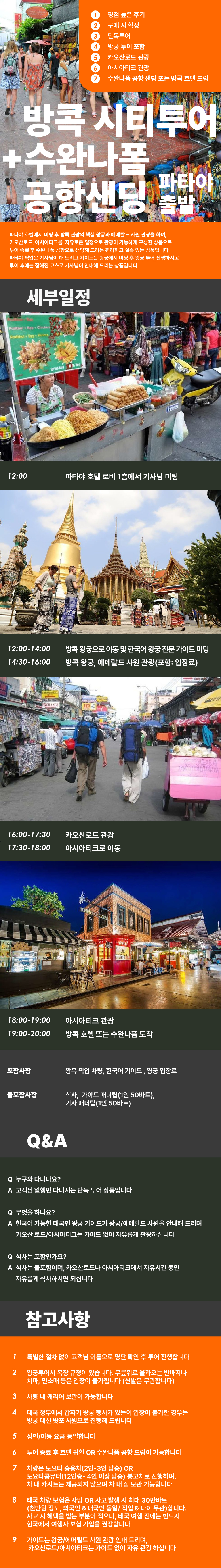 카오산 로드, 아시아티크를 자유로운 일정으로 관광이 가능하게 구성한 상품으로 투어 종료 후 수완나품 공항으로 샌딩해드리는 편리하고 실속 있는 상품입니다.