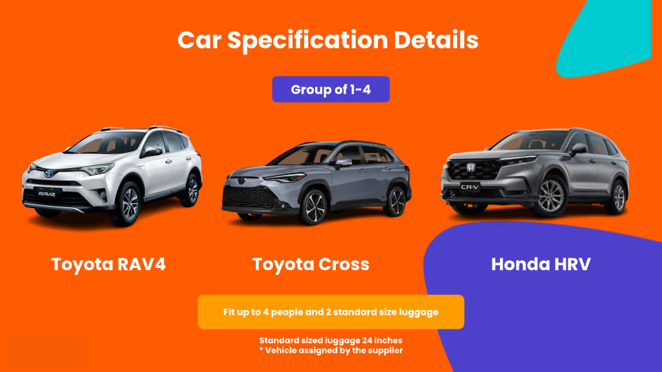 - 차량 정보 * 5인승 차량 * 차량 브랜드: Toyota 또는 동급 * 차량 모델: Wish, RAV4, Camry, Altis * 탑승객 인원수: 4인 이하 * 9인승 차량 * 차량 모델: Volkswagen T6/T5, Hyundai Starex, Ford Tourneo Custom, or similar * 탑승객 인원수: 8인 이하