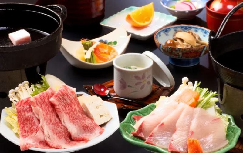 저녁식사는 방어 샤브샤브와 히다 소고기 스키야키 석식 후,