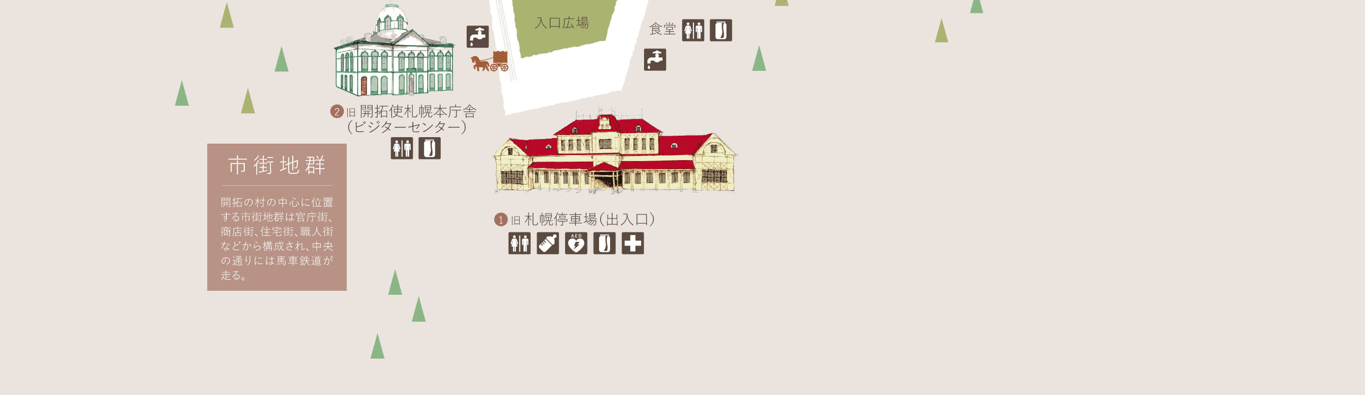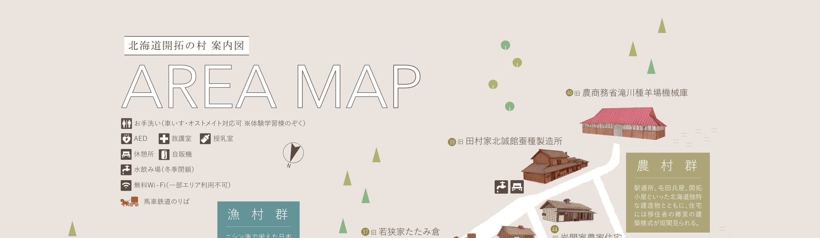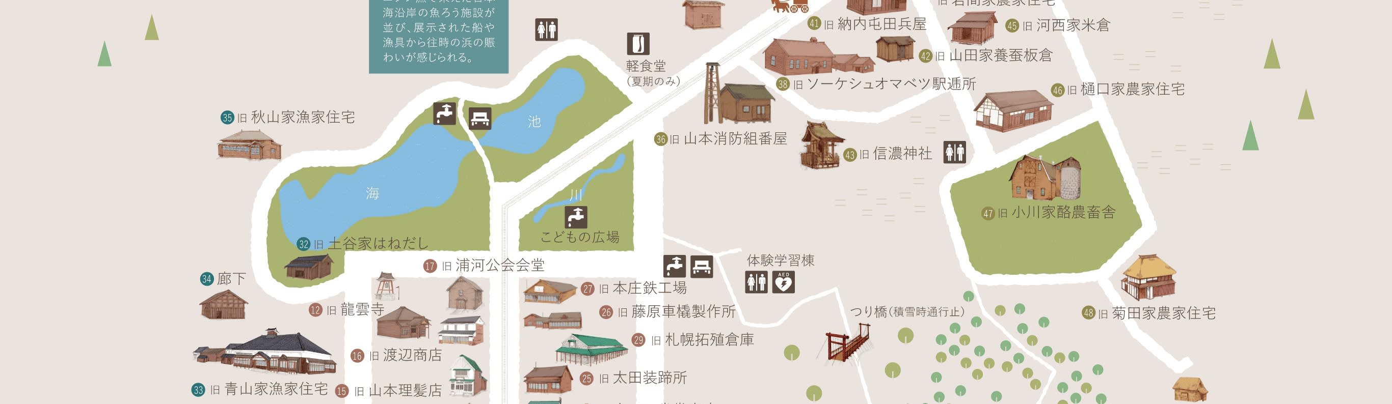 * 홋카이도 개척 시대의 모습을 재현하여 시가지, 농촌, 산촌, 어촌마다 각기 다른 건축과 생활 장면을 보여줍니다.