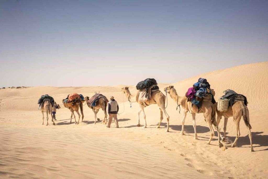 사막의 상쾌한 침묵 속에서 깨어나 캠프에서 아침을 즐긴 후 길을 떠납니다.
