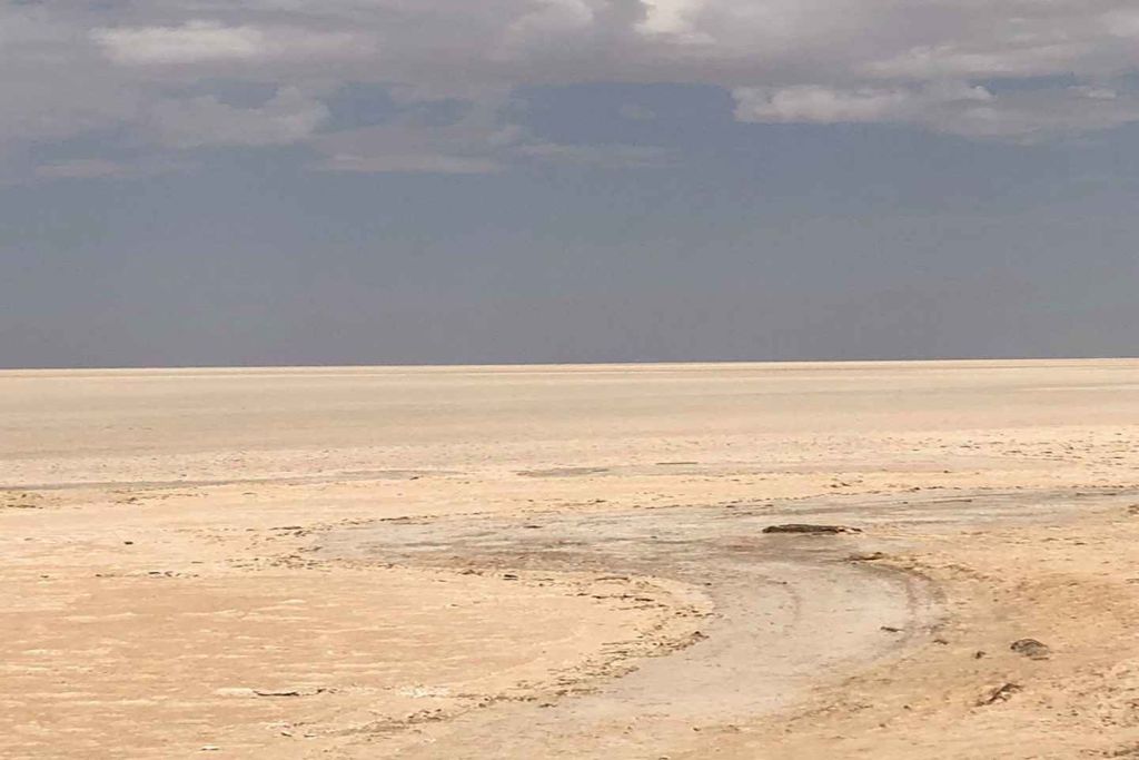 북아프리카 최대의 소금 호수인 신비로운 초트 엘 제리드를 가로지릅니다 – 반짝이는 환영과 끝없는 소금 평원이 펼쳐지는 초현실적인 풍경입니다.