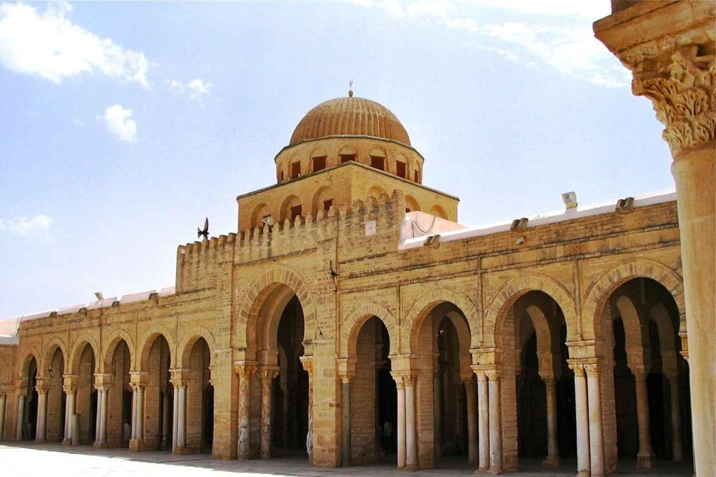 카이로안의 대모스크(13시 전까지 관람 가능)의 외관을 감상하세요. 이슬람 건축의 걸작입니다.