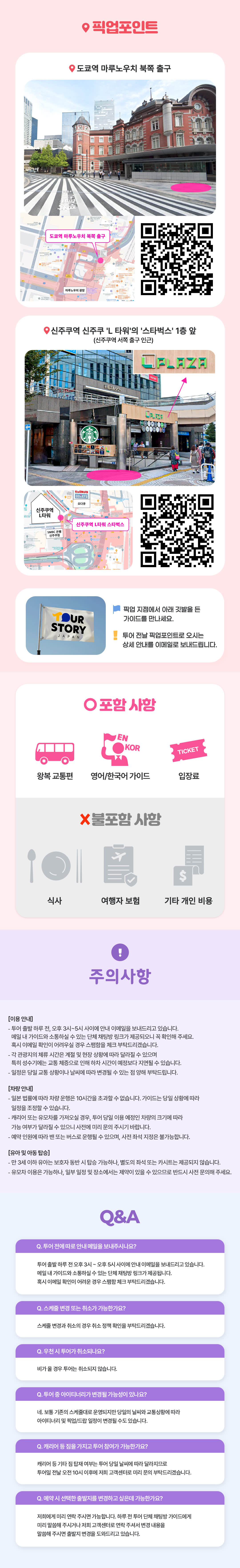 ✅ 이용 안내 • 출발 10분 전까지 출발지에서 대기해 주세요. 탑승 시간에 늦으실 경우 노쇼처리 됩니다. • 일정은 당일 교통 상황이나 날씨에 따라 변경될 수 있는 점 양해 부탁드립니다. • 비가 올 경우 투어는 취소되지 않습니다. • 투어 관련 변동 사항 있을 시 별도 이메일 안내 예정입니다. • 여행자 보험은 포함되어 있지 않습니다. 사전에 개인 여행자 보험 및 상해 보험에 가입하실 것을 강력히 권장합니다. 🚍 차량 및 탑승 관련 • 예약 인원에 따라 밴 또는 버스로 운행될 수 있으며, 사전 좌석 지정은 불가능합니다. • 캐리어 또는 유모차를 가져오실 경우, 투어 당일 이용 예정인 차량의 크기에 따라 가능 여부가 달라질 수 있으니 사전에 미리 문의 주시기 바랍니다. • 현지 이동 환경(계단, 경사로 미비 등)으로 인해 휠체어 이용은 어렵습니다. 이용에 참고 부탁드립니다. • 일본 법률에 따라 차량 운행은 10시간을 초과할 수 없습니다. 가이드는 당일 상황에 따라 일정을 조정할 수 있습니다. • 벚꽃 시즌에는 차가 많이 막힐 수 있습니다. 현지 교통 상황에 따라 관광지 체류 시간 및 하차 시간은 변동될 수 있습니다. 👶 유아 및 아동 탑승 • 만 3세 이하 유아는 보호자 동반 시 탑승 가능하나, 별도의 좌석 또는 카시트는 제공되지 않습니다. • 유모차 이용은 가능하나, 일부 일정 및 장소에서는 제약이 있을 수 있으므로 반드시 사전 문의해 주세요. • 본 상품은 성인 1인 이상 예약 시 이용 가능합니다. 소인만 예약 시 자동 취소 처리될 수 있으며, 이 경우 재구매가 필요합니다. - 대인 (만 13세 이상) - 소인 (만 3세 이상~만 12세 이하) - 유아 (만 3세 미만 유아는 무료이나, 좌석 이용이 불가능하며, 카시트는 제공되지 않습니다.)
