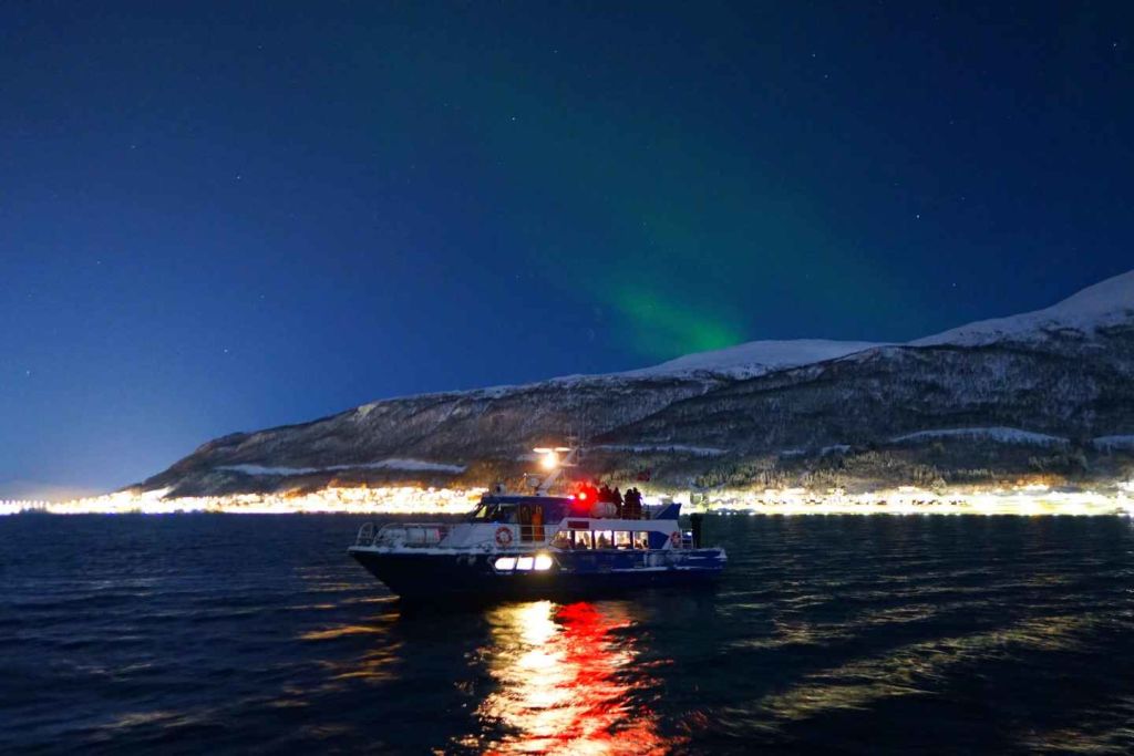 트롬쇠 도심의 선착장에서 시작되는 체험으로 북극의 밤을 만끽하세요. 보트는 20:00에 출발하여 오로라를 볼 수 있는 가능성이 가장 큰 목적지로 이동합니다.