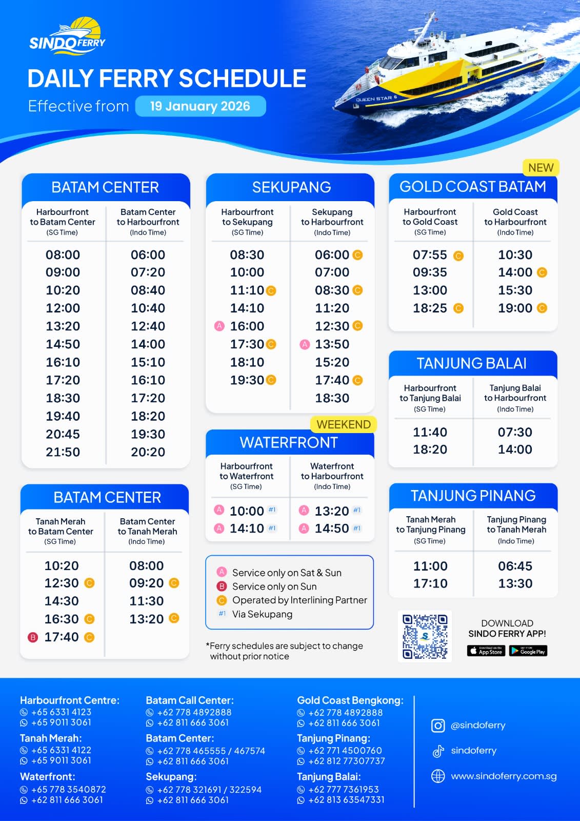 - 수하물 정보 * 표준 수하물 기준: 55cm x 40cm x 20cm. 이보다 큰 수하물은 표준 수하물 2개로 간주됩니다. * 수하물 중량 제한: 각 수하물 중량은 20kg 또는 44파운드를 초과할 수 없습니다. * 서핑보드, 웨이크보드, 자전거와 같이 1.5m 또는 100cm x 60cm x 30cm를 초과하는 대형 품목은 SGD10의 추가 요금으로 운송 가능하며, 출발 시간 30분 전까지 터미널(2층)에서 체크인해야 합니다. * 터미널 운영업체 등 타사에서 위탁 수하물을 처리하는 도중에 파손이 발생한 경우, 운영업체는 책임을 지지 않습니다. * 모든 화물 및 상업 품목 또는 안전한 취급을 위해 적절하게 포장되거나 묶이지 않은 품목은 카운터에서 체크인 시 접수되지 않습니다.