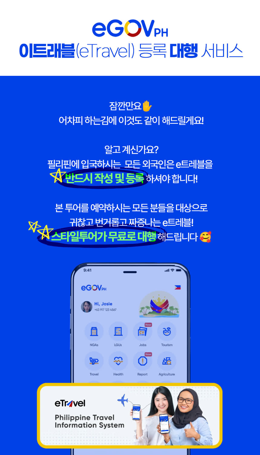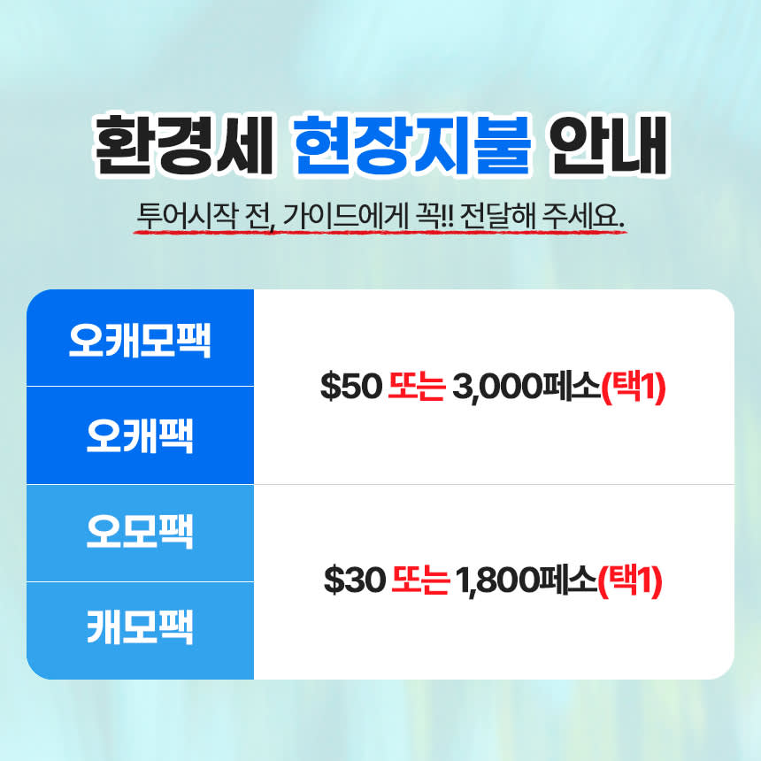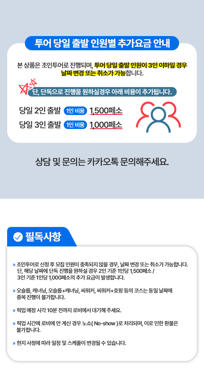 📢 개별 여행자 보험 가입을 권장드립니다! 📢 막탄공항 출발 예약안내 - 본 상품은 공항 픽업이 가능합니다. - 공항 픽업을 원하시면 숙소에 막탄 공항이라고 적어주세요. 📢 예약확정후 대표자분 카카오톡으로 "전날" 확정 안내연락을 드립니다. • 정확한 픽업 시간은 투어 전날 배차 완료 후 카카오톡으로 안내드립니다. • 투어 5일 전까지 2인이상 모객되지 않을 경우 투어가 취소될 수 있으며 카톡으로 안내드립니다. 📢 오슬롭 투어는 만 2세부터 이용진행 가능합니다. 📢 캐녀닝은 만 8세부터 진행이 가능합니다. 📢 해당 상품은 임산부는 이용하실수 없습니다. 📢 15분 이상 늦는 경우 픽업이 순차적으로 이뤄지기 때문에 노쇼로 진행됩니다. 📢 고래상어 터치 및 선크림 사용은 금지되어 있습니다. 📢 투어당일 악천후로 인해 예약한 투어진행이 어려울 시, 다른 투어로 변경 또는 날짜 변경이 가능합니다. 🚐 차량 이용 안내 1) 4인승(소형차) : 1~2인 권장(짐포함) 2) 7인승(SUV) : 2~3인 권장(짐포함) 3) 10~15인승 (Van) : 4~7인 권장(짐포함) * 카시트 설치 불가