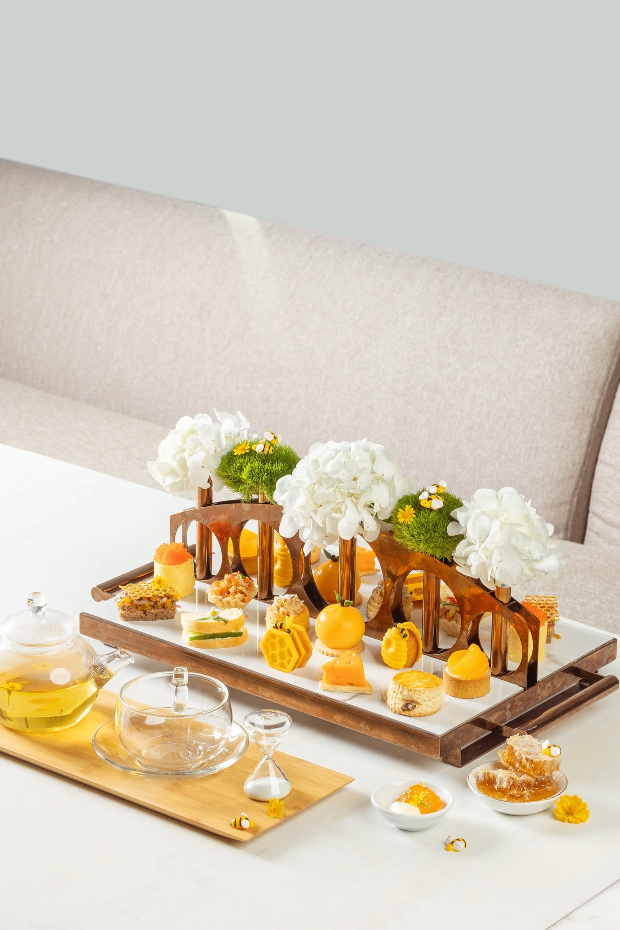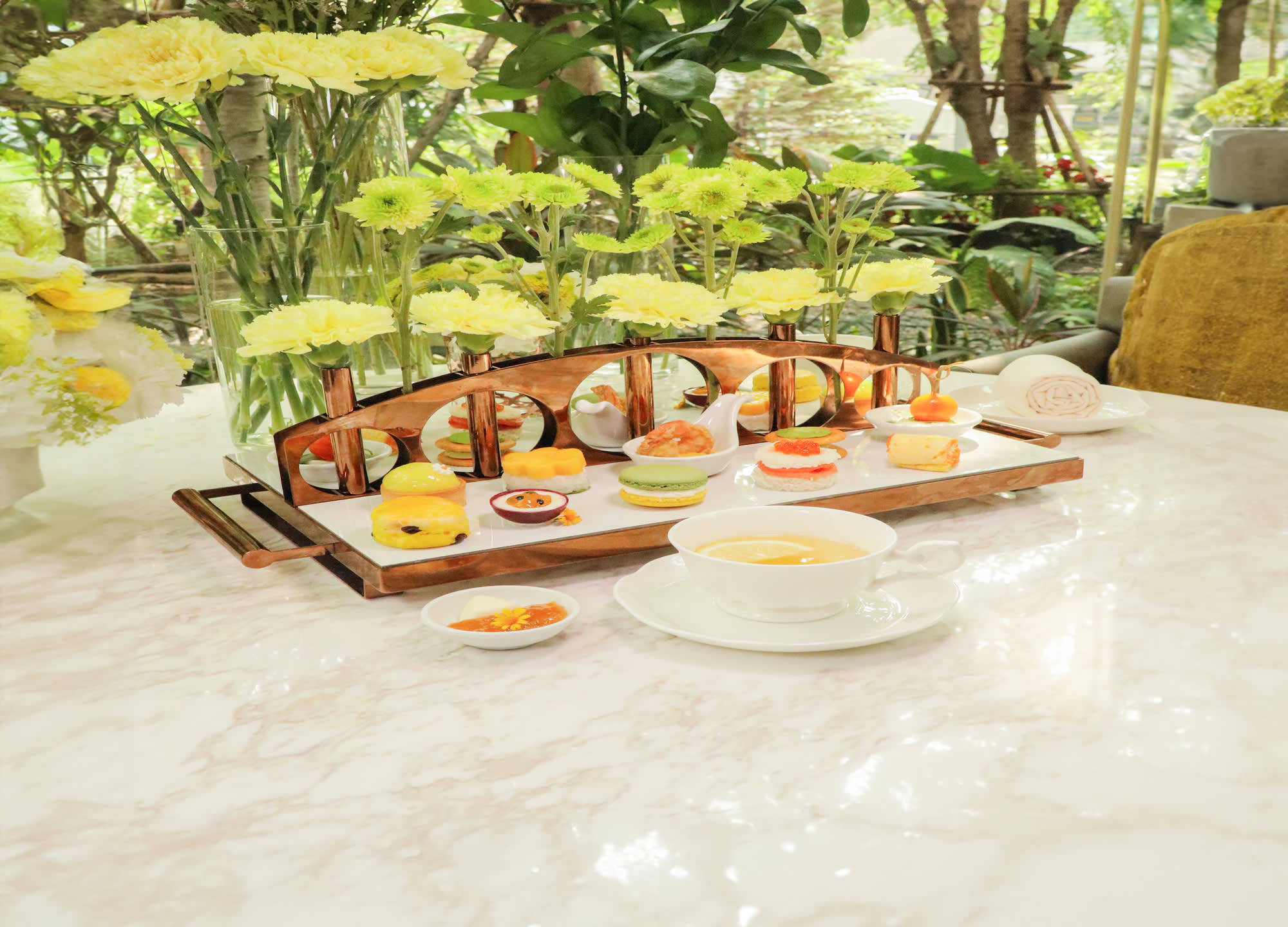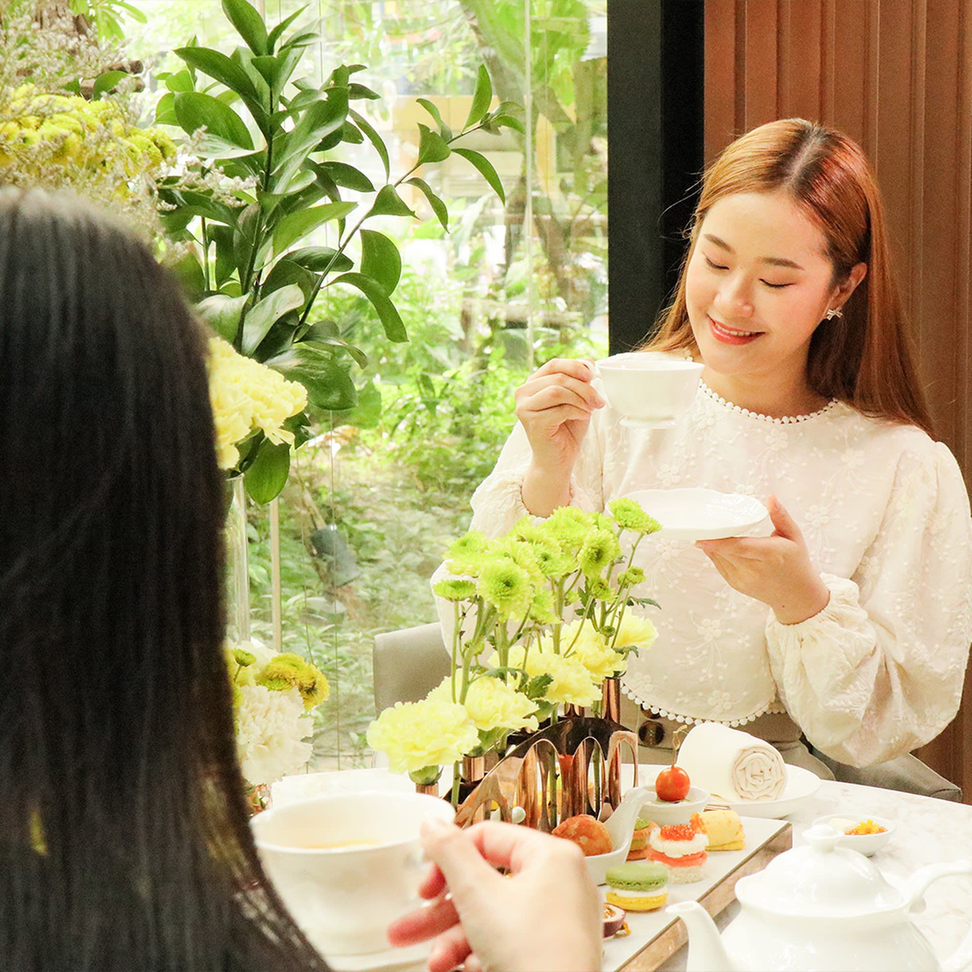 따스한 자연 채광과 여유로운 음악이 어우러진 공간에서, 정성스럽게 준비된 디저트와 세이보리, 향긋한 차 한 잔이 완벽한 오후를 완성합니다.