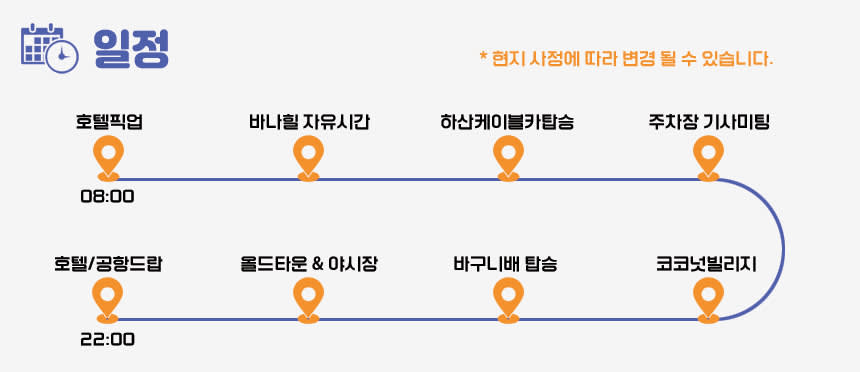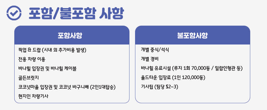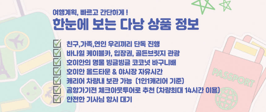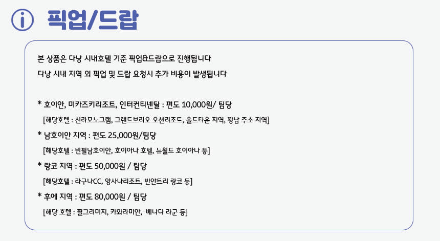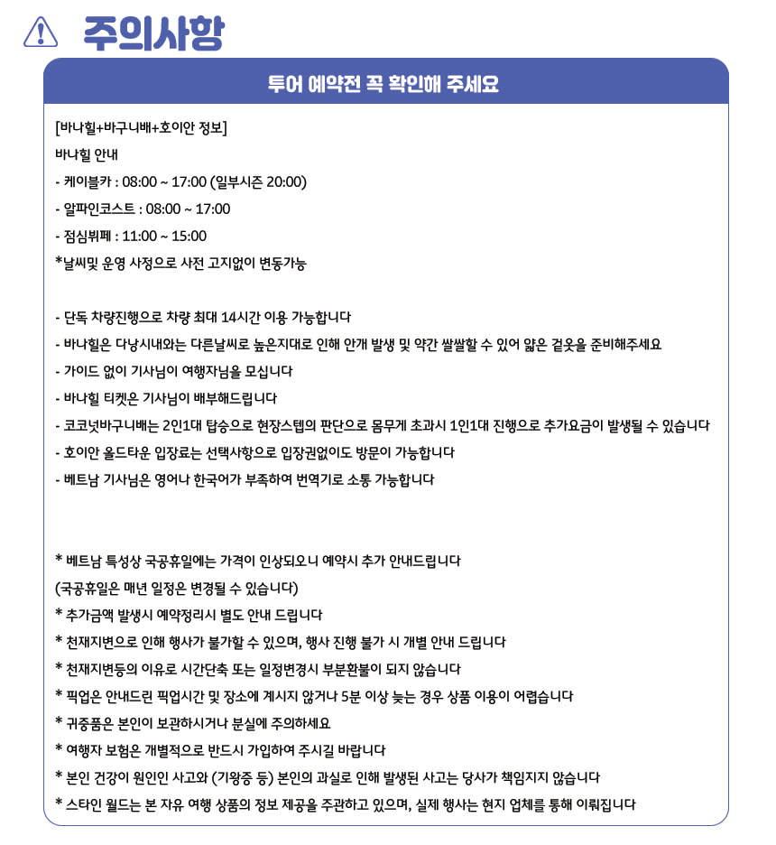 📢국공휴일 추가비용 안내 1. 베트남 특성상 하기 국공휴일에는 가격이 30% 인상되오니 예약시 해당기간 참조 부탁드립니다. 2. 매년 일정은 변경될 수 있습니다. **매년 한국구정 앞뒤 1주일 가량 Tet Holiday (구정) 24년 2월 7일 - 2월 14일 추가요금 결재 개별안내드리겠습니다. 📌 [주의 사항] - 본 상품은 최소출발인원 성인기준 2인 이상입니다. - 본 상품은 가이드가 아닌 기사가 고객님을 모십니다. - 바나힐 티켓/바구니배는 기사님이 배부해드립니다. - 다낭 시내 호텔 픽업/드랍 기준입니다. (그 외지역은 추가비용 발생) - 단독 행사 상품으로 일정 조율이 가능합니다. - 단독 행사로 차량 최대 14시간 이용 가능합니다. (추가시 시간당 20,000원) - 예약 후 원하시는 일정은 개별메세지 알려주시기 바랍니다. - 우천시에도 행사 진행합니다. - 차량에 캐리어(짐) 보관은 가능하나, 귀중품은 개별적으로 챙겨주시기 바랍니다. - 여행자 보험은 개별적으로 반드시 가입하여 주시길 바랍니다.