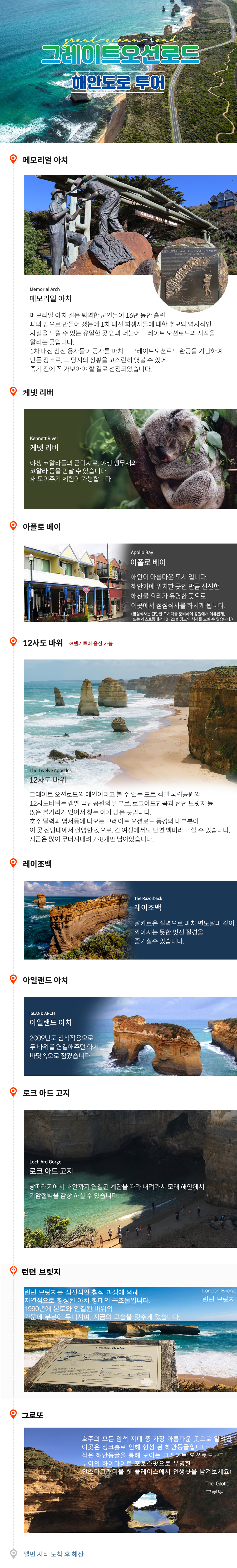 [포함사항] · 차량 · 한국인 가이드 · 각종 입장료 [불포함사항] · 식사 · 개인 비용 · 여행자 보험 ‣ 투어 시간 07:00 - 19:30 (예정) ‣ 상기 일정은 현지 사정에 따라 다소 변경될 수 있습니다. ‣ 정시에 투어가 시작되오니 늦으실 경우 투어 참가가 불가능합니다. ‣ 차량은 당일 투어 인원에 따라 달라집니다. ‣ 최저 행사 인원(5명)이 충족되지 않을 경우 행사는 취소 혹은 연합 투어로 진행될 수 있습니다. ‣ 24개월 미만 유아 카시트는 수량 제한으로 제공이 불가할수 있습니다. 유아 별도 좌석 제공됩니다. ✔️ [선택 관광] ‣ 그레이트 오션 로드 헬기 투어 A$175~ ⇒ 현장 예약 , 카드결제 가능
