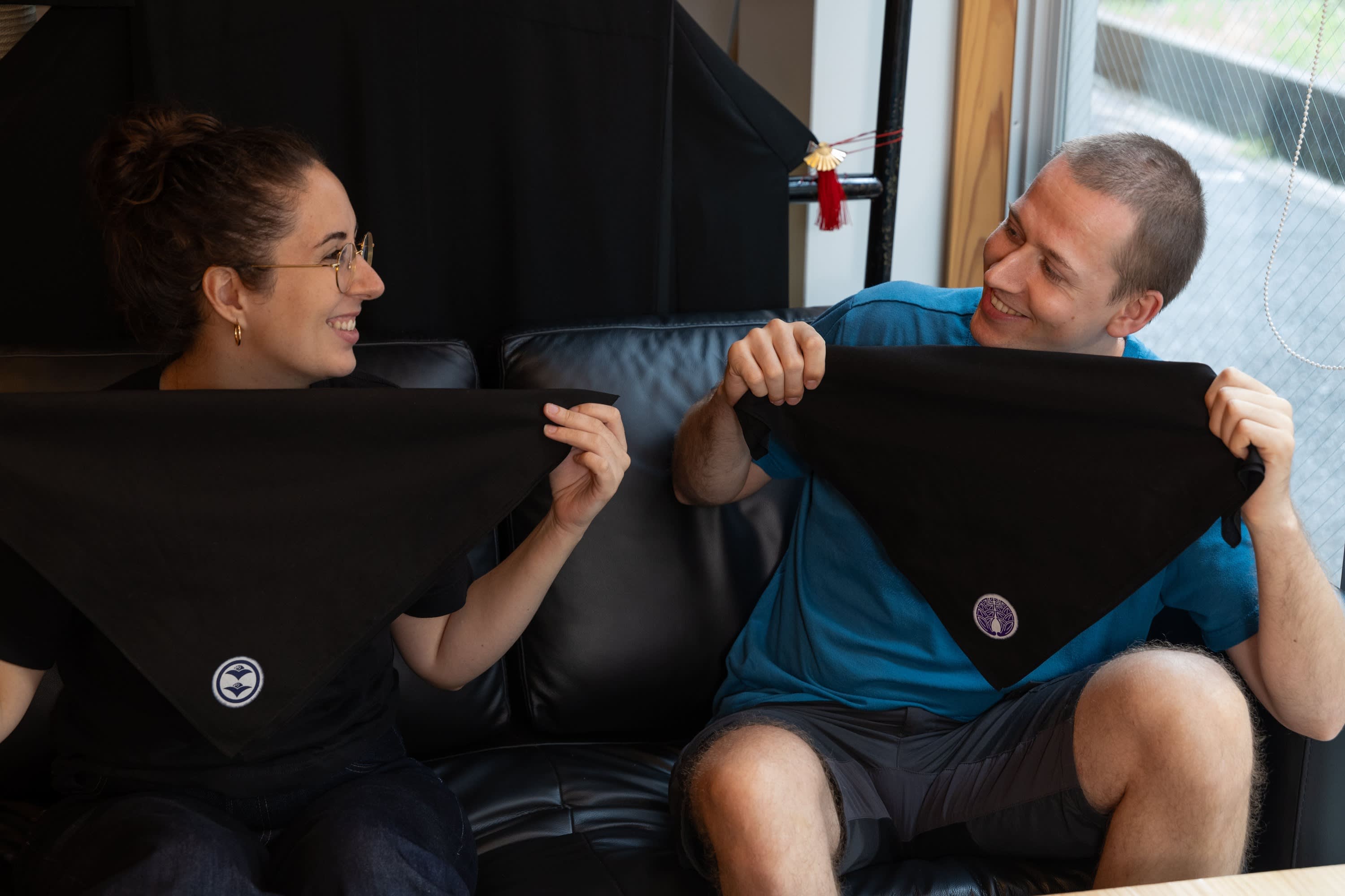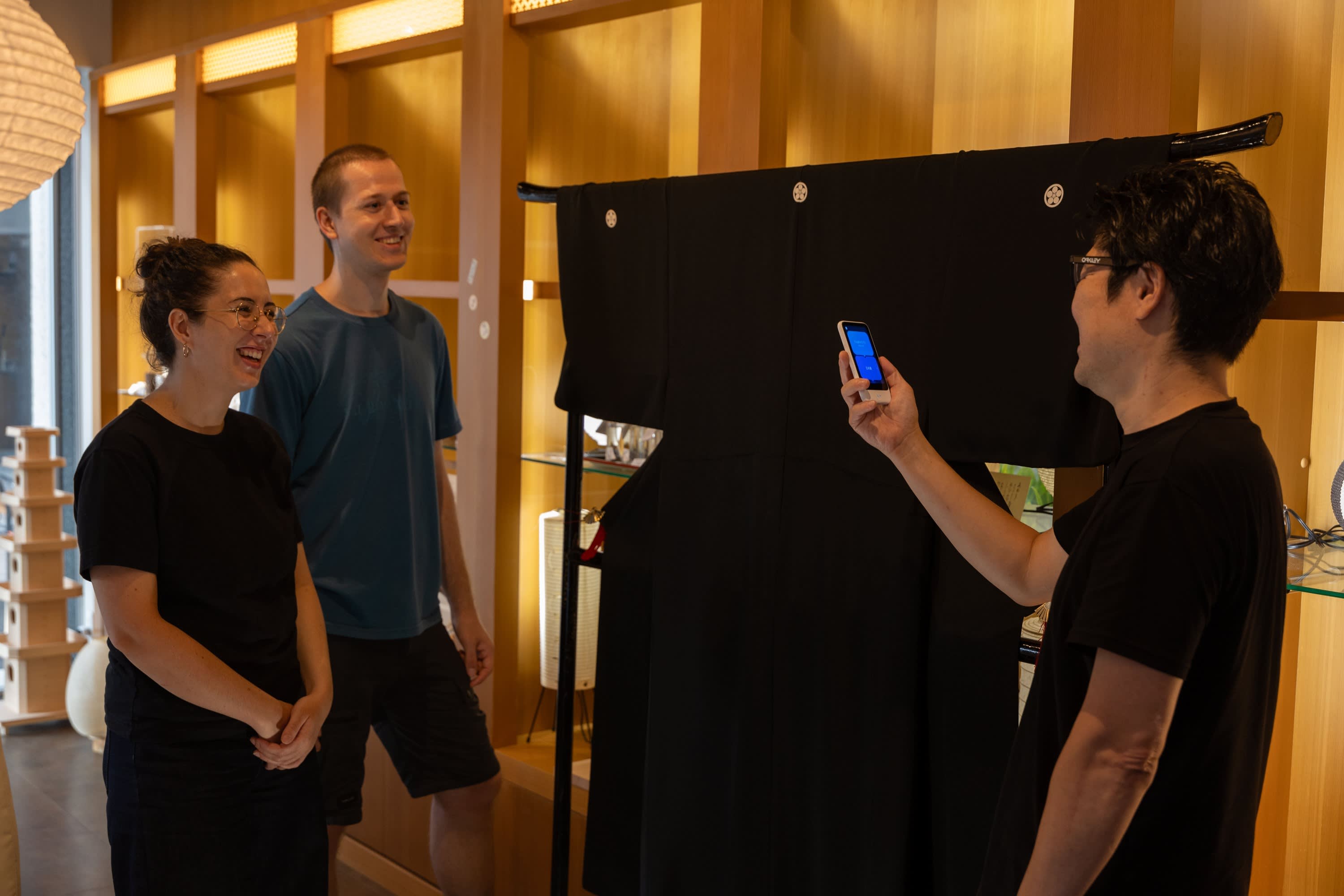 장인의 안내에 따라 가문(家紋)을 선택하고 검은색 데누구이 스카프에 적용하여 세상에 하나뿐인 기념품을 만들어 보세요. 다용도로 활용 가능하고 의미 있는 데누구이는 액세서리, 손수건 또는 벽걸이 장식으로 사용할 수 있습니다.