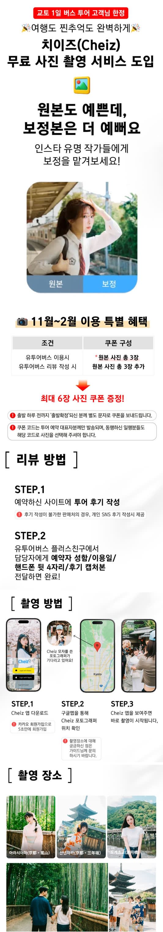 중요 공지: 2025년 12월 30일~2026년 1월 4일, 1월 5일, 1월 12일은 일본 연말연시/성년의 날 행사로 인해 후시미 이나리 관광이 제외되며, 투어 중간 합류도 불가합니다.