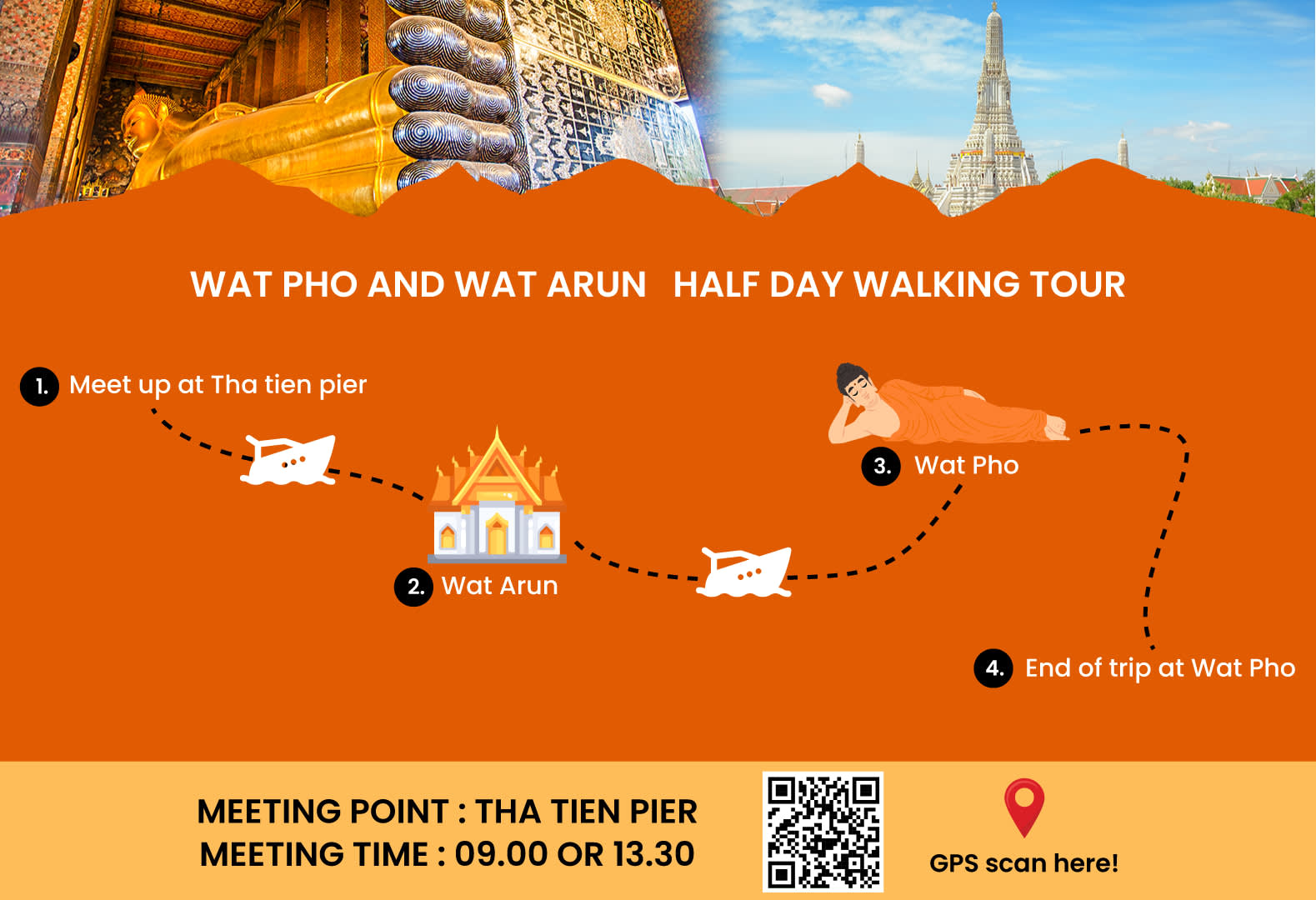 ▶오전 투어 · 조인 투어 · 선택안함 - 이용요건 * 만 4세 이상은 성인과 동일한 요금이 적용됩니다. * 그룹 규모: 참여자 수 2-12인 - 추가정보 * 본 액티비티는 휠체어 사용자에게 적합하지 않습니다. * 본 액티비티는 임신부에게는 적합하지 않습니다. * 본 액티비티에서는 식사(점심)를 제공하지 않으므로 음식에 대해 고지할 의무가 없습니다. * 본 액티비티에는 배로 차오프라야강을 건너는 활동이 포함되어 있으므로 장애인에게는 적합하지 않습니다. * 본 프로그램은 더운 날씨에 진행되며 도보 이동과 차오프라야강 보트 탑승이 포함되어 있습니다. 따라서 만 70세 미만의 여행객에게 적합합니다. - 규정 및 제한사항 * 액티비티 참여 불가능: 고혈압 / 심장 질환 / 임신부 - 준비물 * 자외선 차단제 / 선글라스 / 모자 / 여권 (잔여 유효기간 최소 6개월) - 복장 * 세미정장 / 걷기 편한 운동화 (워킹화) - 편의성/접근성 * 휠체어 이용/수용이 불가능합니다. * 아동용 카시트를 이용할 수 없습니다.