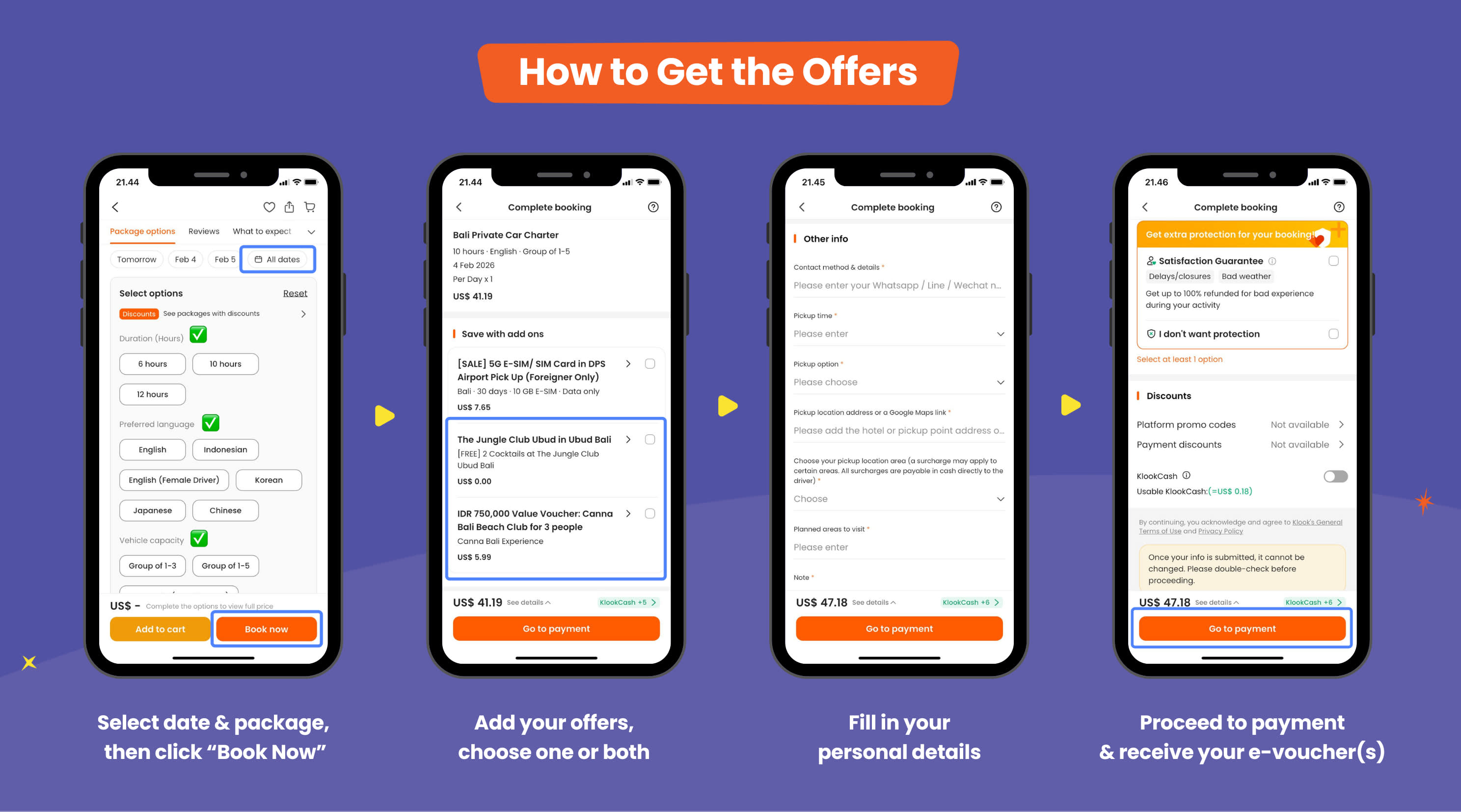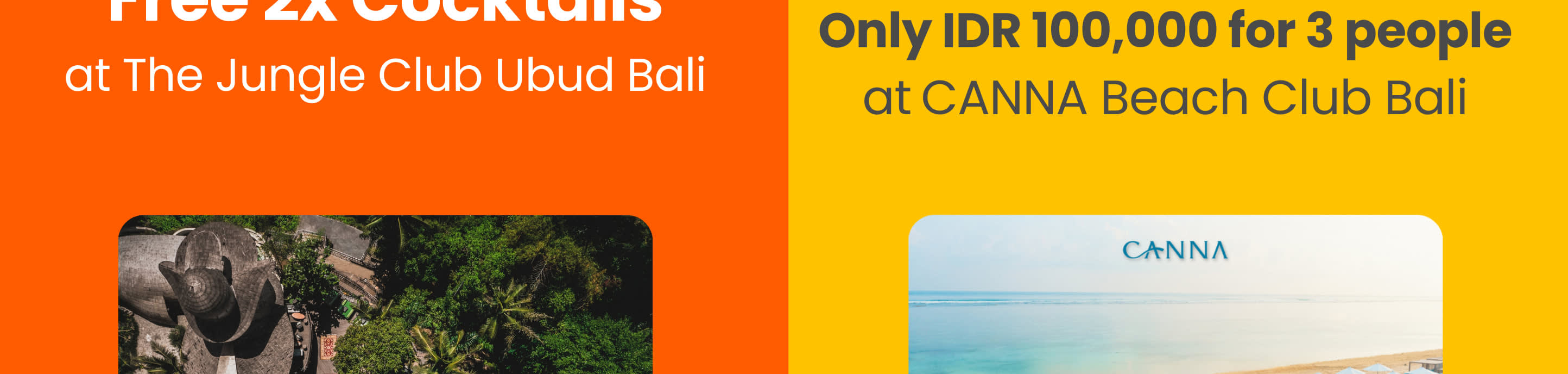 * 단독 프로모션!모든 패키지를 예약하시면 더 정글 클럽 우붓에서 칵테일 2잔을 무료로 드리고, 칸나 발리 비치 클럽에서 3인 기준 IDR 100,000에 IDR 750,000 특별 바우처를 드립니다. 결제 시 혜택을 받으세요!