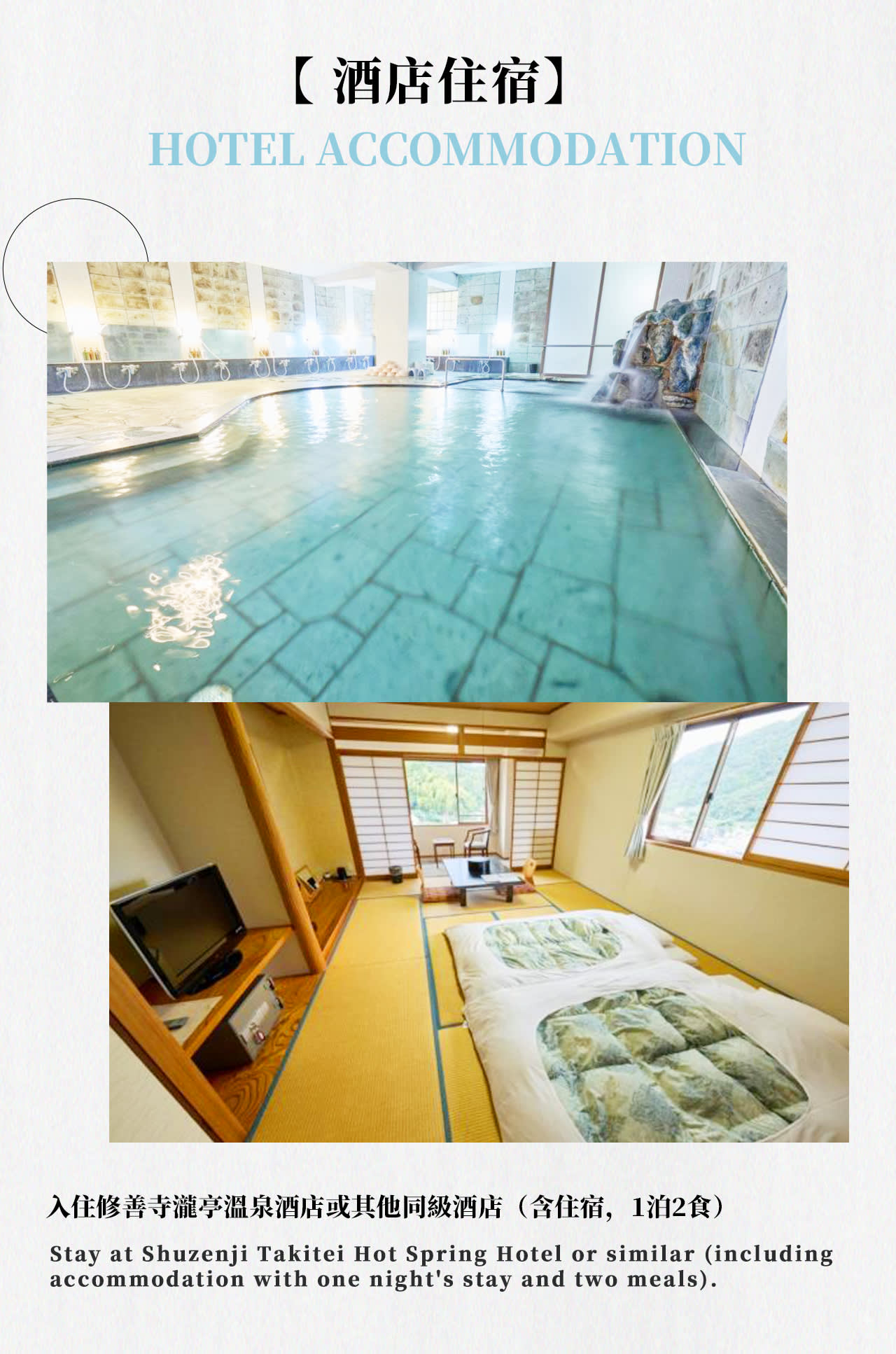 * 온천에서 휴식: 전통 온천 호텔에 숙박하며 조식과 석식이 포함되어 있어 하루의 피로를 풀 수 있습니다.