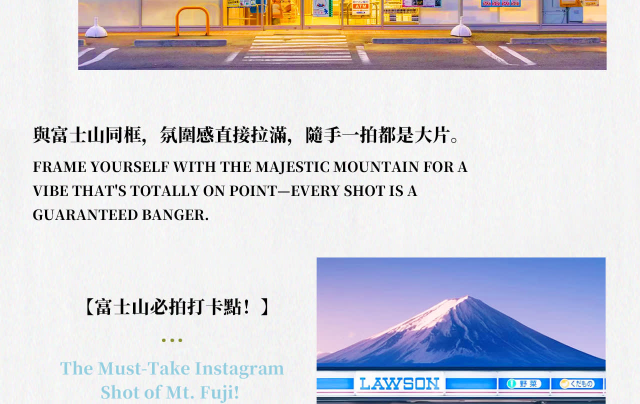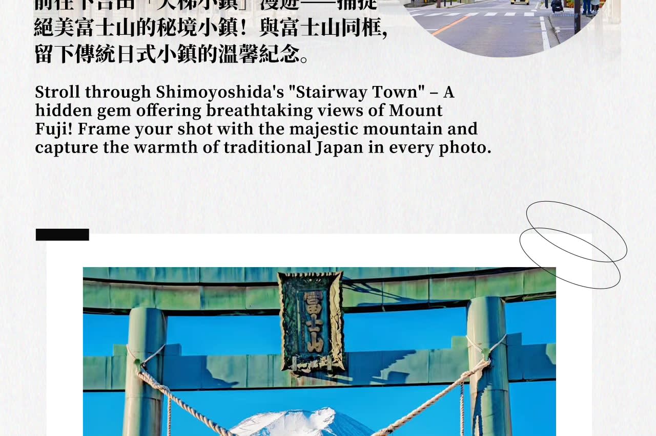 【둘째 날】 후지산 주변의 아름다운 명소를 탐방하세요. 오시노 핫카이의 고풍스러운 연못, 오이시 공원과 아라쿠라야마 센겐 공원의 후지산 전경, 시모요시다 "천국의 계단 마을"을 거닐며 숨겨진 보물 같은 풍경을 촬영하세요. 인기 있는 맥도날드, 로손 편의점 등 특별한 인증 장소를 지나 여행에 재미와 놀라움을 더하세요.