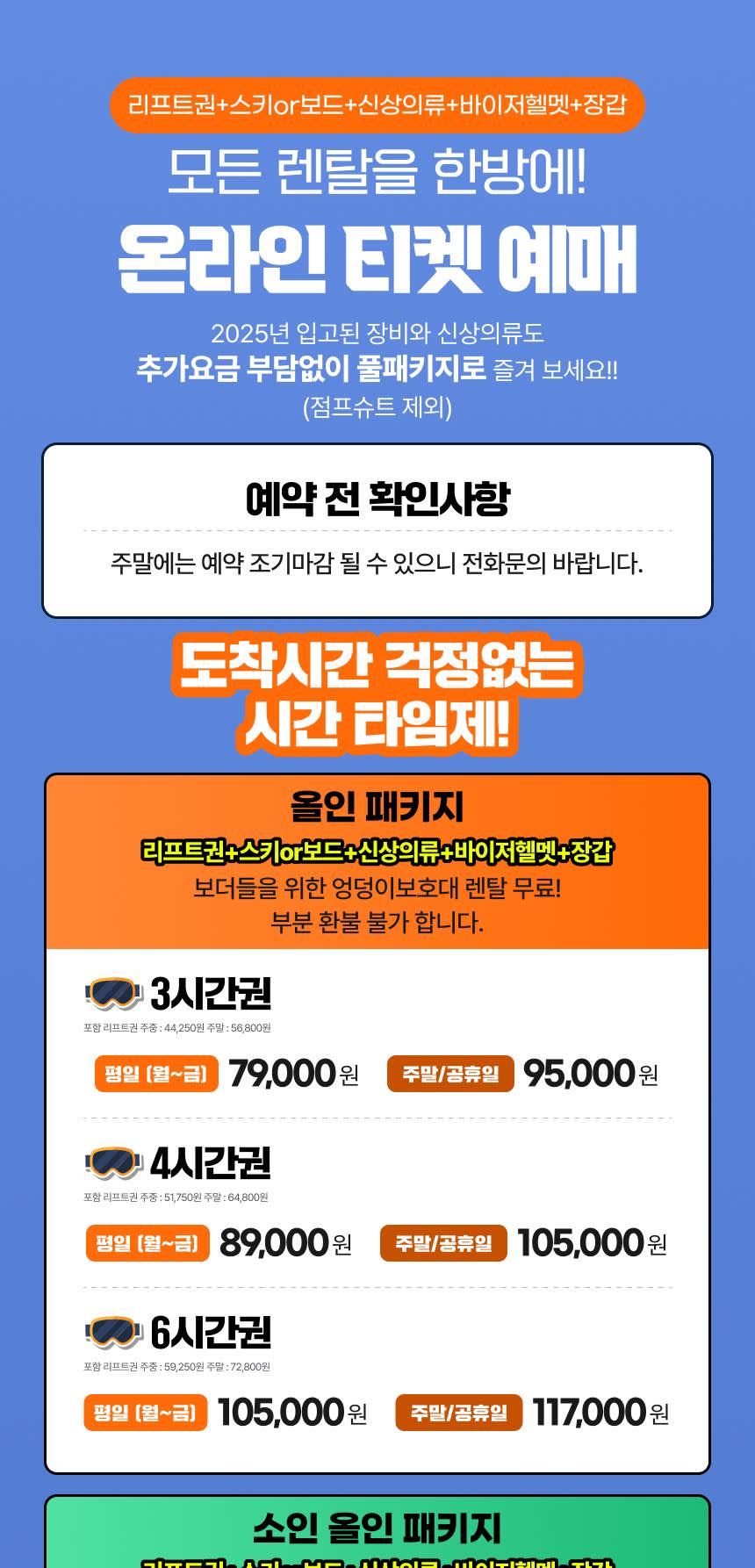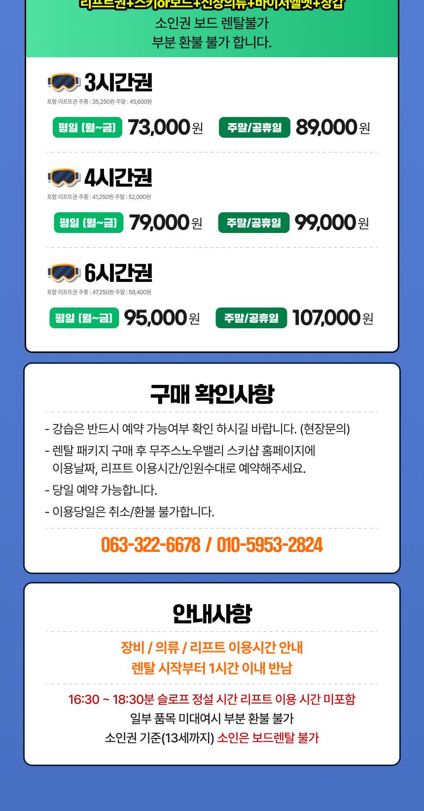 - 이용 방법 : 예약 후 스노우밸리 방문- 예약 필요 여부 : 구매 후 예약 필수- 유효기간 : 2025.11.25 ~ 2026.03.08- 당일이용 가능여부 : 당일 이용 가능 예약 필