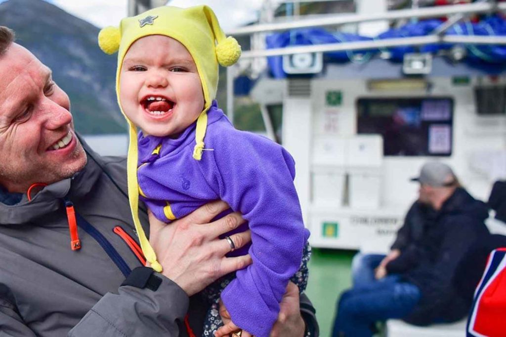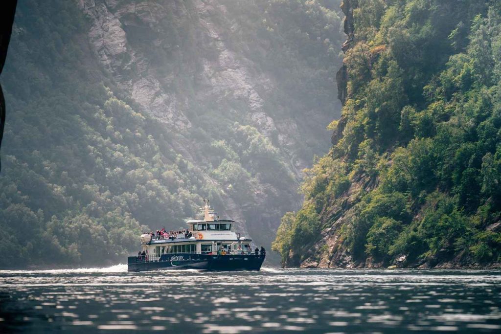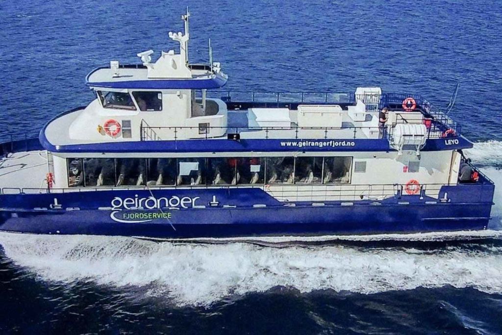 게이랑에르에서 편안한 보트에 올라타세요. 대형 파노라마 창문이 있는 넓은 실내 공간에서 날씨에 상관없이 편안하게 지내거나 외부 갑판에서 장애물 없이 경치를 감상하세요.