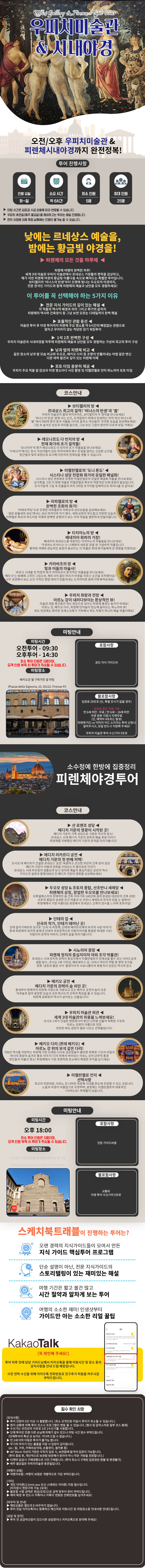 ✅포함 사항 * 가이드 비용 ❌불포함 사항 * 우피치 미술관 입장료: 성인기준 총 29€ (특별 전시 없을 경우) 만 6세 이상~18세 미만: 당일 여권 원본 지참시 입장료 무료, 예약비 4€ 는 별도 (만 6세 미만은 예약비도 무료) * 피렌체 카드(or 아미치 카드) 소지하고 투어하실분들은 투어 신청 시 반드시 알려주셔야 합니다. * 우피치 투어: 수신기 비용:5€ * 야경 투어: 수신기 비용:5€ * 개인 여행자 보험 📍미팅 시간 (우피치 오전/오후 ~ 야경투어 ) * 오전 투어:09:30~12:20/18:00~20:30 * 오후 투어:14:30~17:20/18:00~20:30 📍미팅 장소 * 우피치 투어: 구찌가든 앞 (Piazza della Signoria, 10, 50122 Firenze FI) * 야경 투어: 산 로렌조 성당 정면 왼쪽 문 앞 (Piazza di San Lorenzo, 50123 Firenze FI) ⚠️필수 확인 사항 * 최소 인원: 투어는 5명 이상 시 출발하며, 인원 부족 시 취소될 수 있습니다. * 노쇼 방지를 위해 입장료를 미리 입금받아 예약이 진행됩니다. * 투어 신청 시 정확한 인원수(성인/학생)를 알려주세요. (미 인폼시 일반으로 구매) * 만 18세 미만 학생은 투어 당일 여권 원본 지참이 필수입니다. * 야경투어의 경우 우천시 가이드님께서 당일 투어 진행 가능 여부 판단해 안내 해드립니다. ✔️준비물 및 안내사항 * 개인 이어폰: 3.5mm 유선 스테레오 이어폰을지참해 주세요. (미지참 시 현장 구매 가능) * 불포함 항목 비용은 현금(유로)으로 준비해 주세요. * 만 3세 이하 아동 참여 불가 (유모차 반입금지) * 대형 배낭 및 캐리어 , 타인 상해 및 무기의 여지가 있는 물품 (ex : 칼, 가위,삼각대, 셀카봉, 장우산 등)소지시 입장제한 * 해당상품은 별도의 E-바우처가 없습니다. * 투어 전날 카카오톡이나 등록하신 메신저로 미팅시간 및 미팅장소등 안내사항 안내드립니다. * 궁금한 점은 카톡 채널'스케치북 트래블'로 문의해 주세요. 🗓️취소/환불 규정(여행일은 현지 시각 기준) * 여행시작 30일 전까지 (~30) 통보시 : 여행 요금 전액 환불 * 여행시작 20일 전까지 (29~20) 통보시 : 상품 요금의 20% 공제 * 여행시작 7일 전까지 (19~7) 통보시 :상품 요금의 30% 공제 * 여행시작 4일 전까지 (6~4) 통보시 :상품 요금의 50%공제 * 여행시작 당일까지 (3~당일) 통보시 : 취소/환불 불가