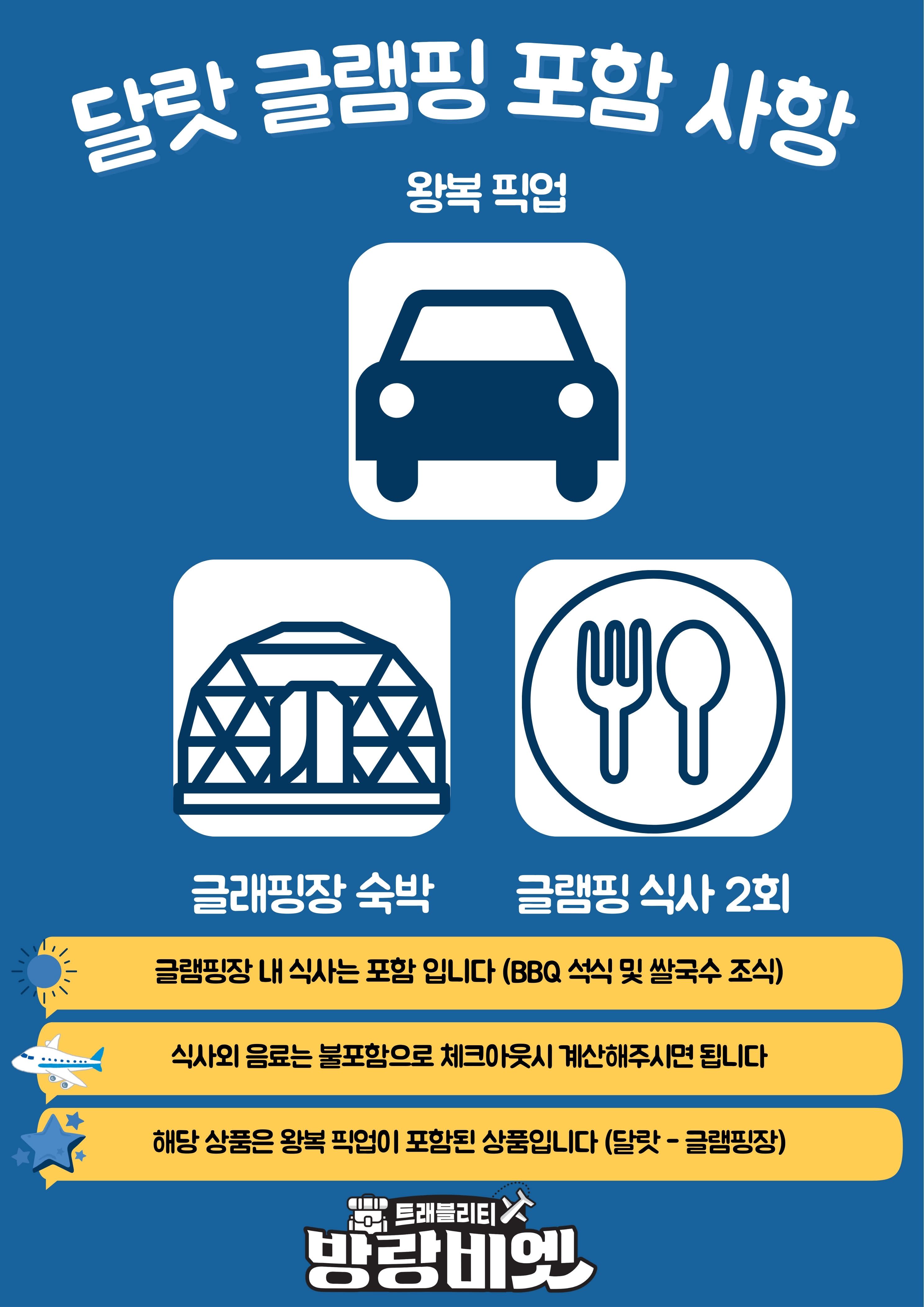 - BBQ 석식, 조식 (글램핑장내 식사 포함, 음료 및 주류 불포함)