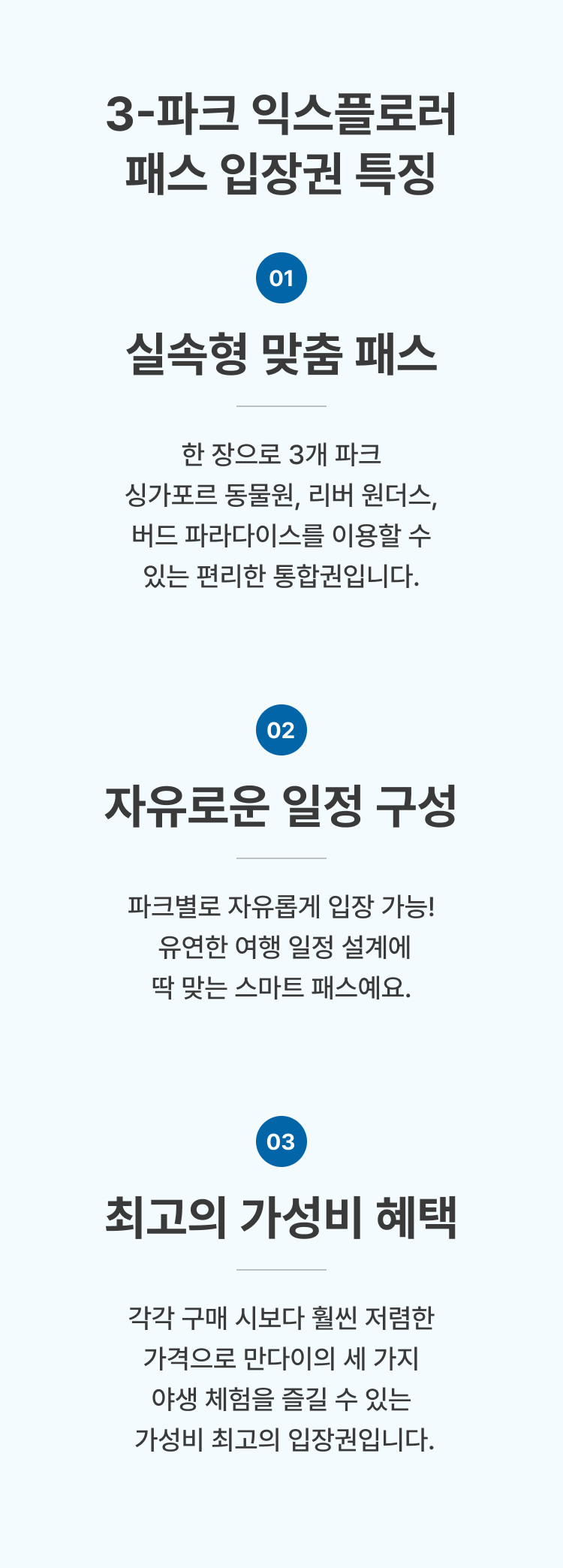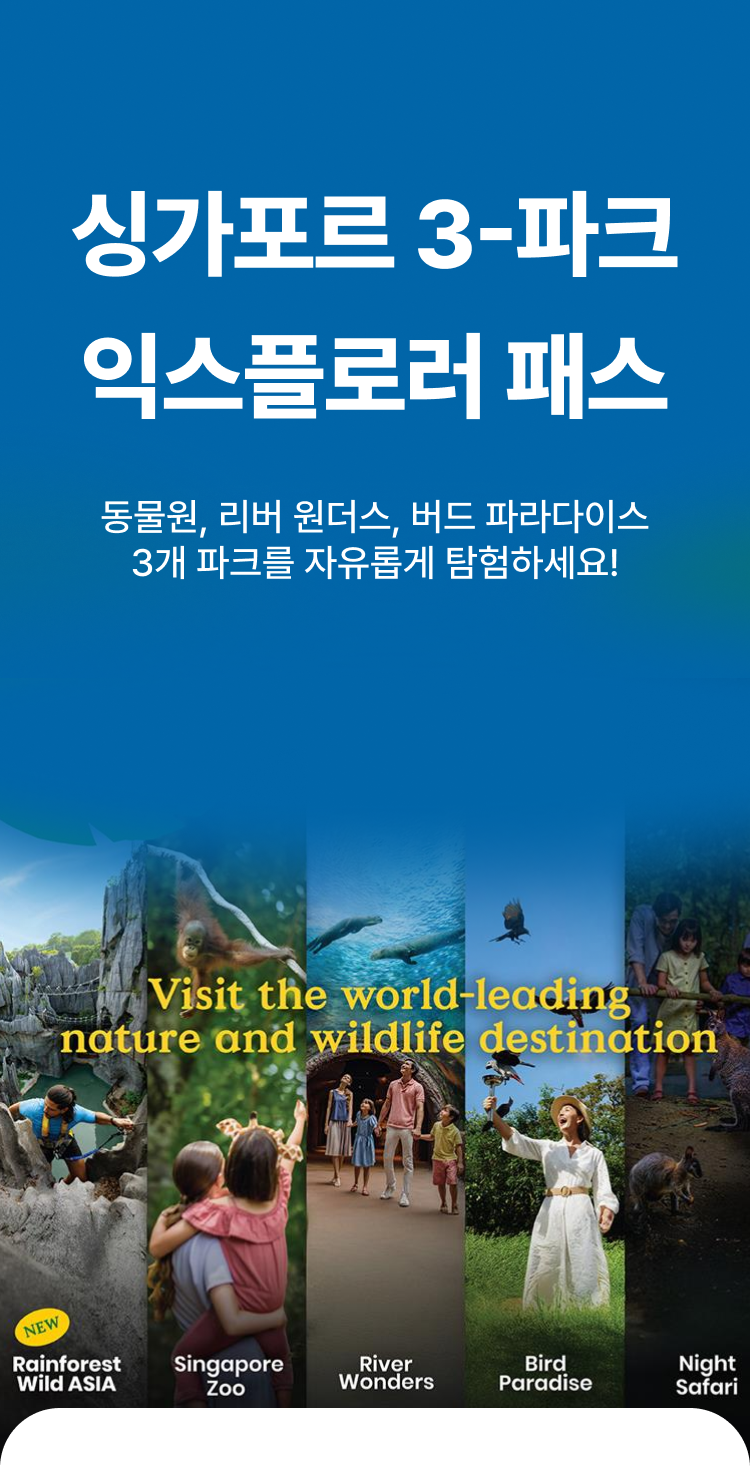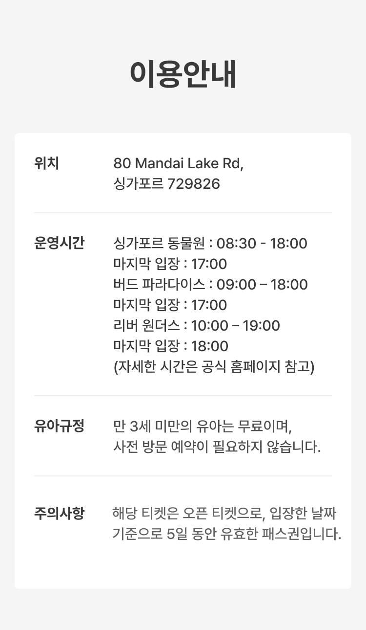 🐯 공원 입장 및 예약 안내 필수 예약 정보 선택하신 날짜와 시간에만 입장이 가능합니다. 티켓 유효 기간 및 포함 사항 선택하신 시작일로부터 5일간 유효합니다. 선택하신 조합에 포함된 각 공원에 1회씩 입장할 수 있습니다. 싱가포르 동물원, 리버 원더스, 버드 파라다이스 입장 시 트램 탑승이 포함되어 있습니다. 연령별 입장 안내 3세 미만: 무료 입장이 가능하며, 연령 확인을 위해 신분증 제시가 필요합니다. 12세 미만 아동: 유료 입장권을 소지한 보호자와 반드시 동반해야 합니다. 취소 및 변경 규정 예약 완료 후에는 취소 또는 변경이 불가하오니 신중하게 결정해 주시기 바랍니다. ⚠️ 안전 수칙 및 공원 규칙 동물들에게 영향을 줄 수 있으므로, 향수나 강한 향이 나는 제품 사용을 자제해 주세요. 동물에게 먹이를 주거나, 만지거나, 놀리는 행위는 금지되어 있습니다. 동물들의 스트레스 방지를 위해 플래시를 이용한 촬영은 금지됩니다.