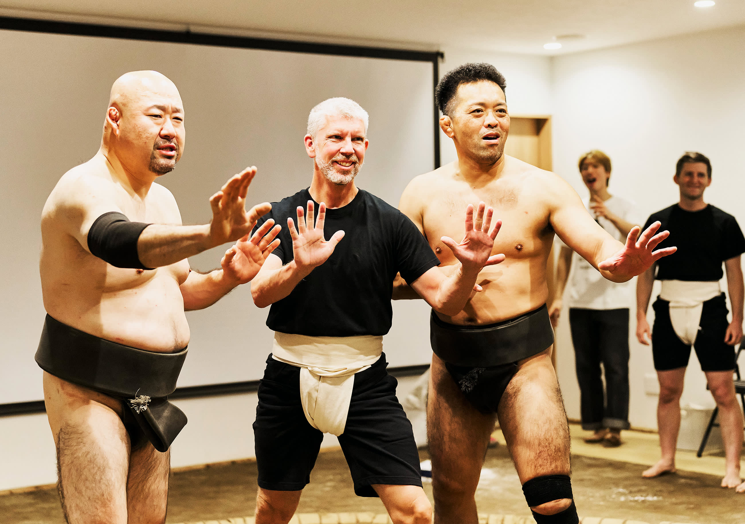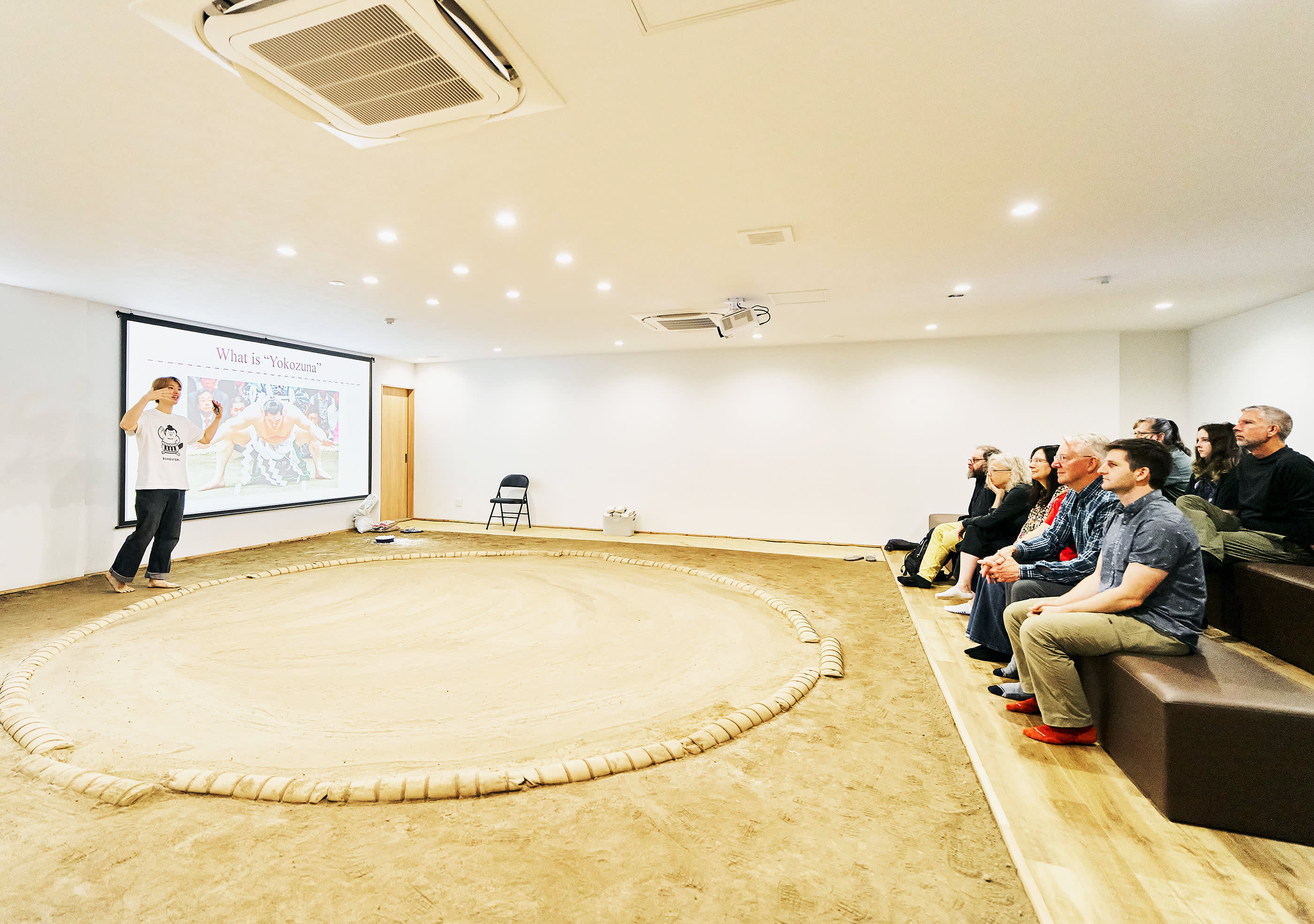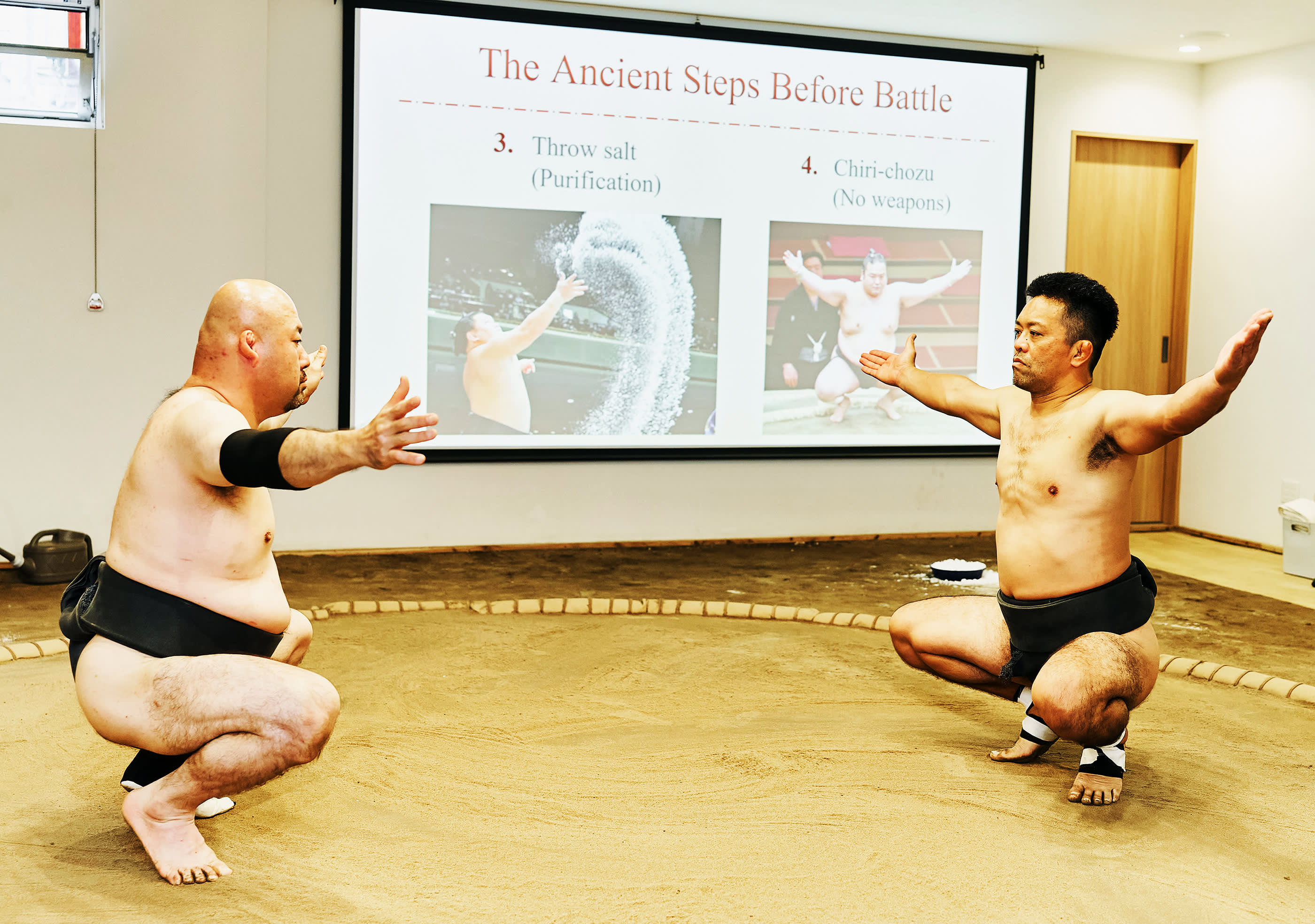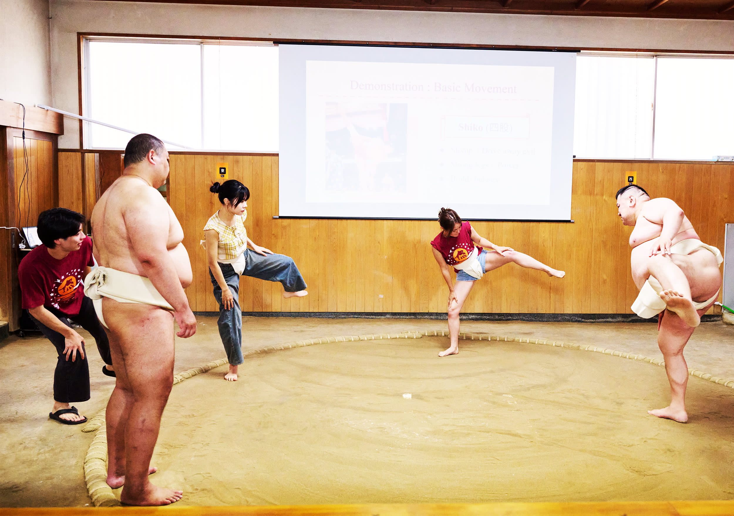 시연 중에는 실제 스모 훈련, 유명한 기술(기마리테), 은퇴한 스모 선수 간의 치열한 1라운드 경기(다치아이)를 볼 수 있습니다. 원하는 분들을 위해 스모 선수에게 직접 도전할 기회도 제공됩니다(제한된 자리만 이용 가능).