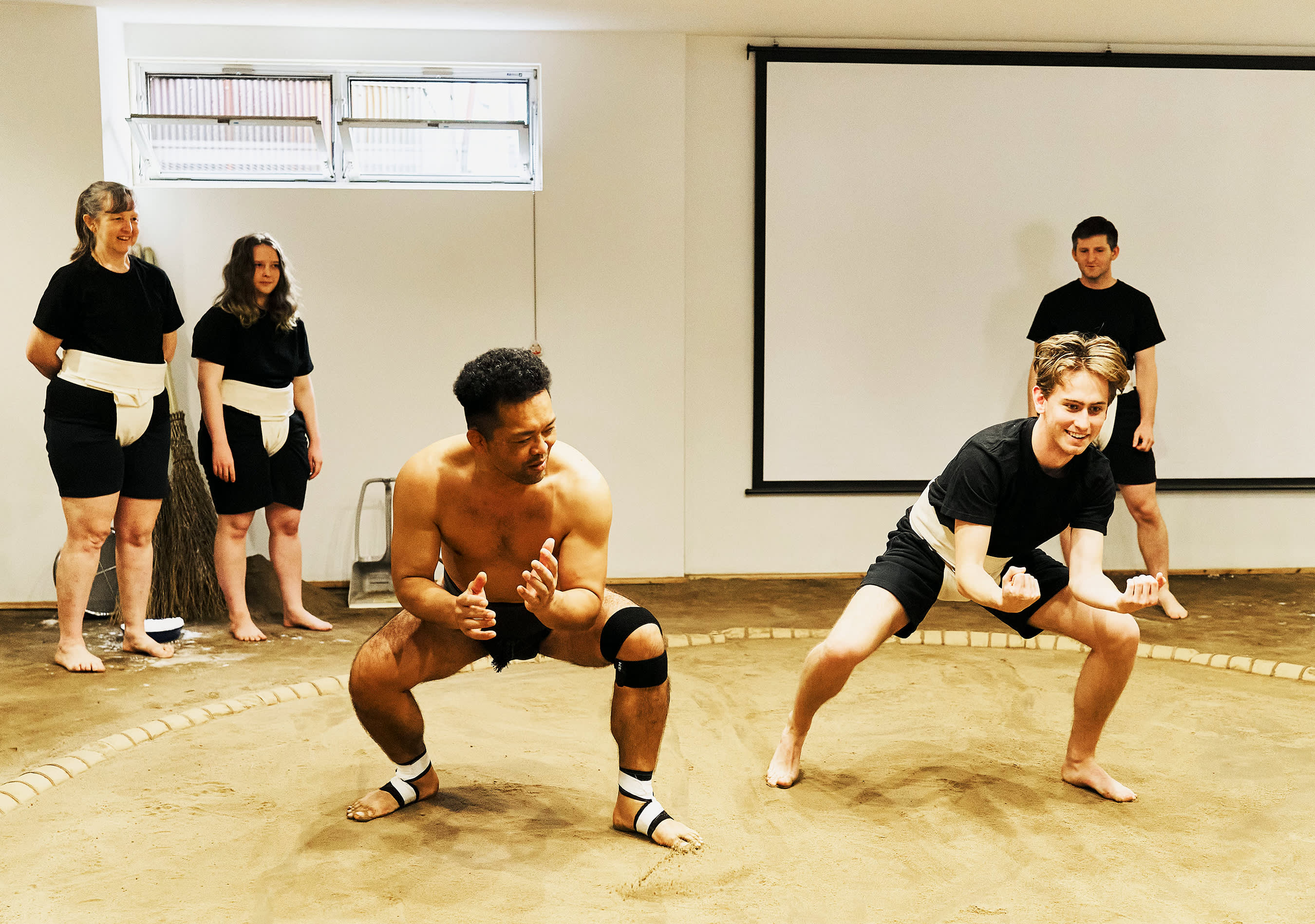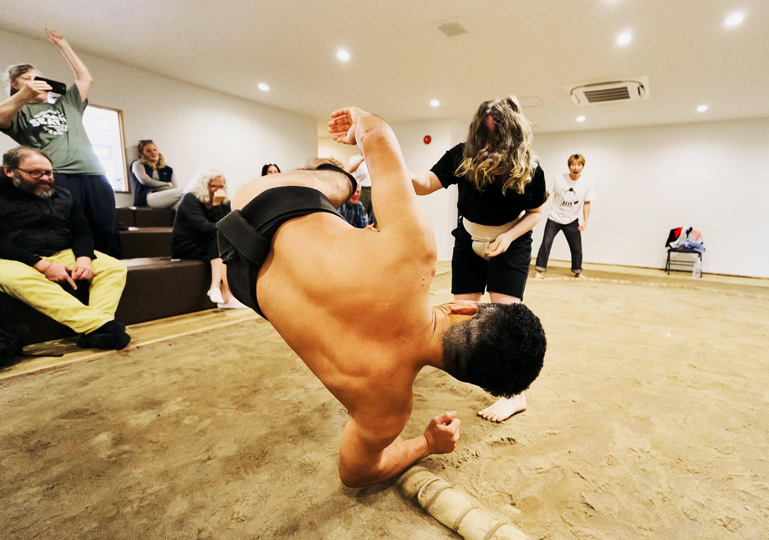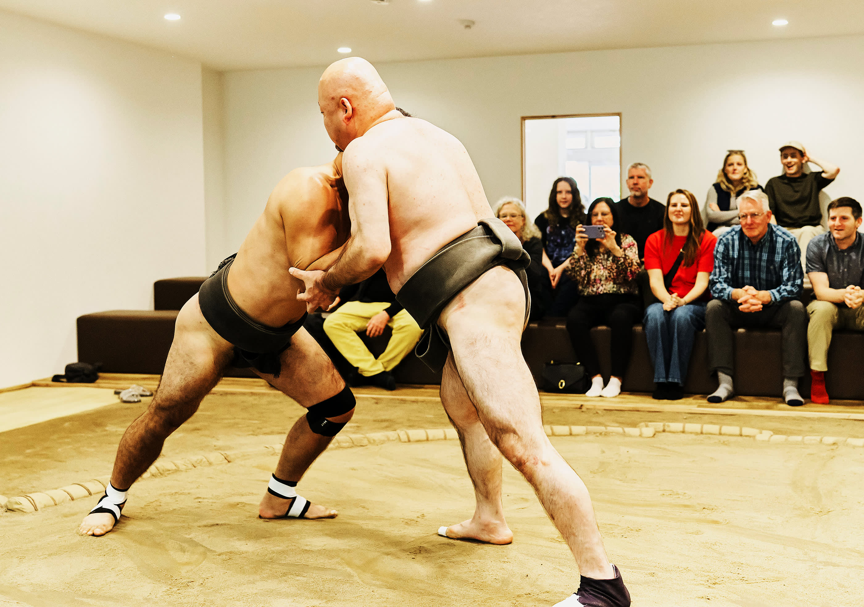 시연 중에는 실제 스모 훈련, 유명한 기술(기마리테), 은퇴한 스모 선수 간의 치열한 1라운드 경기(다치아이)를 볼 수 있습니다. 원하는 분들을 위해 스모 선수에게 직접 도전할 기회도 제공됩니다(제한된 자리만 이용 가능).