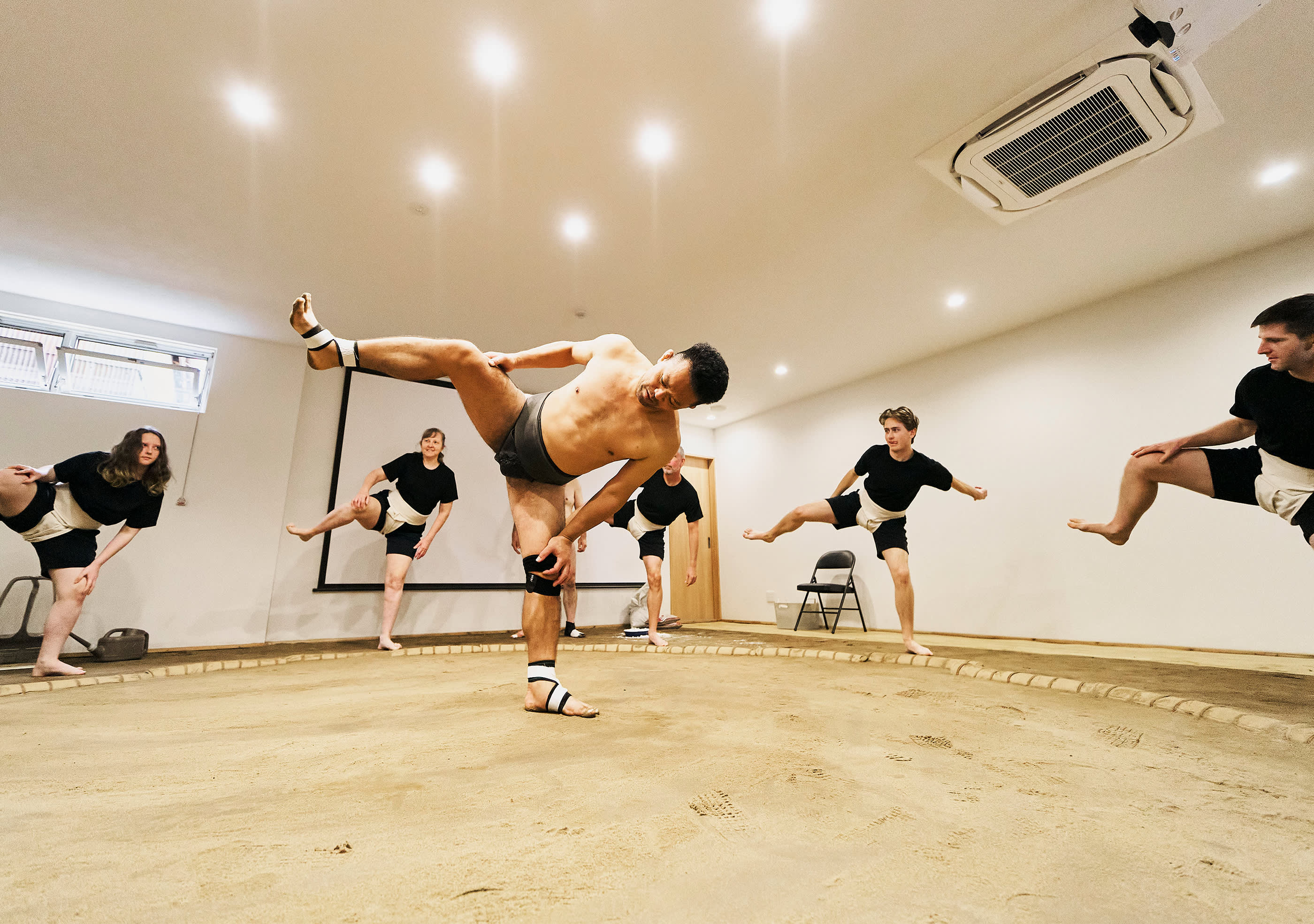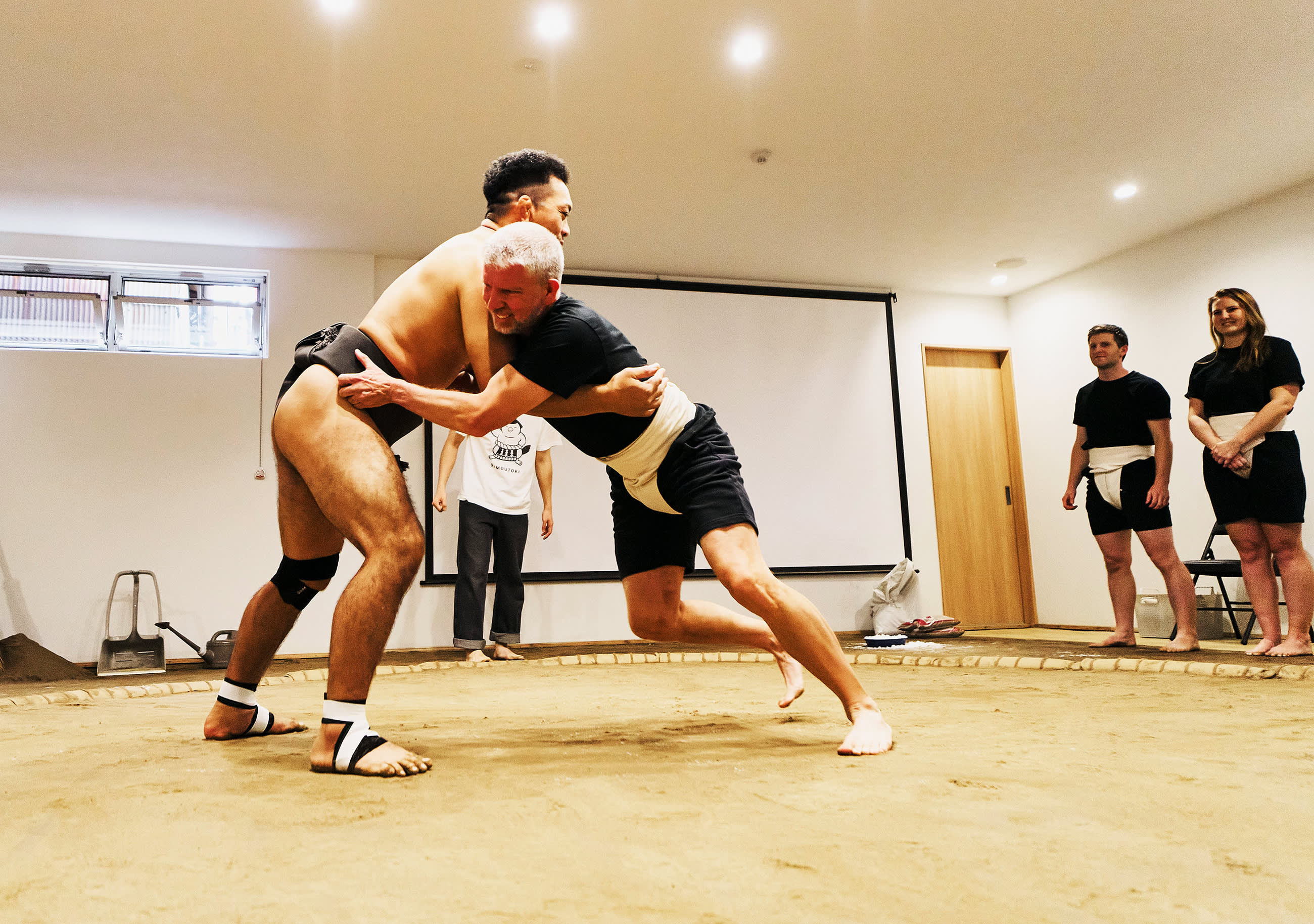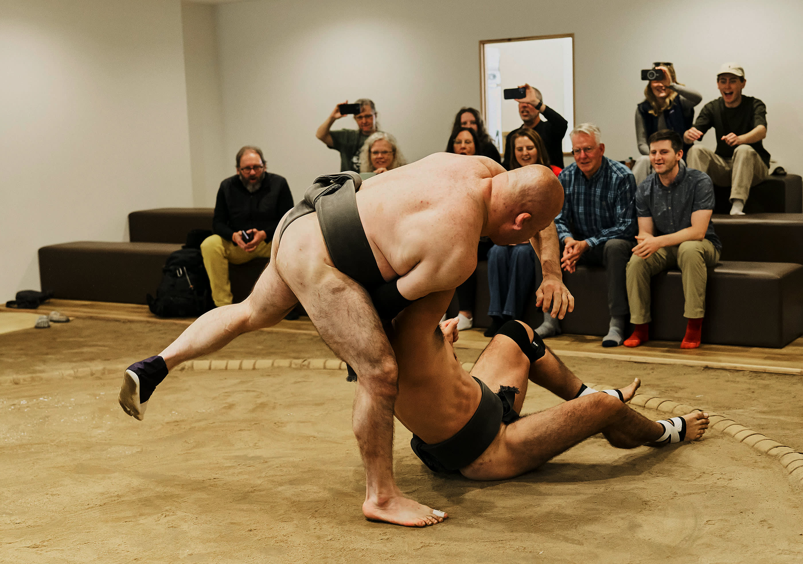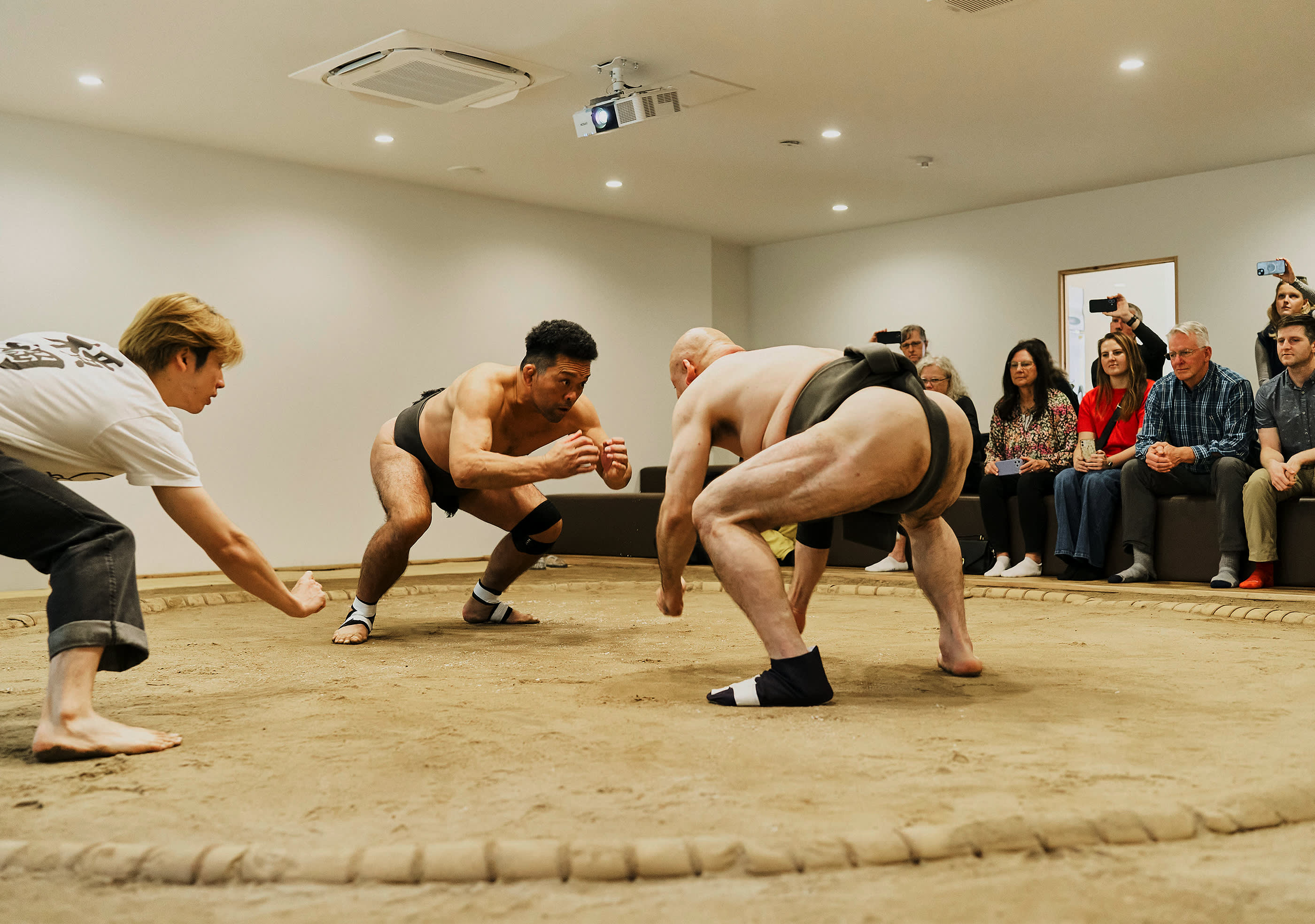 시연 중에는 실제 스모 훈련, 유명한 기술(기마리테), 은퇴한 스모 선수 간의 치열한 1라운드 경기(다치아이)를 볼 수 있습니다. 원하는 분들을 위해 스모 선수에게 직접 도전할 기회도 제공됩니다(제한된 자리만 이용 가능).