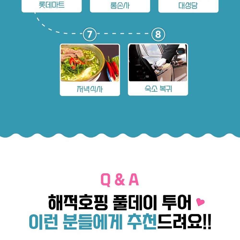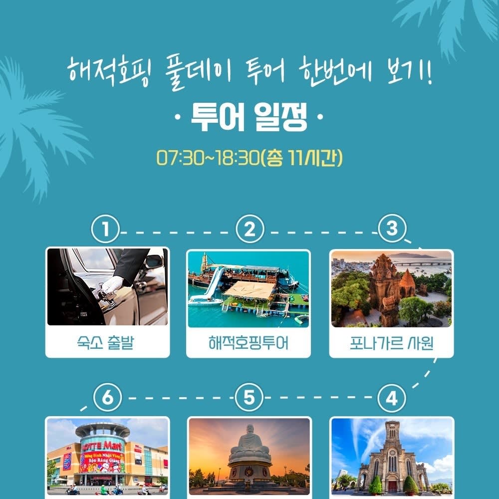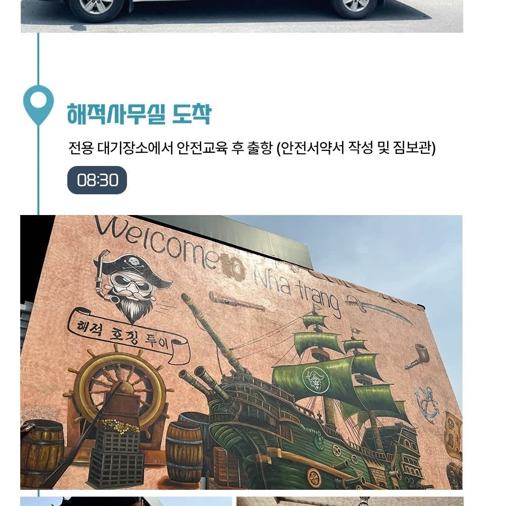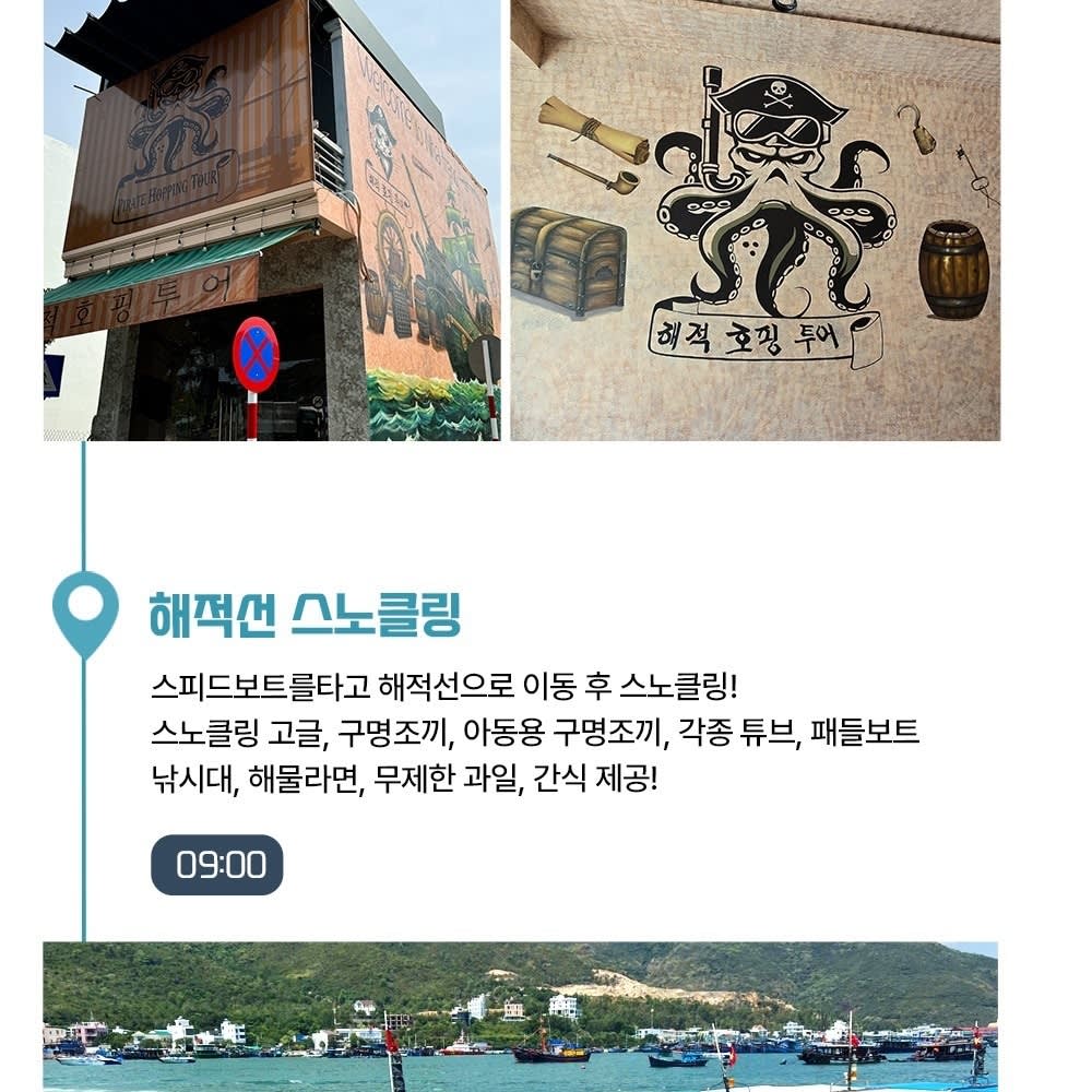 08:30 해적사무실 도착 09:00 🏴☠️ 해적 호핑 투어 (스노클링, 선상 파티, 점심 식사) 11:10 해적 워터밤 12:00 섬 자유시간 (2시간) 15:30 포나가르 사원 (역사 관광) 16:00 나트랑 대성당 16:30 롱손사 17:00 롯데마트 (자유시간 및 쇼핑) & 저녁 식사 (투어에 포함) 18:30 숙소 복귀