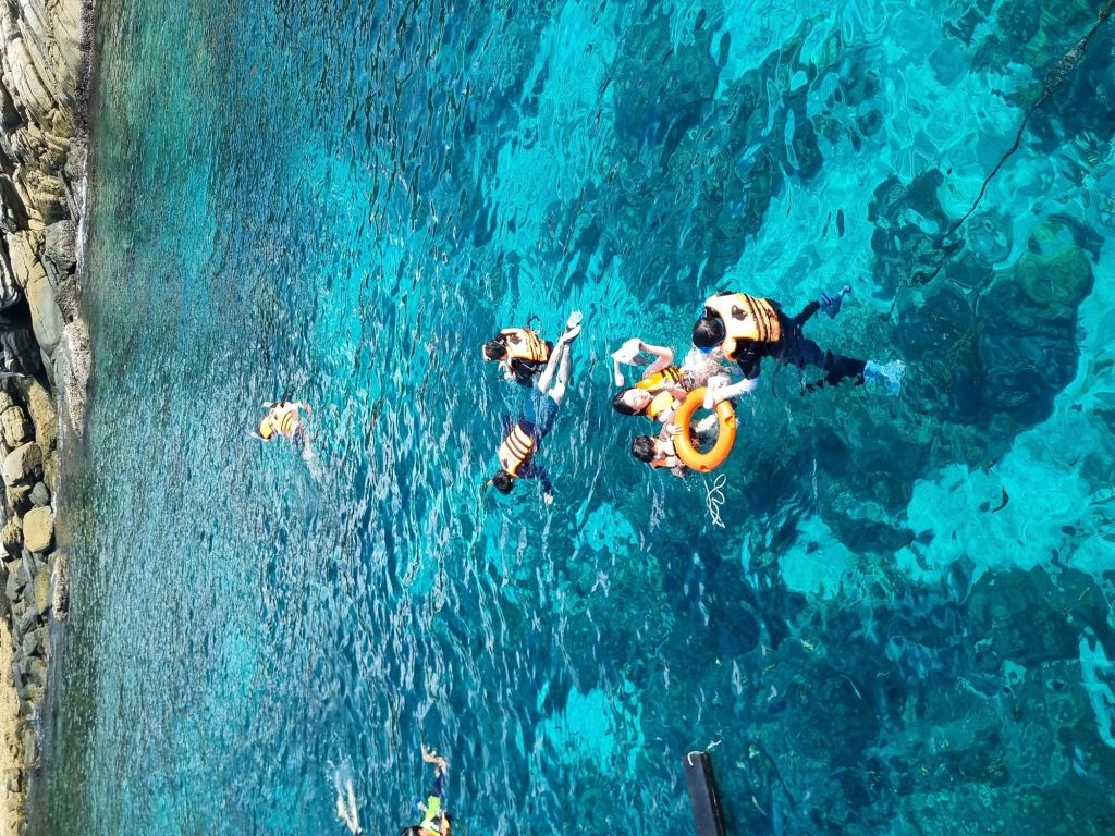 라차성 스노클링 포인트에서 스노클링 및 체험 다이빙을 함께 진행합니다. 체험 다이빙은 수심 약 5-7M이며, 참여자 2~3인당 강사 1인이 함께 동행합니다.