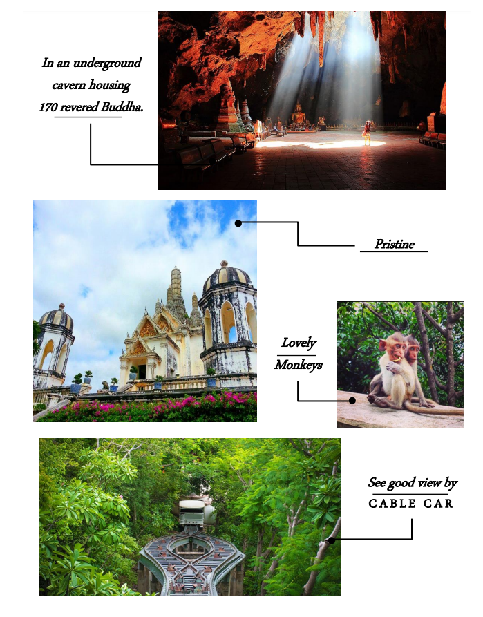 * 태국에서 역사적 중요하고 건축적 아름다움으로 유명한 도시!! 가장 오래된 도시 중 하나인 펫차부리 투어예요. 태국 펫차부리 도시가 내려다보이는 언덕에 있는 프라 나콘 키리 역사 공원 (Phra Nakhon Khiri Historical Park)과 라마 5세의 여름 궁전을 방문할 수 있어요. 또한 아유타야와 초기 라타나코신 양식이 반영된 왓 마하탓 와라위한 (Wat Mahathat Worawihan) 사원과 동굴 천장의 구멍을 통해 햇빛이 스며들어 내부와 부처상을 비추는 탐 카오 루앙 동굴 (Tham Khao Luang Cave)의 자연의 경이로움을 경험할 수 있어요.