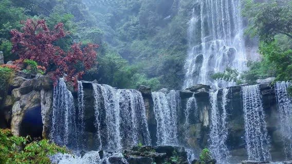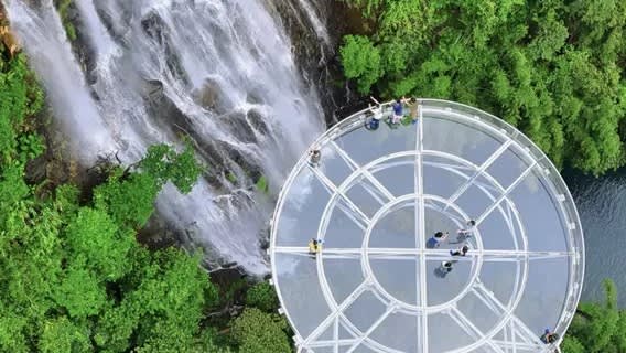 광저우에서 차로 약 1시간 30분 거리에 있는 칭위안 구룡협곡(清远古龙峡)은 운천유리다리(云天玻霸)와 대폭포군(大瀑布群)을 꼭 체험해 볼 만합니다. 운천유리다리는 유리 플랫폼, 잔도, 현수교를 연결한 복합 경관으로, 530m 상공에 매달려 총 길이가 1,314m에 달하며 '영원한 사랑'이라는 로맨틱한 의미를 담고 있습니다. 다리 표면에 사용된 초백유리는 투광성이 매우 뛰어나 발 아래 협곡 폭포가 훤히 보입니다. 옆에 있는 대폭포군은 천연 에어컨과 같으며, 810m 잔도는 9단 폭포를 따라 건설되어 물보라가 시원하게 쏟아집니다. 현재는 모형 공룡도 추가되어 산책하는 동안 우연히 만날 수 있어 마치 선사시대의 비경에 들어온 듯한 느낌을 주며 공기 중에는 음이온이 가득합니다.