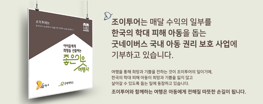 ✔️ 조이투어는 매달 수익의 일부를 한국의 학대 피해 아동을 돕는 국내 아동 권리 보호사업에 기부하고 있습니다.
