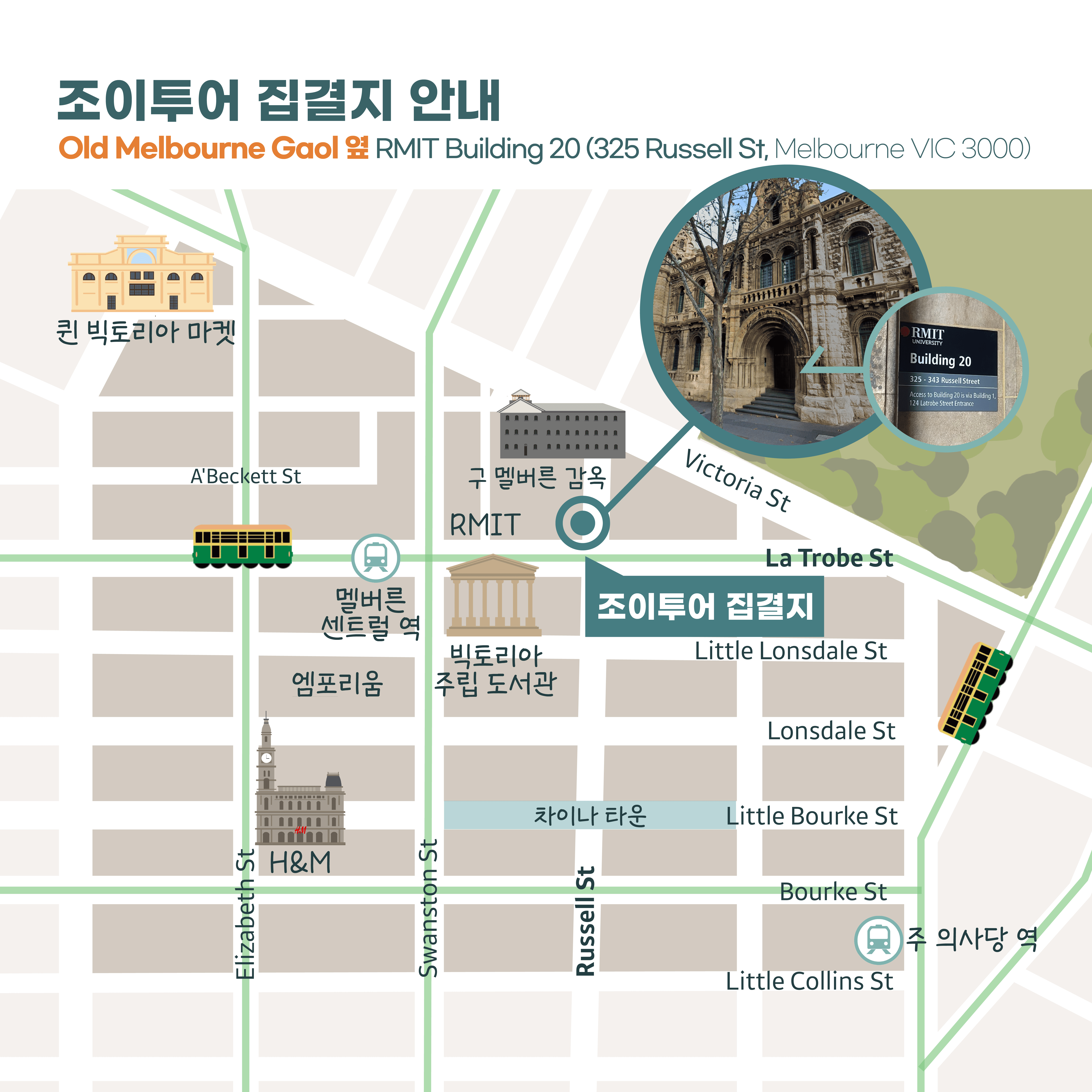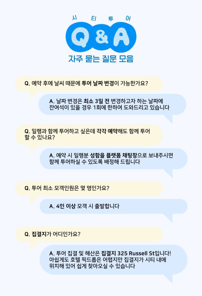 ✅ 예약 관련 안내 - 예약 시 “호주에서 연락 가능하거나 카톡 알림 수신이 가능한 번호”를 반드시 기재해 주세요. - 예약 확정 안내를 받기 전까지는 미확정 상태이며, 투어 참여가 불가합니다. - 투어 1~2일 전 리마인드 알림톡이 예약 시 기재하신 연락처로 발송됩니다. 현지 사정에 따라 집결 시간이 변경될 수 있으므로, 반드시 해당 안내 기준으로 최종 시간을 확인해 주세요. 알림 수신 문제로 인한 지각·불참 및 불이익은 환불 및 보상되지 않습니다. - 최소 모객 인원 미달 시 투어가 취소될 수 있습니다. - 예약 확정 즉시 티켓, 가이드, 차량 등이 배정되어 투어 준비가 진행됩니다. 따라서 예약 확정 후 변경·취소·환불 시에는 예외없이 규정에 따라 취소 수수료(현지 예약금)가 발생하니 신중히 예약해 주세요. - 날짜 변경은 투어일 최소 10일 전(영업일 기준)까지 요청 가능하며, 잔여석이 있을 경우 1회에 한해 변경이 허용됩니다. 이후 재변경 및 취소·환불은 불가합니다. - 예약 및 문의 응대는 평일 09:00~17:00(호주 현지 시간 기준)에 운영하며, 주말 및 현지 공휴일은 휴무입니다. 운영시간 외 접수된 요청은 다음 영업일에 순차 처리됩니다. - 원활하고 안전한 여행을 위해 개별 여행자 보험 가입을 권장드립니다. ✅ 투어 관련 안내 - 투어는 정시 출발하며, 지각 시 개별 연락 없이 출발합니다. - 호주 내 교통 체증이 잦으므로, 집결 시간 최소 10분 전까지 도착해 주세요. 지각 시 기다리거나 중간 합류는 불가합니다. - 투어 중 발생한 분실, 도난, 상해 등은 고객 책임이며, 당사는 이에 대한 법적 책임을 지지 않습니다. - 기상 또는 현지 사정에 따라 일정 일부 또는 투어 시간이 변경될 수 있으며, 이로 인한 환불 및 보상은 불가합니다. ✅ 여행지 관련 안내 - 권장 준비물: 모자, 선글라스, 양산 또는 우산, 운동화, 휴대용 충전기, 생수 등 - 본 투어는 도보로 진행되므로, 4세 미만 유아는 참여가 어렵습니다. 또한 유모차 동반은 불가하오니 양해 부탁드립니다.