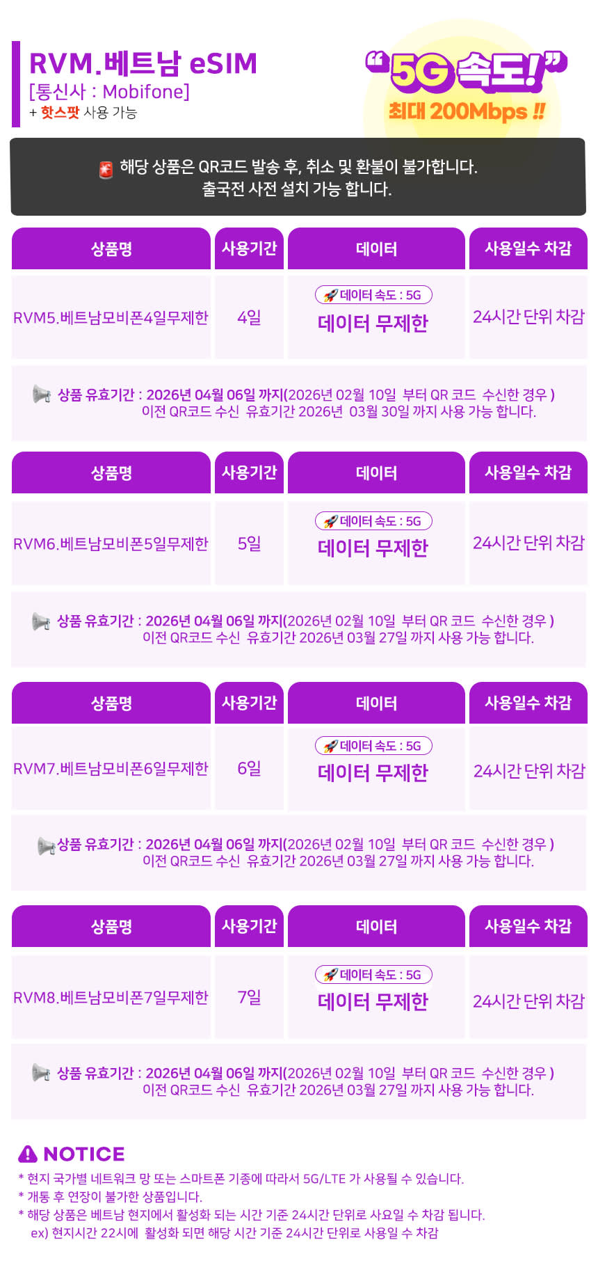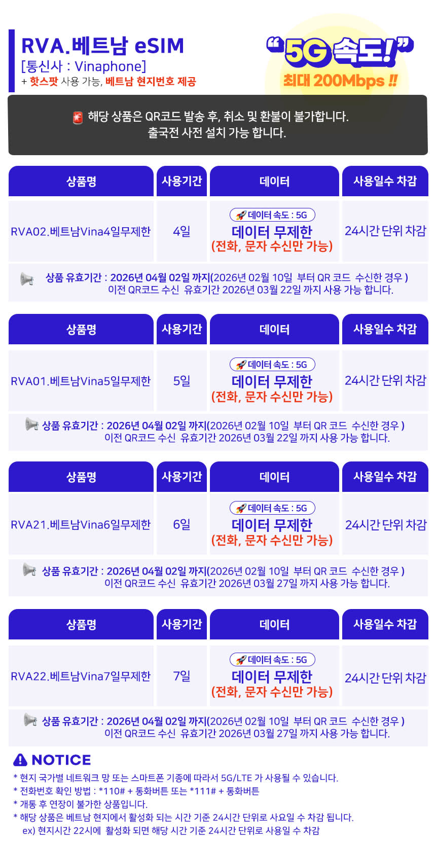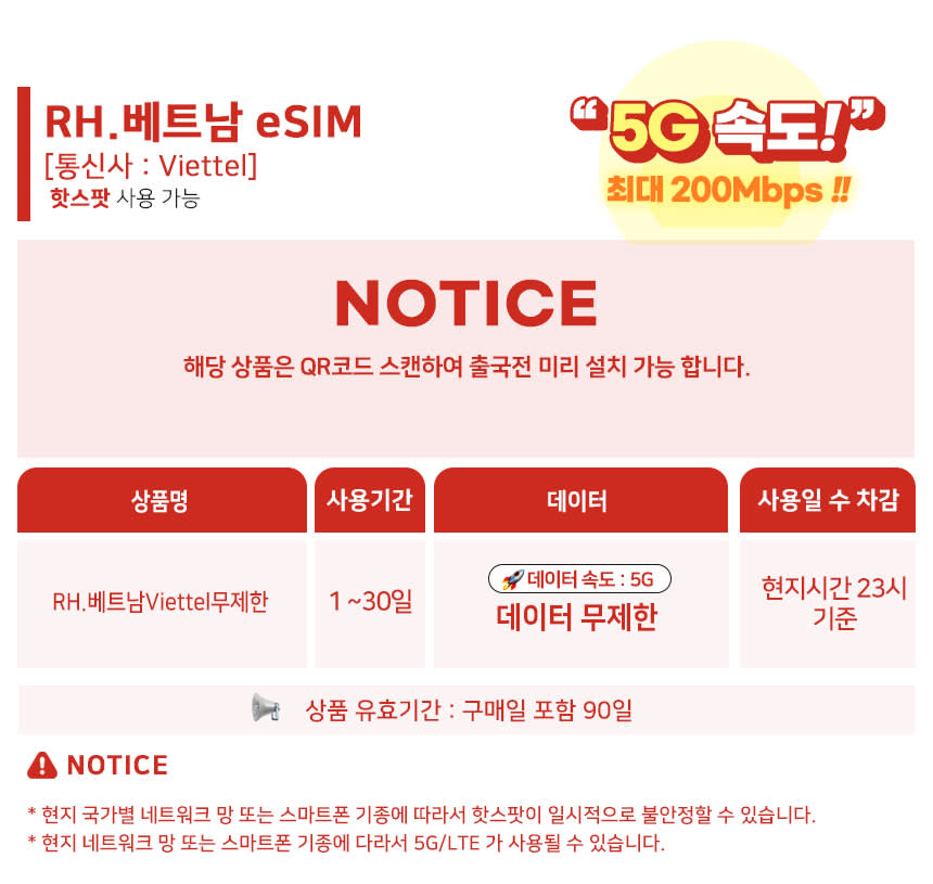 베트남 상품은 베트남 전지역(하롱베이 제외) 사용 가능 합니다. 하롱베이는 Viettel 상품만 가능 합니다. 구매하실 품은 상세내역에 있는 유효기간을 꼭 확인 해주세요 베트남 비나폰 (RVA) eSIM과 베트남 모비폰(RVM) eSIM은 QR코드 발송 후 취소가 불가 합니다. 구매 후 최초 발송되는 알림톡 확인 후 문제 없다고 판단 되시면 알림톡 하단의 QR코드 받기 버튼 눌러주세요 5분내로 알림톡 발송 됩니다. QR코드는 1개씩 구매한 수량 만큼 발송 됩니다. 베트남 Viettel eSIM은 QR코드 스캔(eSIM장착) 하지 않으면 취소 가능 합니다.