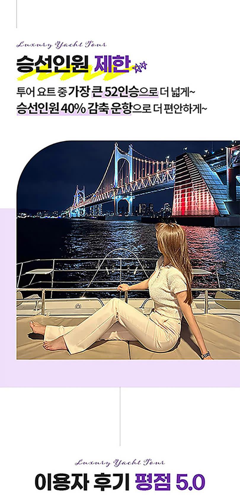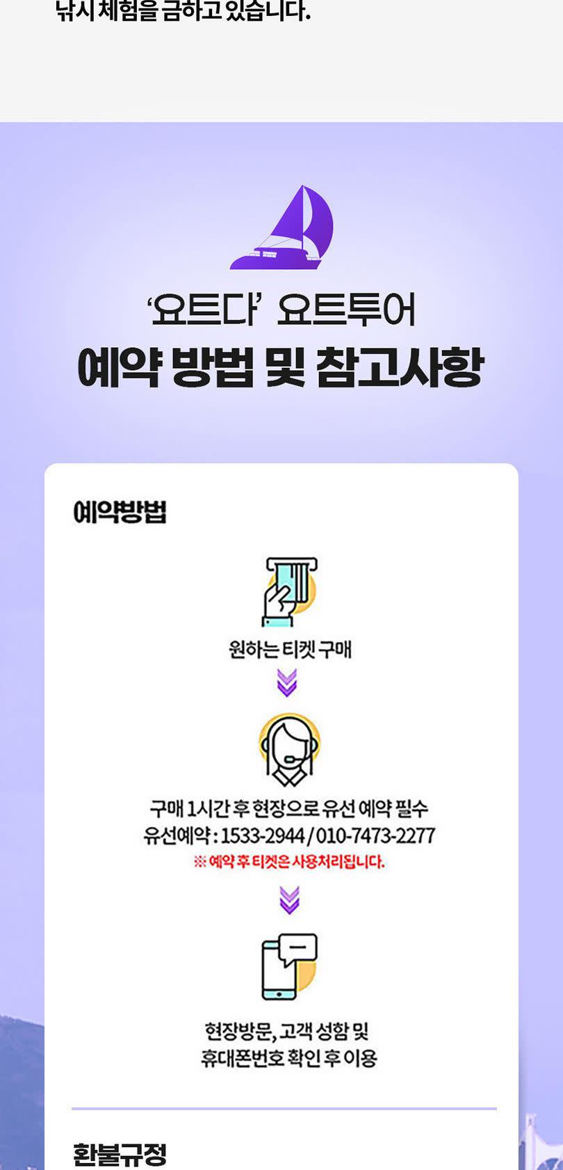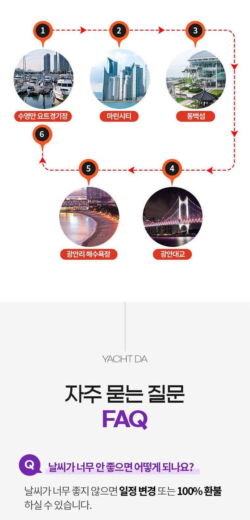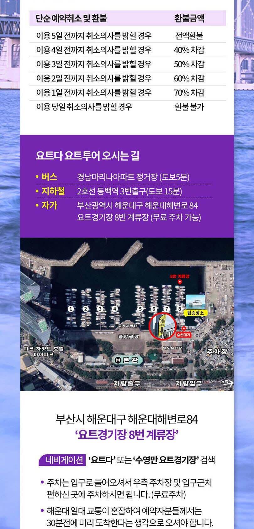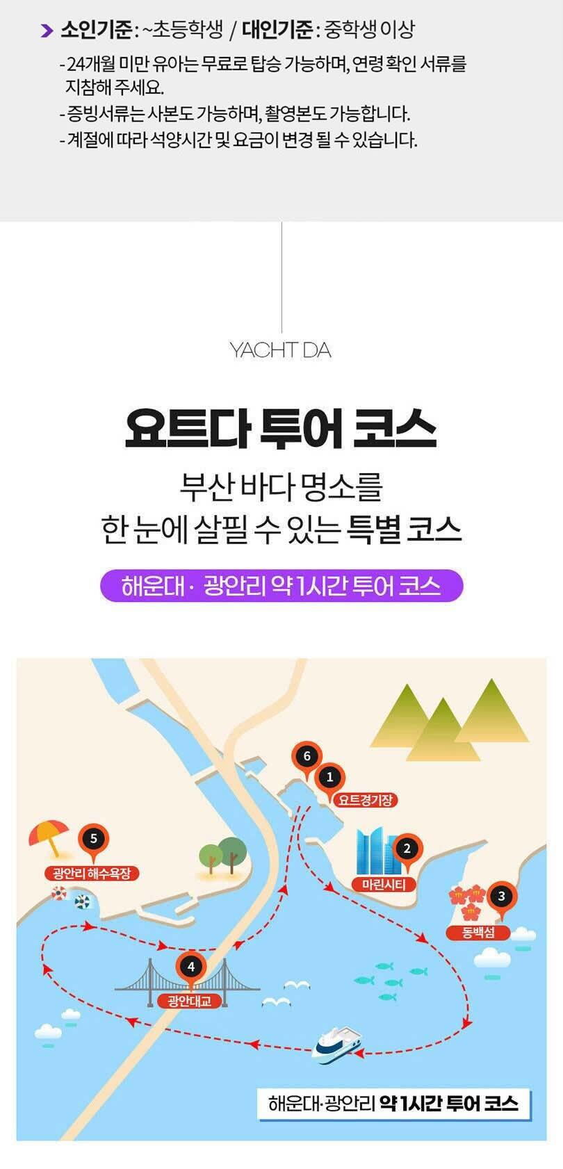 [이용 정보] * 판매기간 : ~ 2026.12.31 * 유효기간 : ~ 2026.12.31 [사용 방법] * 해운대 일대 교통이 혼잡하여 예약자분들께서는 30분전에 미리 도착하신다는 생각으로 오셔야 합니다. * 수영만요트경기장 내 요트투어 업체가 많으니 유의하시길 바랍니다. * 당일 노쇼 및 지각시 환불이나 일정 변경은 절대 불가하니 꼭 ! 유의해 주시길 바랍니다. [오시는 길] * 요트경기장 8번 계류장 입니다. * 본관을 기준으로 정면 국기게양대(요트계류장)을 바라보고 우측(광안리방향)으로 * 약 5분정도 걸어오시면 (장애인 역도 훈련장)이 있습니다. * (역도 훈련장)에서 요트 계류장을 바라보면 8번 계류장 출입문이 보입니다. * 8번 계류장 입구에서 대기 부탁드립니다. [이용방법] * 1. 원하는 티켓 구매 * 2. 구매 1시간 후 현장으로 유선 예약 필수 * 유선예약 : 1533-2944 / 010-9883-3333 - ※ 예약 후 티켓은 사용처리됩니다. - ※ 현장 예약 현황에 따라서 원하시는 시간대에 이용이 어려울 수 있어 유선 문의 필수 * 3. 현장방문, 고객 성함 및 휴대폰번호 확인 후 이용