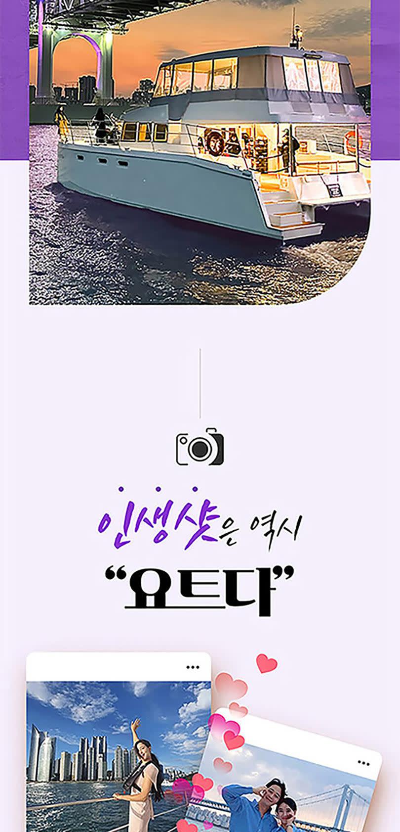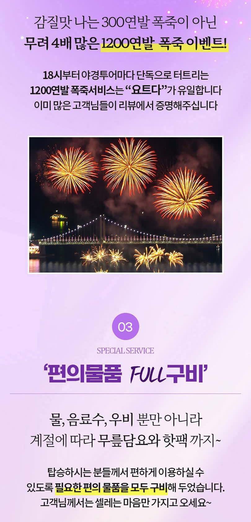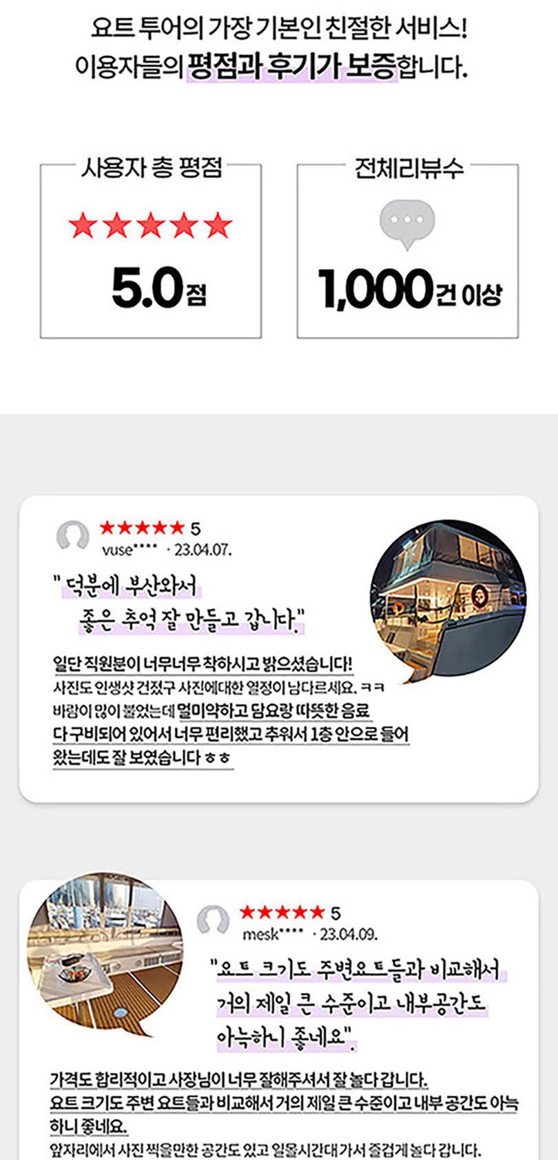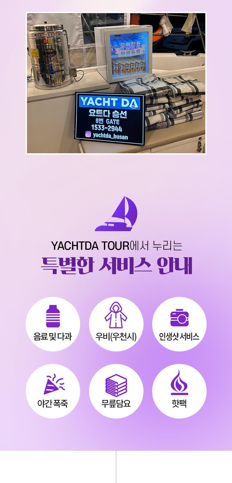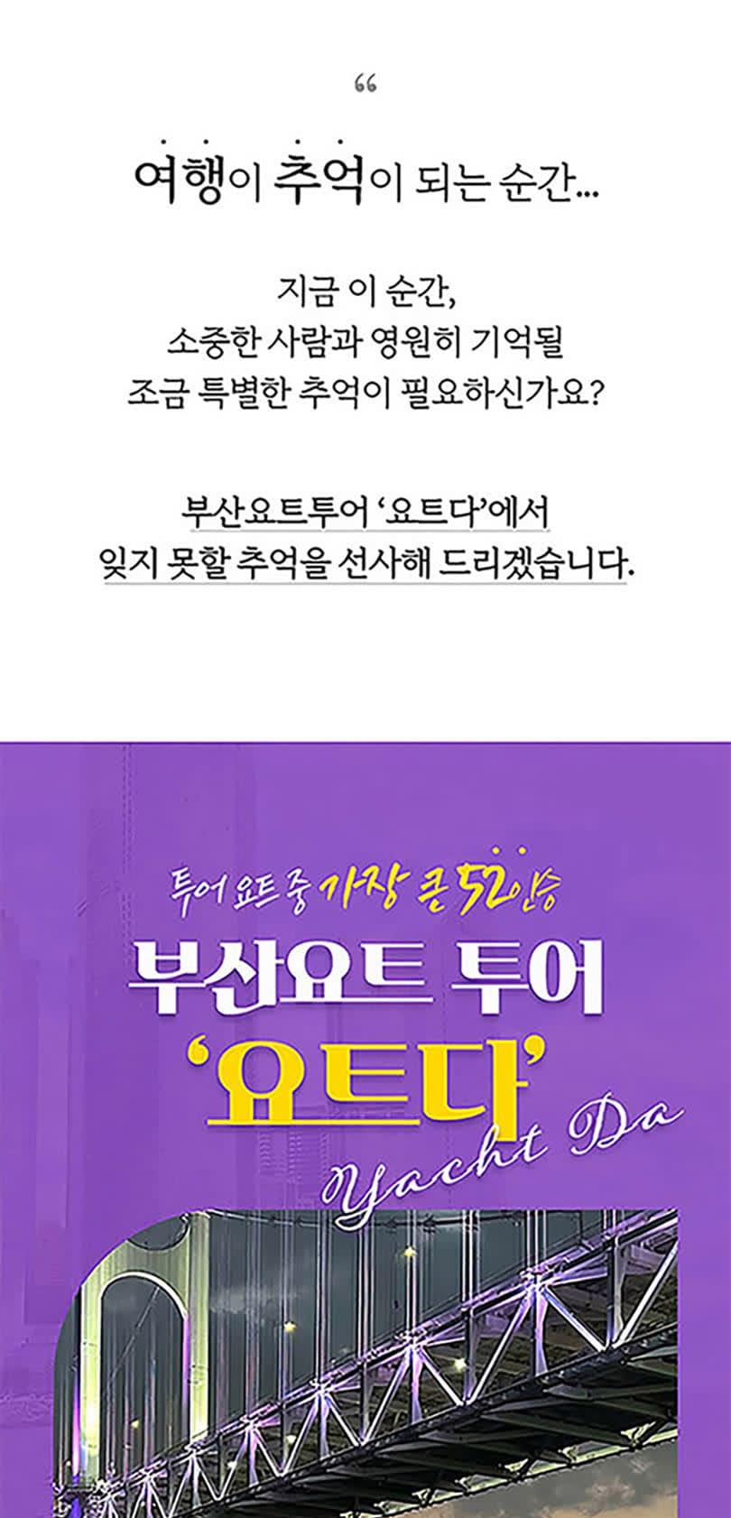 [이용 정보] * 판매기간 : ~ 2026.12.31 * 유효기간 : ~ 2026.12.31 [사용 방법] * 해운대 일대 교통이 혼잡하여 예약자분들께서는 30분전에 미리 도착하신다는 생각으로 오셔야 합니다. * 수영만요트경기장 내 요트투어 업체가 많으니 유의하시길 바랍니다. * 당일 노쇼 및 지각시 환불이나 일정 변경은 절대 불가하니 꼭 ! 유의해 주시길 바랍니다. [오시는 길] * 요트경기장 8번 계류장 입니다. * 본관을 기준으로 정면 국기게양대(요트계류장)을 바라보고 우측(광안리방향)으로 * 약 5분정도 걸어오시면 (장애인 역도 훈련장)이 있습니다. * (역도 훈련장)에서 요트 계류장을 바라보면 8번 계류장 출입문이 보입니다. * 8번 계류장 입구에서 대기 부탁드립니다. [이용방법] * 1. 원하는 티켓 구매 * 2. 구매 1시간 후 현장으로 유선 예약 필수 * 유선예약 : 1533-2944 / 010-9883-3333 - ※ 예약 후 티켓은 사용처리됩니다. - ※ 현장 예약 현황에 따라서 원하시는 시간대에 이용이 어려울 수 있어 유선 문의 필수 * 3. 현장방문, 고객 성함 및 휴대폰번호 확인 후 이용