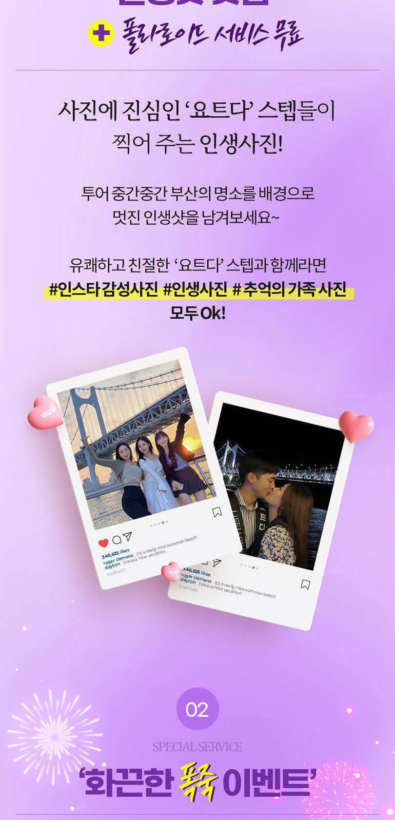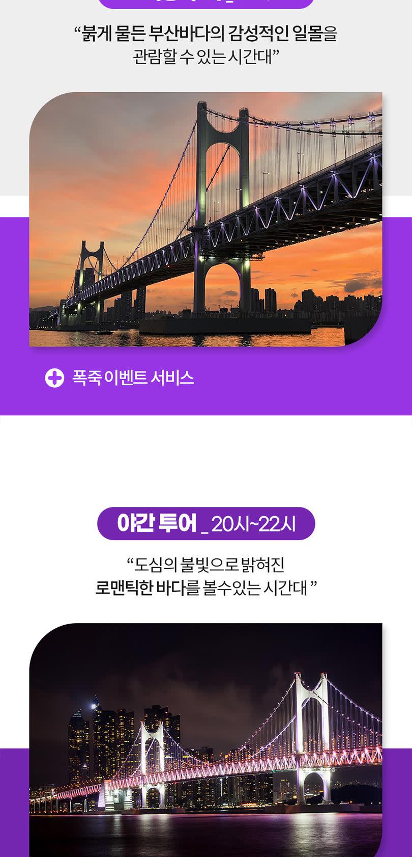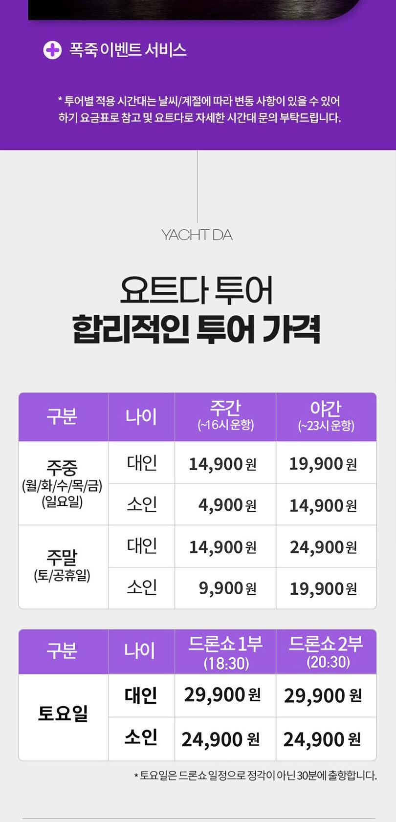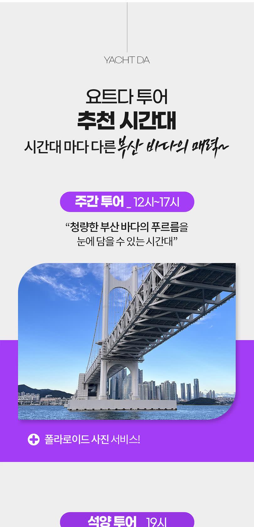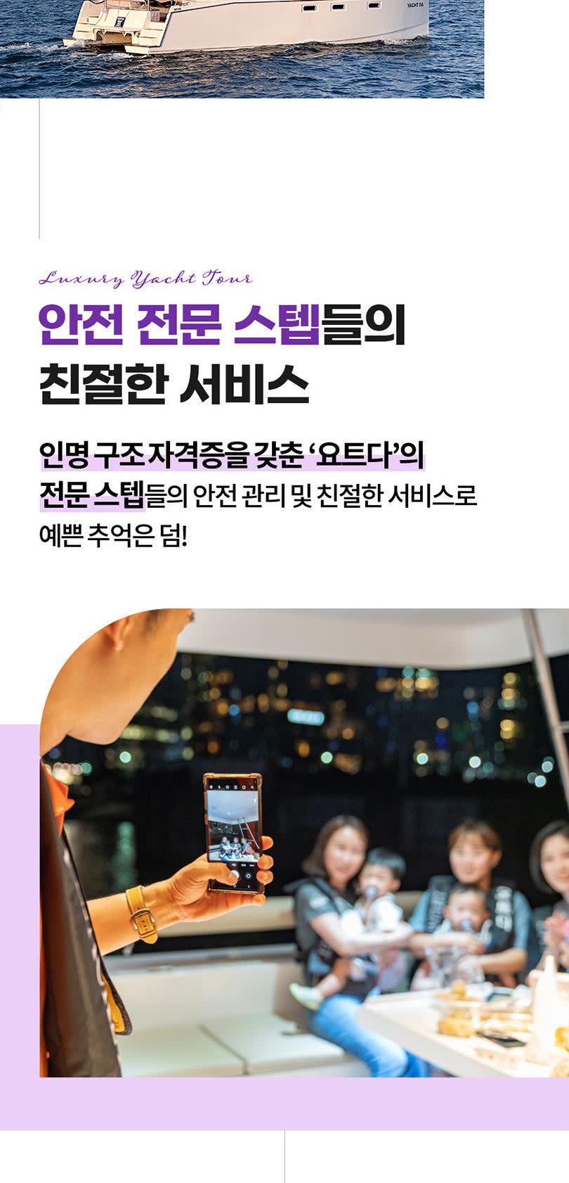 [이용 정보] * 판매기간 : ~ 2026.12.31 * 유효기간 : ~ 2026.12.31 [사용 방법] * 해운대 일대 교통이 혼잡하여 예약자분들께서는 30분전에 미리 도착하신다는 생각으로 오셔야 합니다. * 수영만요트경기장 내 요트투어 업체가 많으니 유의하시길 바랍니다. * 당일 노쇼 및 지각시 환불이나 일정 변경은 절대 불가하니 꼭 ! 유의해 주시길 바랍니다. [오시는 길] * 요트경기장 8번 계류장 입니다. * 본관을 기준으로 정면 국기게양대(요트계류장)을 바라보고 우측(광안리방향)으로 * 약 5분정도 걸어오시면 (장애인 역도 훈련장)이 있습니다. * (역도 훈련장)에서 요트 계류장을 바라보면 8번 계류장 출입문이 보입니다. * 8번 계류장 입구에서 대기 부탁드립니다. [이용방법] * 1. 원하는 티켓 구매 * 2. 구매 1시간 후 현장으로 유선 예약 필수 * 유선예약 : 1533-2944 / 010-9883-3333 - ※ 예약 후 티켓은 사용처리됩니다. - ※ 현장 예약 현황에 따라서 원하시는 시간대에 이용이 어려울 수 있어 유선 문의 필수 * 3. 현장방문, 고객 성함 및 휴대폰번호 확인 후 이용