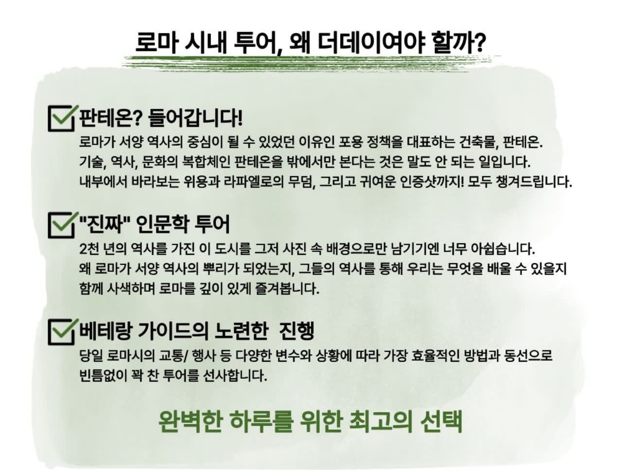 * 고대 로마의 심장부터 바로크 예술까지! 콜로세움, 포로 로마노, 판테온, 트레비 분수 등 핵심 명소를 반나절 만에 전문가이드와 함께 정복하세요