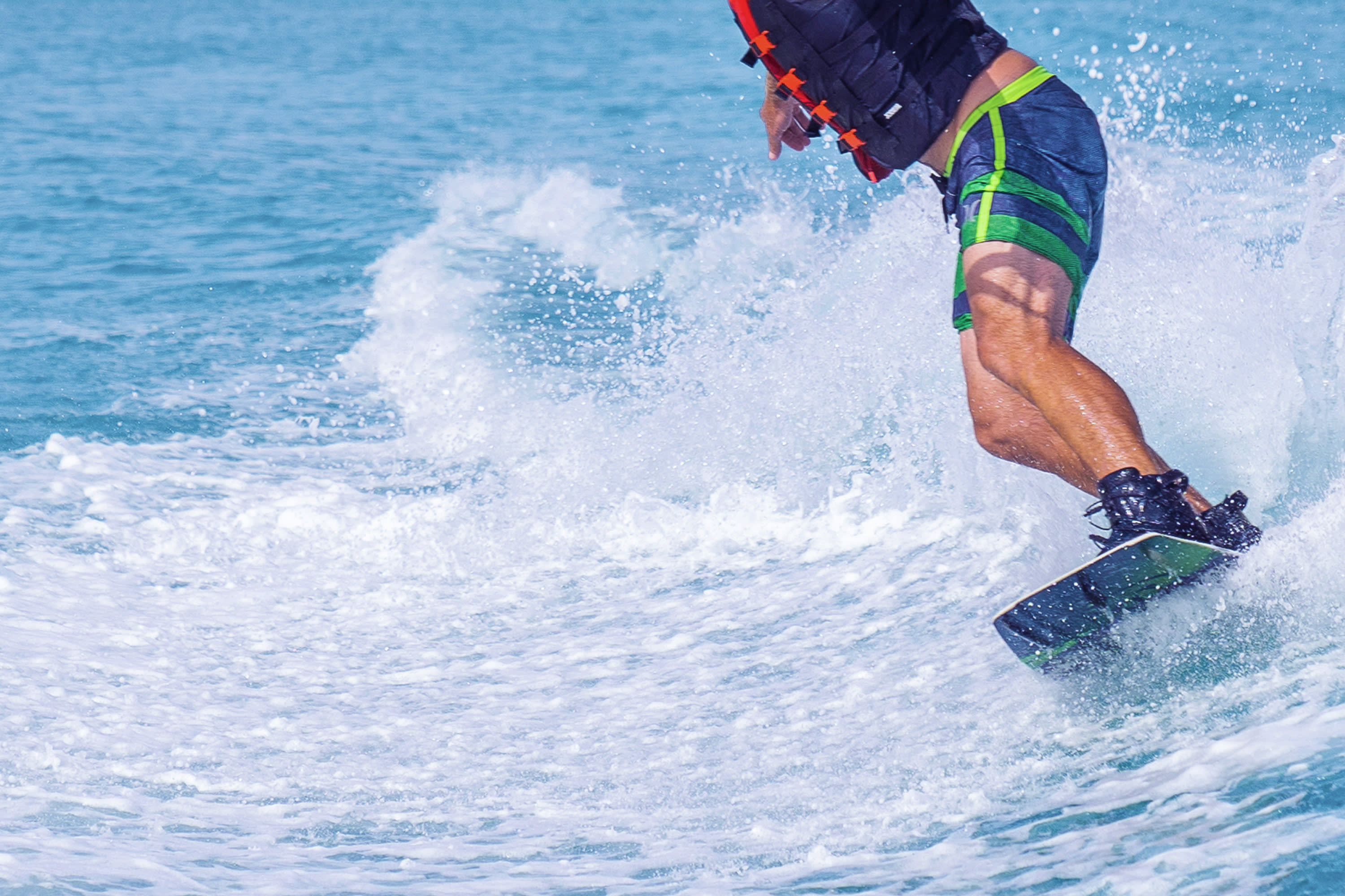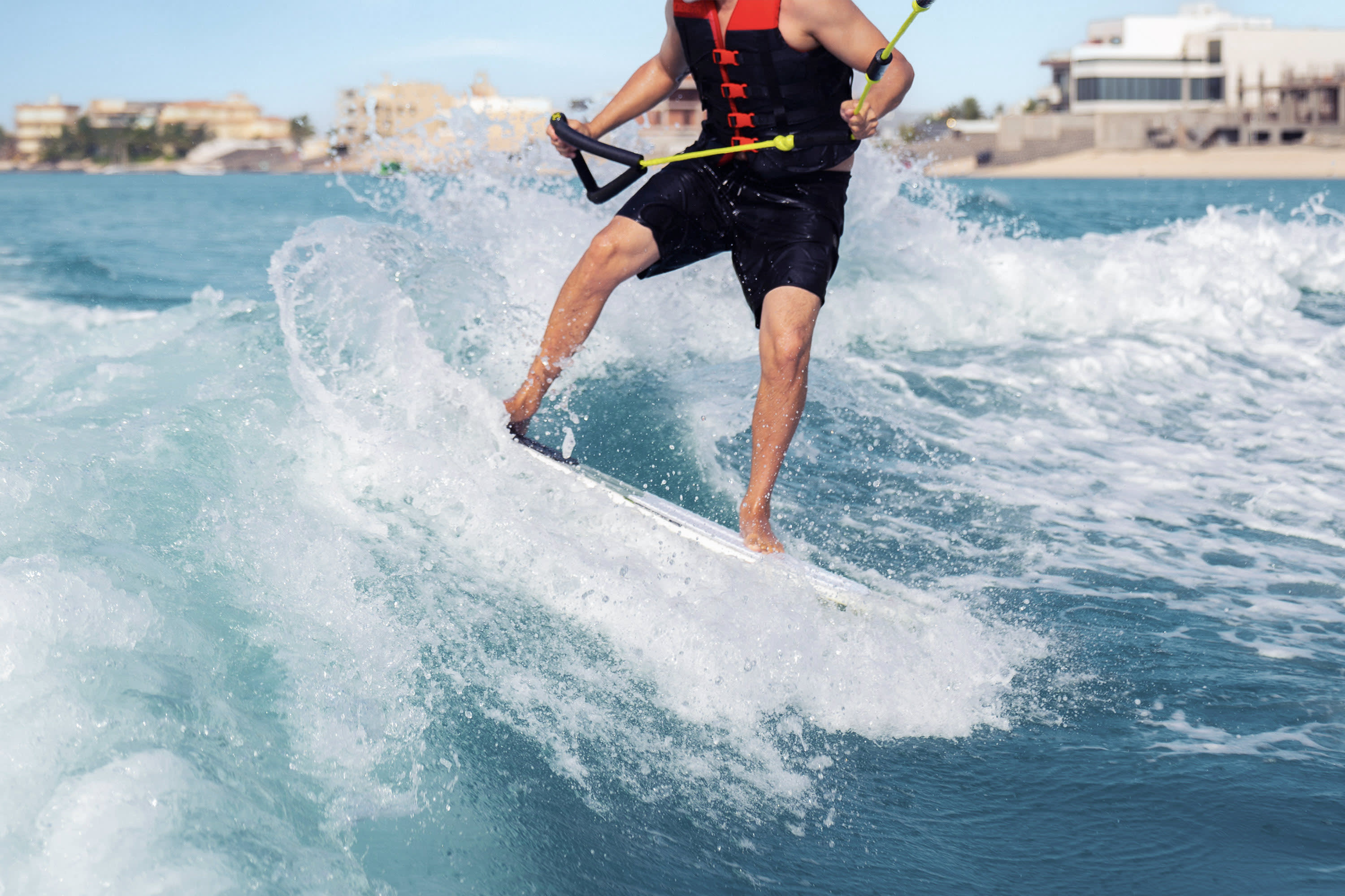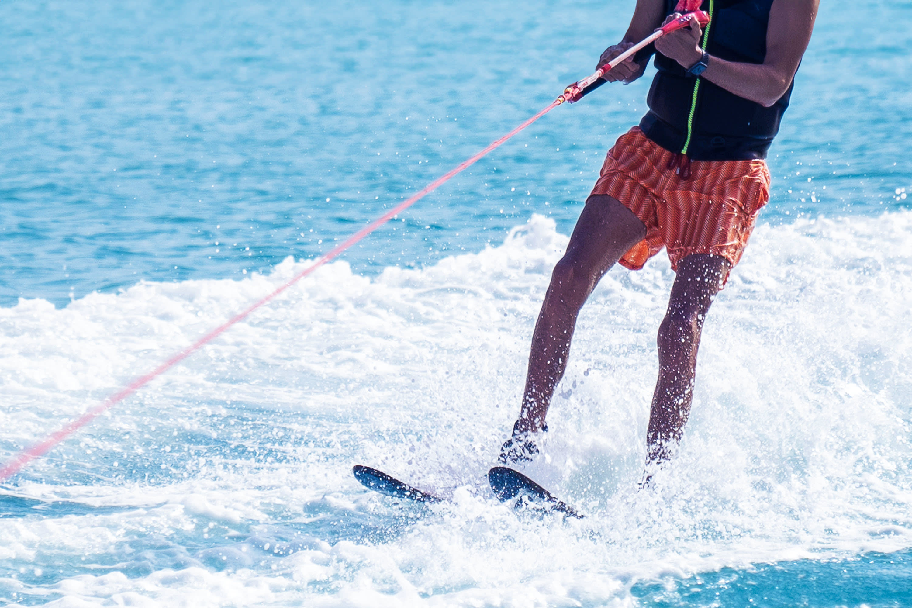 * 보트가 반짝이는 수면 위로 끌어당길 때 서핑보드를 타고 파도를 가르는 스릴을 만끽하세요.