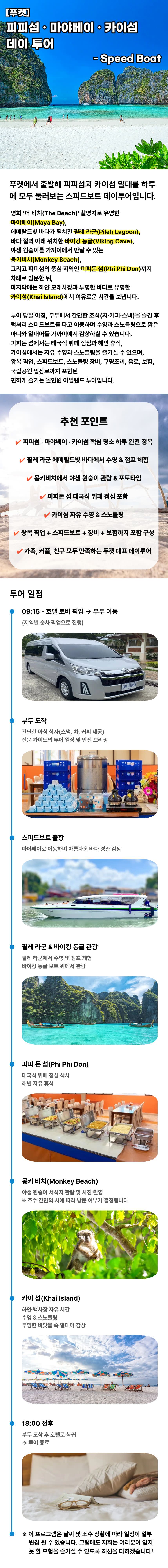 푸켓에서 출발해 피피섬과 카이섬 일대를 하루에 모두 둘러보는 스피드보트 데이투어입니다.