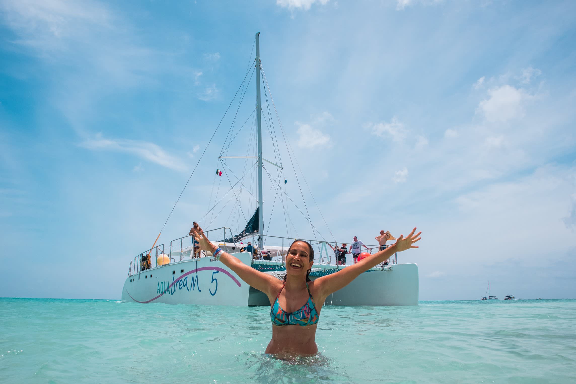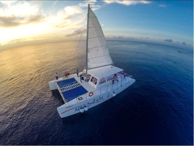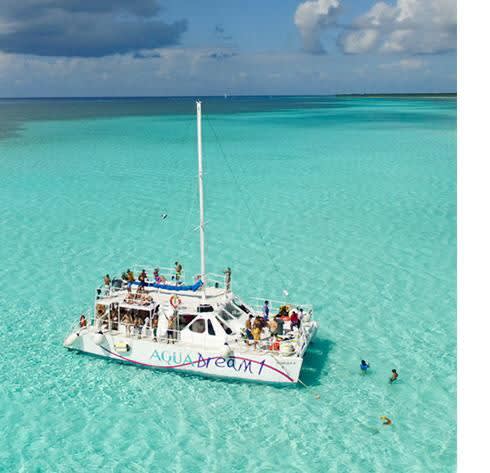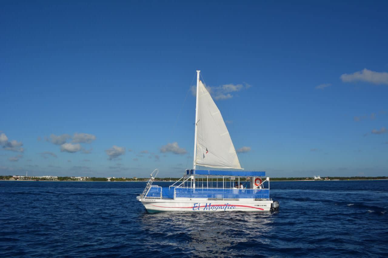 * 아름다운 카타마란을 타고 코수멜의 투명한 바다를 항해하며 음료를 즐겨보세요.