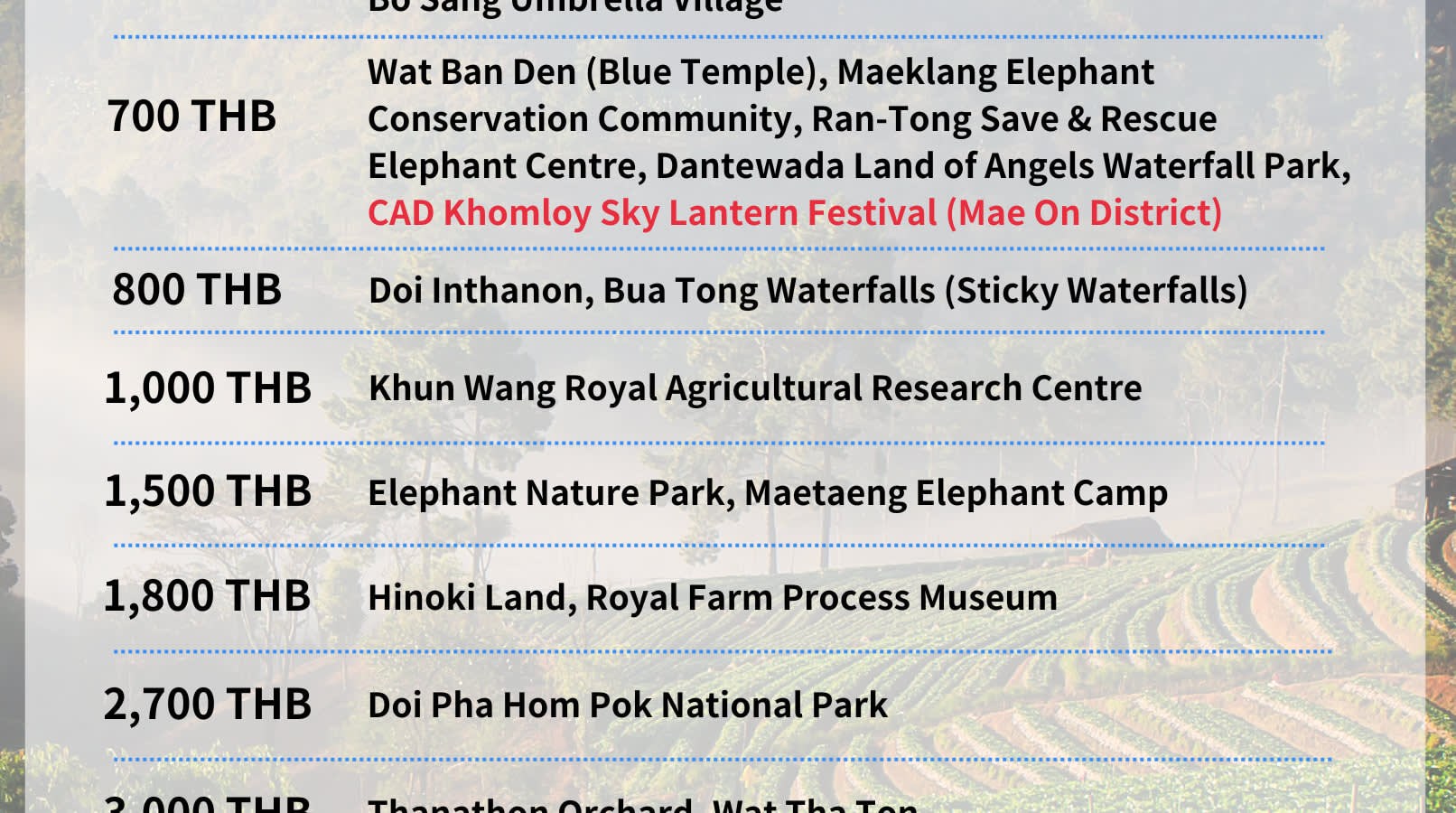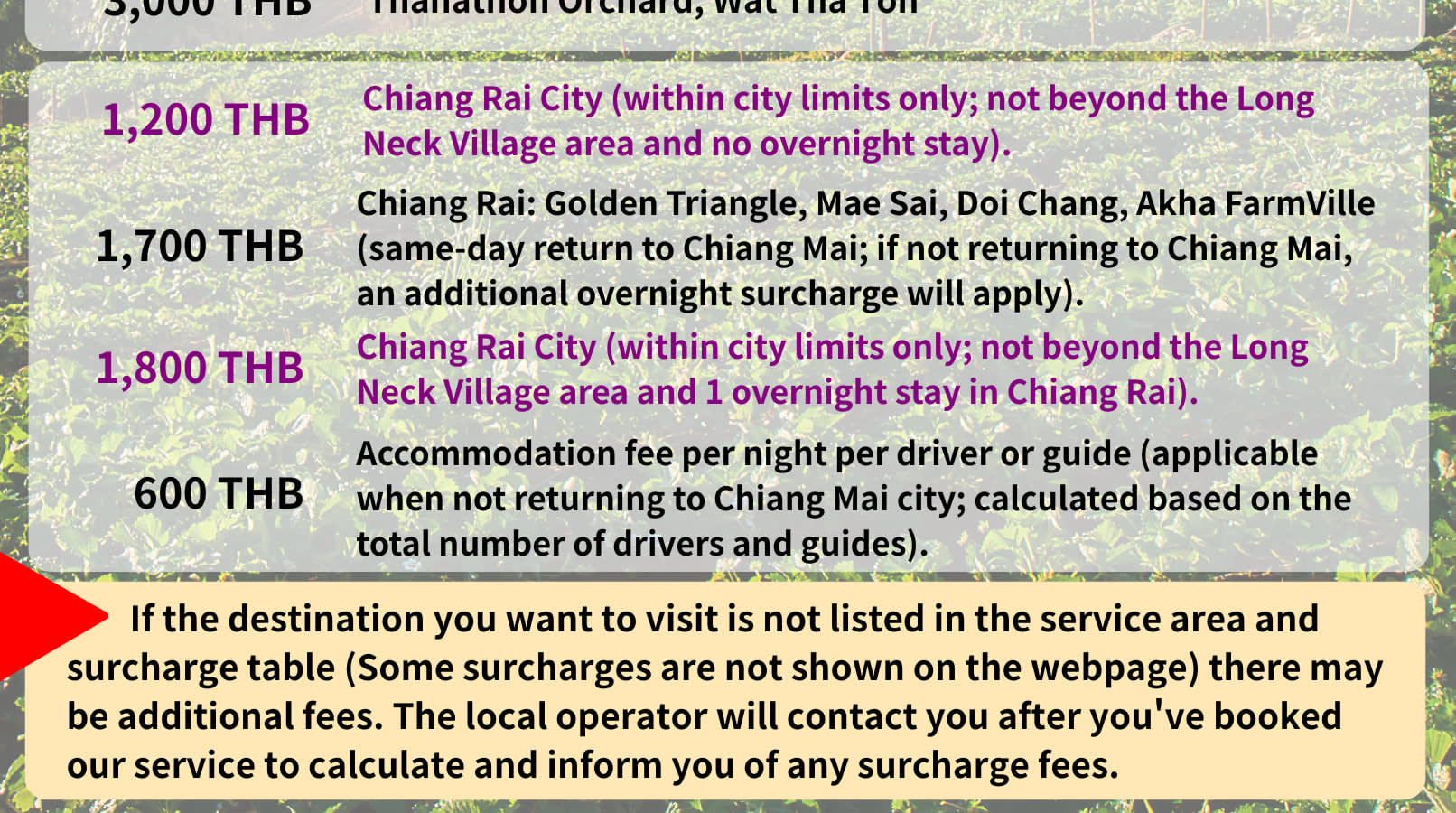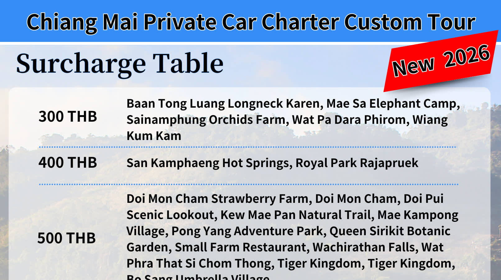 ▶스탠다드 밴 - 이용요건 * 공지: 영유아 및 아동도 탑승객 인원수에 포함되어야 합니다. * 예약당 만 0-6세, 신장 135cm 미만 아동용 카시트 이용 시 1일 1개당 THB350의 추가 요금이 부과됩니다. 결제 페이지에서 필요한 좌석 수를 알려주시면, 담당자가 고객님께 연락하여 아동용 카시트 결제에 대해 안내해 드릴 예정입니다. - 추가정보 * *참고:2026년 11월 23일부터 25일까지 프라이빗 차량 전세 서비스 이용 시 일일 THB 1,500의 추가 요금이 부과됩니다. 예약 후 고객 서비스팀에서 고객에게 연락드릴 예정입니다. * 브로셔는 영어/중국어로 제공됩니다. * 본 공항 이동 서비스는 치앙마이 국제공항(CNX)에서만 이용 가능합니다. * 운전기사는 간단한 영어만 구사할 수 있습니다. 유창한 영어/중국어 구사 능력이 필요하신 경우 가이드 예약 서비스를 이용해주세요. * 치앙마이 시외 지역에서 픽업 서비스를 이용하려면 추가 요금이 부과됩니다. * 본 차량 대절 서비스는 1일 12시간, 23:00 이전에만 유효하며, 운전기사는 1일 12시간 이상 근무할 수 없습니다. * 서비스 시간(12시간)은 예약시 지정하신 픽업 시간을 기준으로 계산됩니다. * 8시간 차량 서비스를 선택하신 경우, 시간이 초과되면 초과 근무 수수료가 부과됩니다. * 가이드 옵션을 추가하신 경우, 해당 가이드가 차량에 함께 탑승하며 추가 탑승객으로 간주됩니다. * 외부 지역 서비스가 필요하신 경우, 예약 완료 후 업체에서 연락을 드릴 것입니다. * 보험 가입을 위해 여행 날짜 전까지 현지 운영업체에 이메일(service@akgotour.com)로 모든 참여자의 영문 성명, 호칭, 국적 및 여권 번호를 제출해주세요. 미제출시 운영업체는 보험 제공을 거부할 권리가 있습니다. * 차량 옵션: * 일반 세단: 승객 2명 + 일반 수하물 2개 또는 수하물 없이 승객 2명 * 일반 밴: 승객 9명 + 표준 수하물 6개 또는수하물 없이 승객 9명 * 일반적인 수하물 사이즈는 24인치입니다. 28인치 이상의 수하물은 2개로 간주됩니다. * 연락처 정보: * WhatsApp/Kakao Talk: +66 63-159-9380 * LINE: @akgotour / WeChat: akhousebkk * 전화: +66 97-117-6137 (CN) / +66 63-159-9380 (EN) * 추가요금표 * 참고 1:모든 추가 요금은 투어 업체에서 결정합니다. 투어 날짜 전에 추가 요금이 발생할 경우, 고객님께 연락드려 결제에 대해 안내해 드릴 예정입니다. 추가 요금은 투어 업체를 통해 지불해 주시기 바랍니다. 단, 초과 근무 수당(발생 시)은 운전기사 및 투어 가이드에게 직접 지불하시면 됩니다. * 참고 2:방문하시려는 목적지가 서비스 지역 및 추가 요금 표에 나와 있지 않은 경우 (일부 추가 요금은 웹페이지에 표시되지 않음) 추가 요금이 발생할 수 있습니다. 현지 업체에서 서비스 예약 후 추가 요금을 계산하여 안내해 드립니다. * 일부 지역에서는 추가 요금이 부과될 수 있습니다. 추가 요금 정보를 반드시 확인하세요. * 300 THB - 반통루앙 카렌족 마을, 매사 코끼리 캠프, 사이남풍 난초 농장, 왓 파 다라피롬, 위앙쿰캄 * THB400 - 싼캄팽 온천, 로열 파크 라차프륵 * 500 THB - 도이 몬 참 딸기 농장, 도이 몬 참, 도이 푸이 전망대, 깨우 매 판 자연 트레일, 매 깜퐁 마을, 퐁 양 어드벤처 파크, 시리킷 여왕 식물원, 스몰 팜 레스토랑, 와치라탄 폭포, 왓 프라 탓 시 촘 통, 타이거 킹덤, 타이거 킹덤, 보상 우산 마을 * 700 THB - 왓 반 덴 (블루 템플), 매클랑 코끼리 보호 커뮤니티, 란통 코끼리 보호 및 구조 센터, 단테와다 천사의 폭포 공원, CAD 콤로이 스카이 랜턴 축제 (매온 지구) * 800 THB - 도이 인타논, 부아 통 폭포 (끈적끈적한 폭포) * 1,000 THB - 쿤 왕 왕립 농업 연구 센터 * THB1,500 - 코끼리 자연 공원, 매 탱 코끼리 캠프 * THB1,800 - 히노키 랜드 & 로열 팜 프로세스 뮤지엄 * 2,700 THB - 도이 파 홈 폭 국립공원 * 3,000 THB - 타나톤 과수원, 왓 타 톤 * 도이뿌이 몽족 마을 (수텝 사원 도착 후 현지 셔틀버스로 환승) * 1,200 THB - 치앙라이 시내 (시내 한정; 롱넥 빌리지 지역을 벗어나지 않으며 숙박 불가). * 1,700 THB - 치앙라이: 골든 트라이앵글, 매사이, 도이창, 아카 팜빌 (당일 치앙마이 복귀; 치앙마이로 돌아가지 않을 경우, 추가 1박 요금이 부과됩니다). * 1,800 THB - 치앙라이 시내 (시내 한정; 롱넥 빌리지 지역을 벗어나지 않으며 치앙라이에서 1박 숙박 포함). * 600 THB - 운전기사 또는 가이드 1인당 1박 숙박비 (치앙마이 시내로 돌아가지 않을 경우 적용되며, 총 운전기사 및 가이드 수에 따라 계산됩니다). * 픽업 장소: 치앙마이 시내 호텔 픽업 * 업체에서 픽업 시간을 이메일로 사전에 다시 확인해 드립니다. (service@akgotour.com)을 확인해 주세요. * 지정된 픽업시간 10분 전까지 호텔 로비에서 대기해주세요. * 결제 페이지에서 영문 숙소명과 주소를 입력해주세요. * 공항 픽업 서비스는 투어 당일에만 이용 가능합니다. * 추가 근무 * 추가 시간: 시간당 300 THB (기사) * 추가 시간: 시간당 300 THB (투어 가이드) * 30분 초과 시 1시간으로 계산되며, 현금으로 직접 지불해 주시기 바랍니다. * 차량 예약이 필수입니다. * 차량 없이 가이드만 예약하는 것은 불가합니다. * 밴 (3-9인 그룹) 옵션: * 가이드 없이 떠나는 여행: 3-9인 고객에게 적합합니다. (최소 3인 이상) * 투어 가이드 동행: 고객 3-9