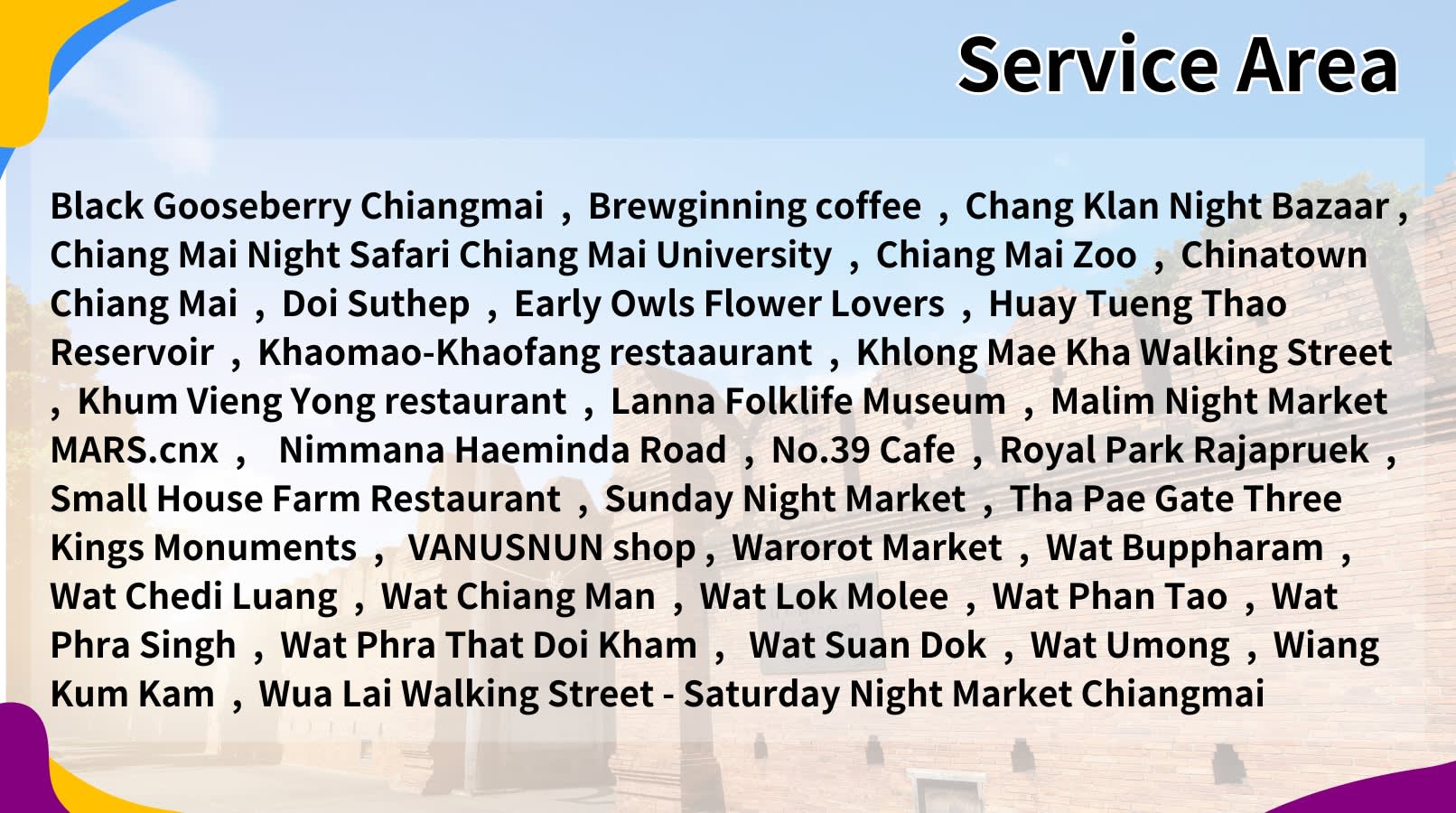 * 중국어와 영어로 제공되는 치앙마이 가이드북으로 여행 계획 시간을 절약하세요.